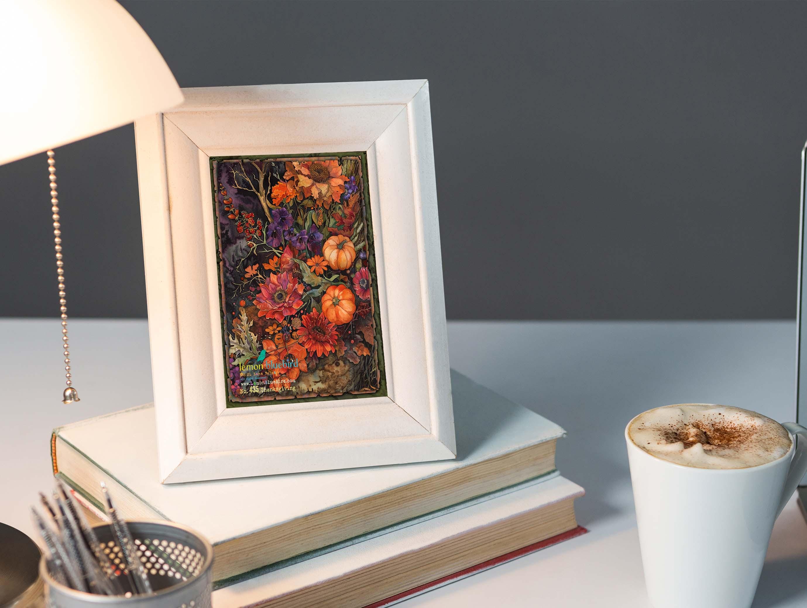 The back side of the card continues the celebration with a seamless cascade of jewel-toned florals and colorful fall leaves wrapping the edges, creating a rich, full-circle design that feels both joyful and refined.