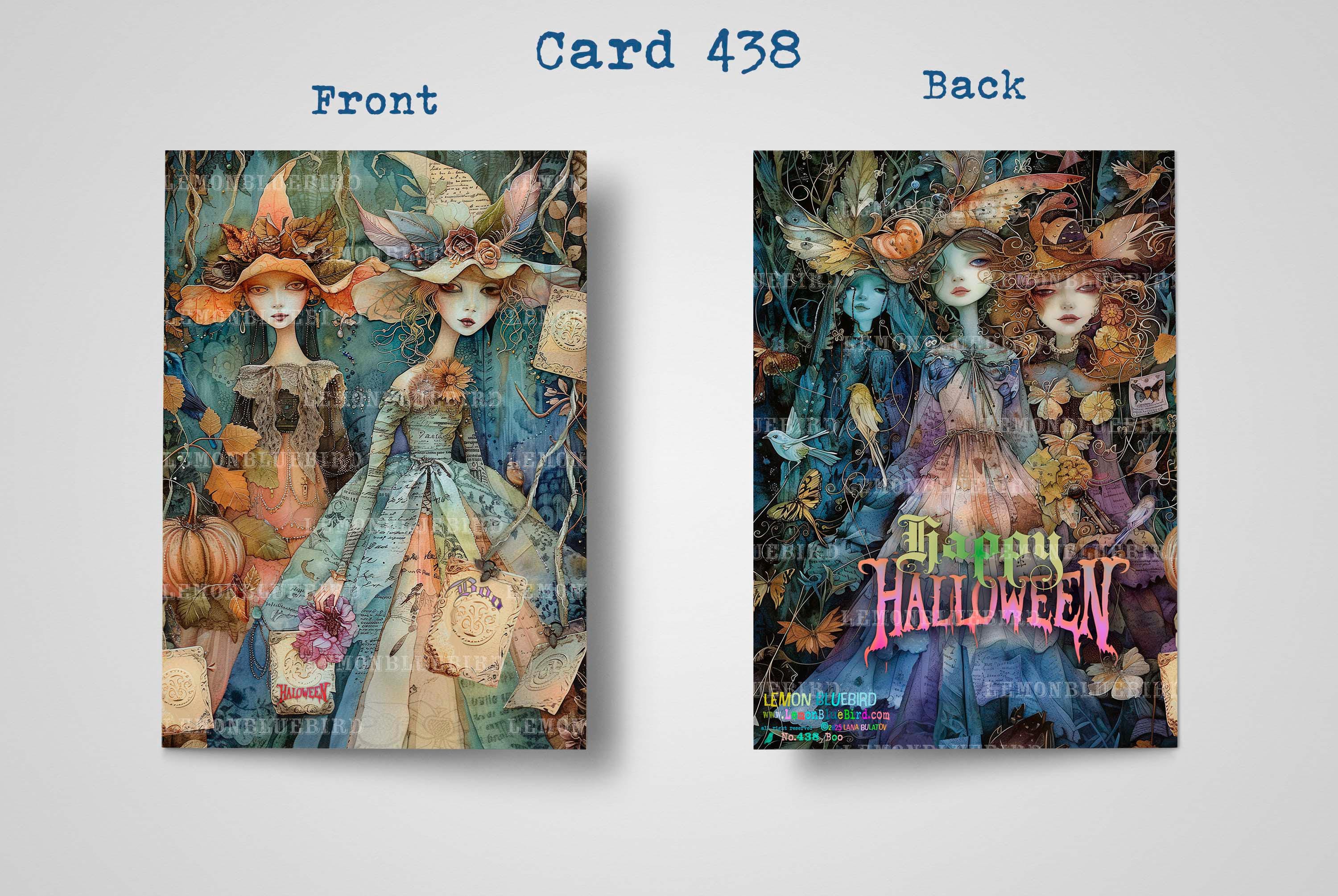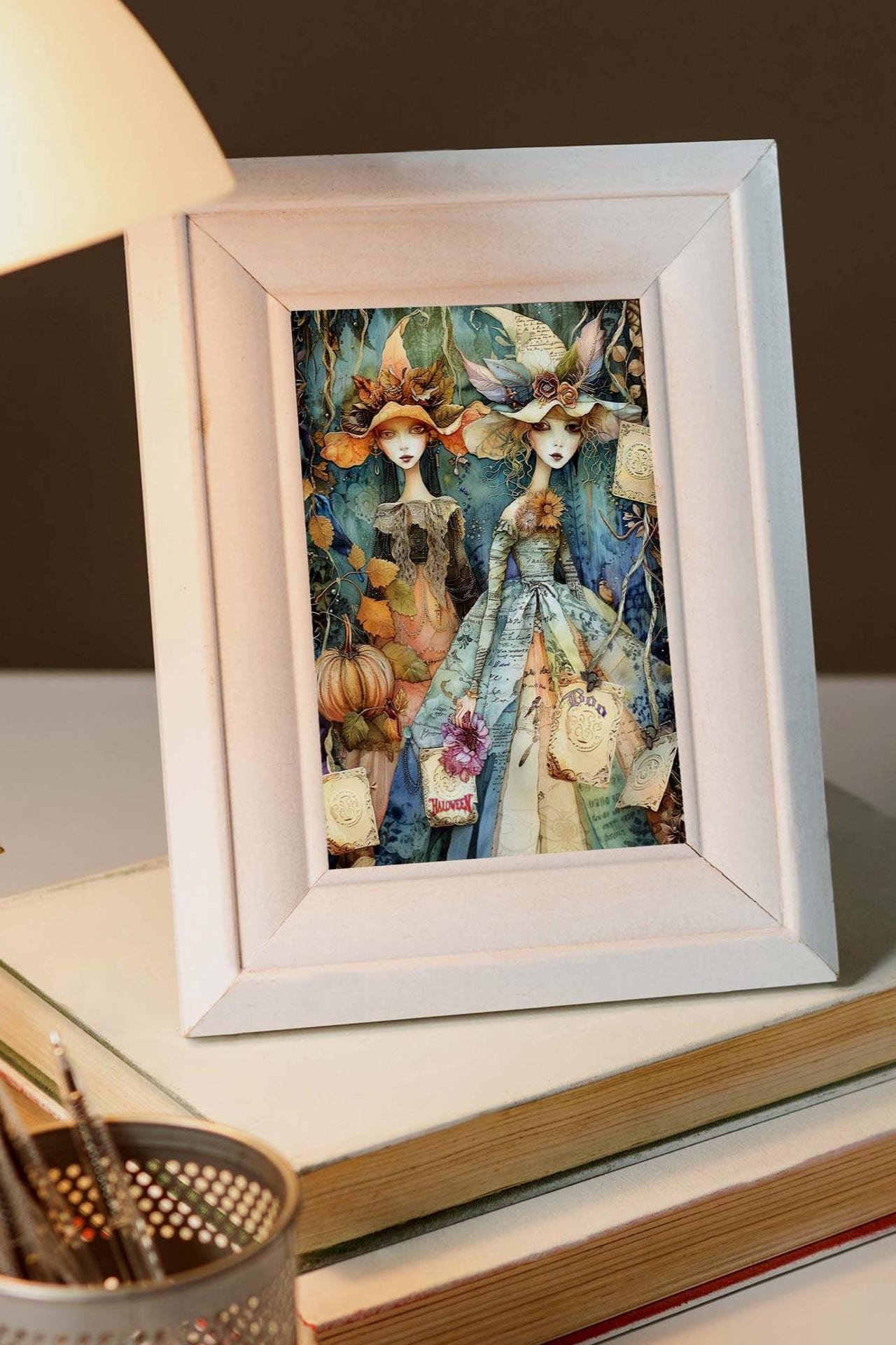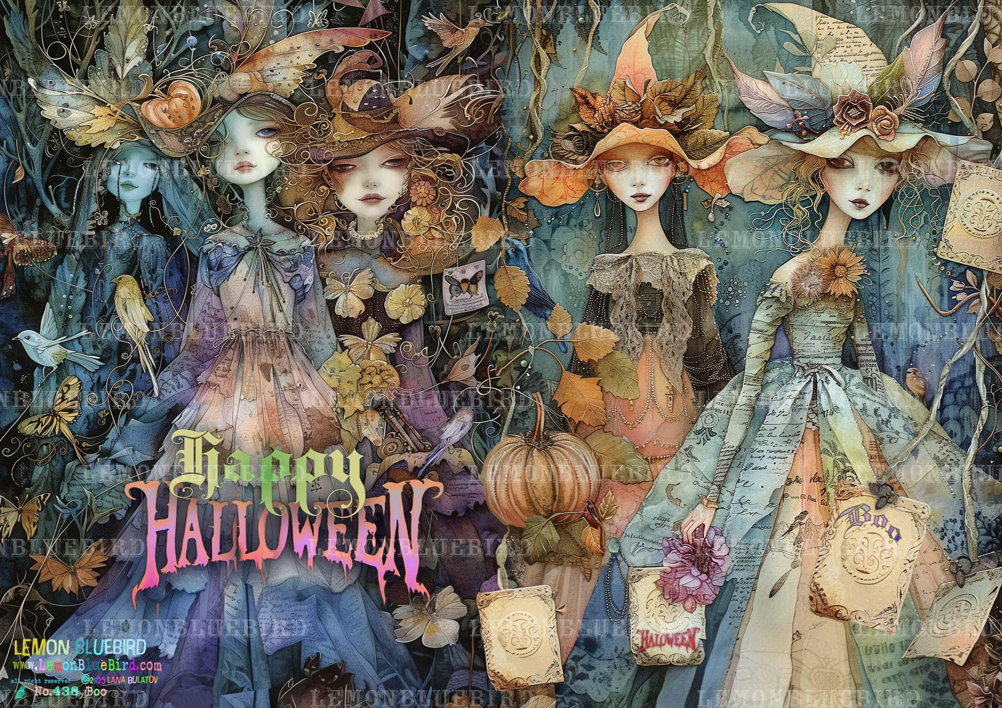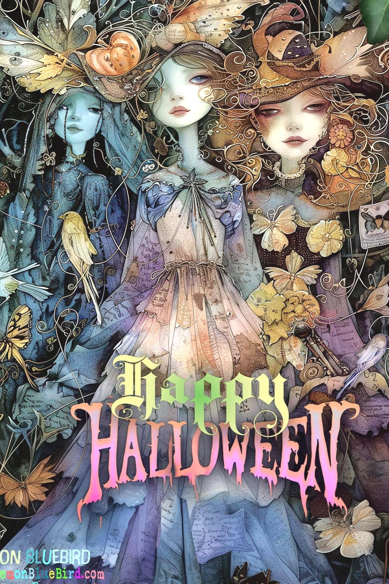 Three more Halloween ladies appear in deeper, duskier tonesโstill pastel but leaning into twilight. Their Renaissance dresses are rich with texture, hair wild with leaves, birds, and tangled foliage. A soft painterly greeting reads โHappy Halloween,โ making this side perfect for invitations or autumn wishes.