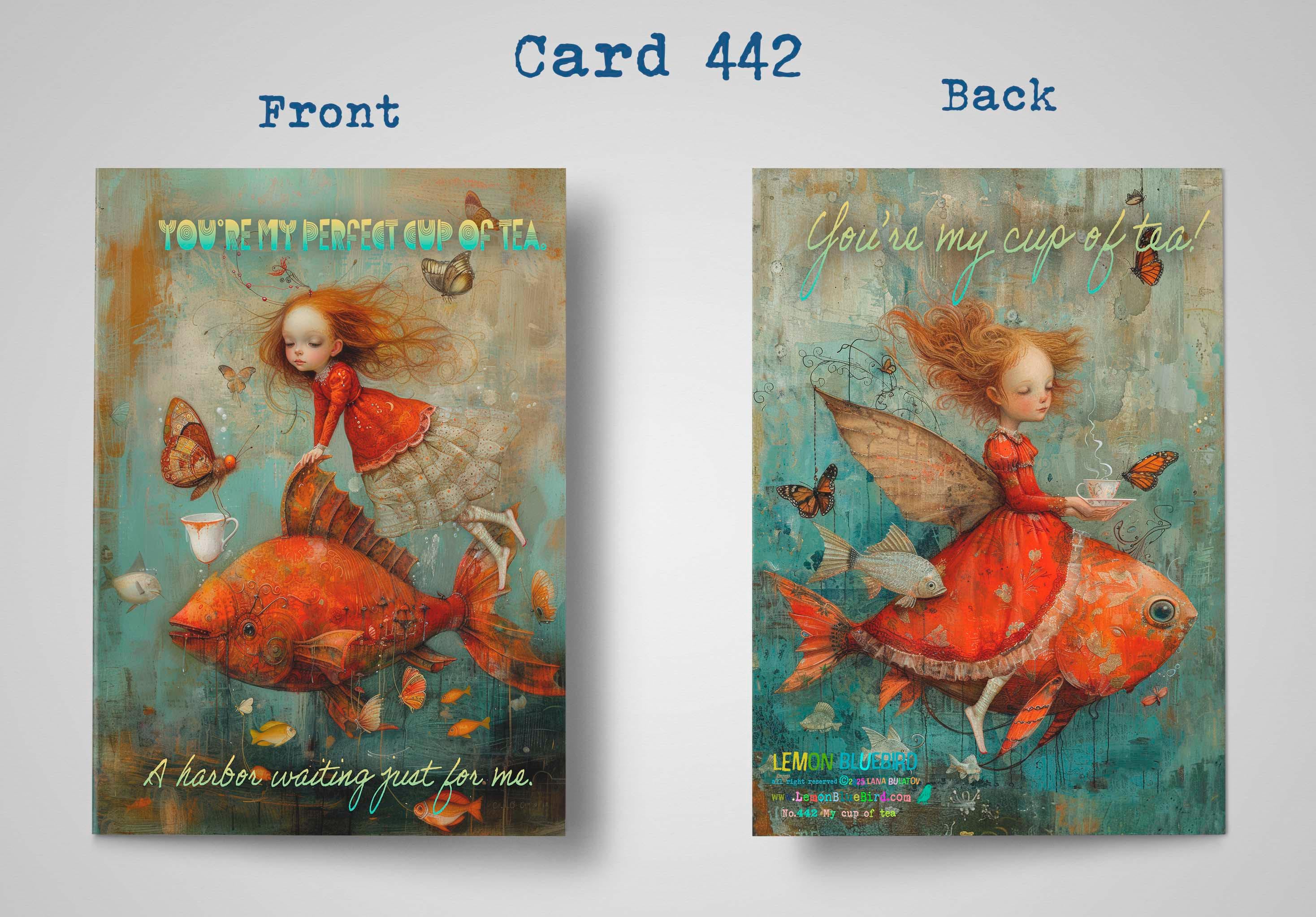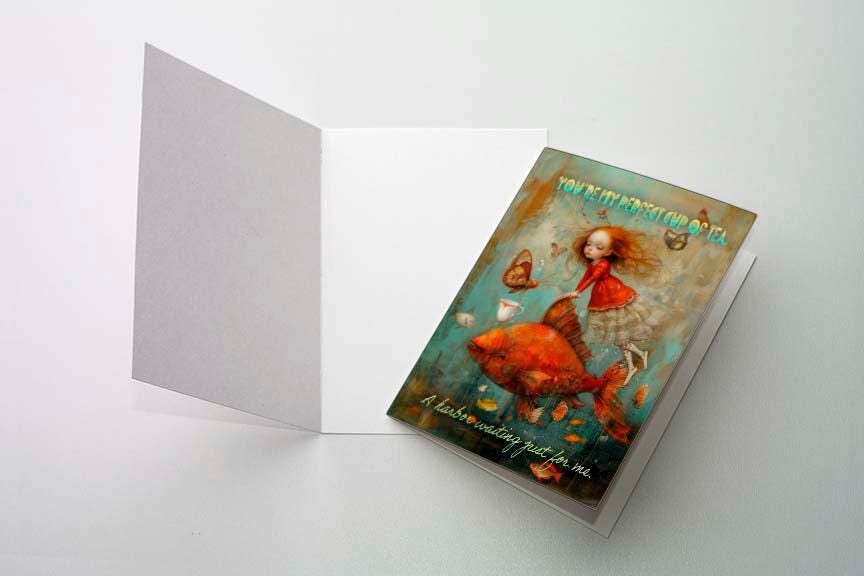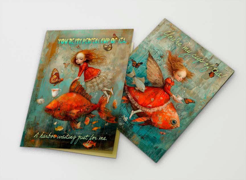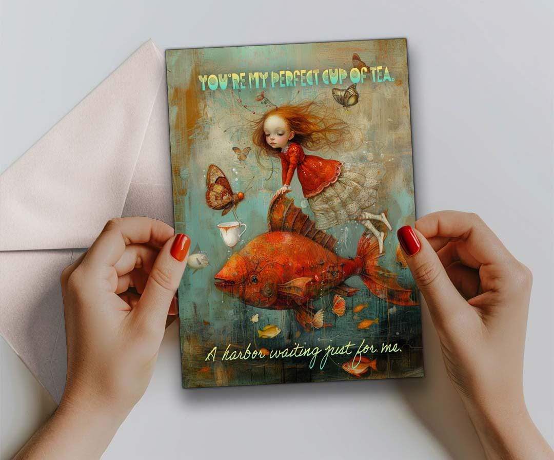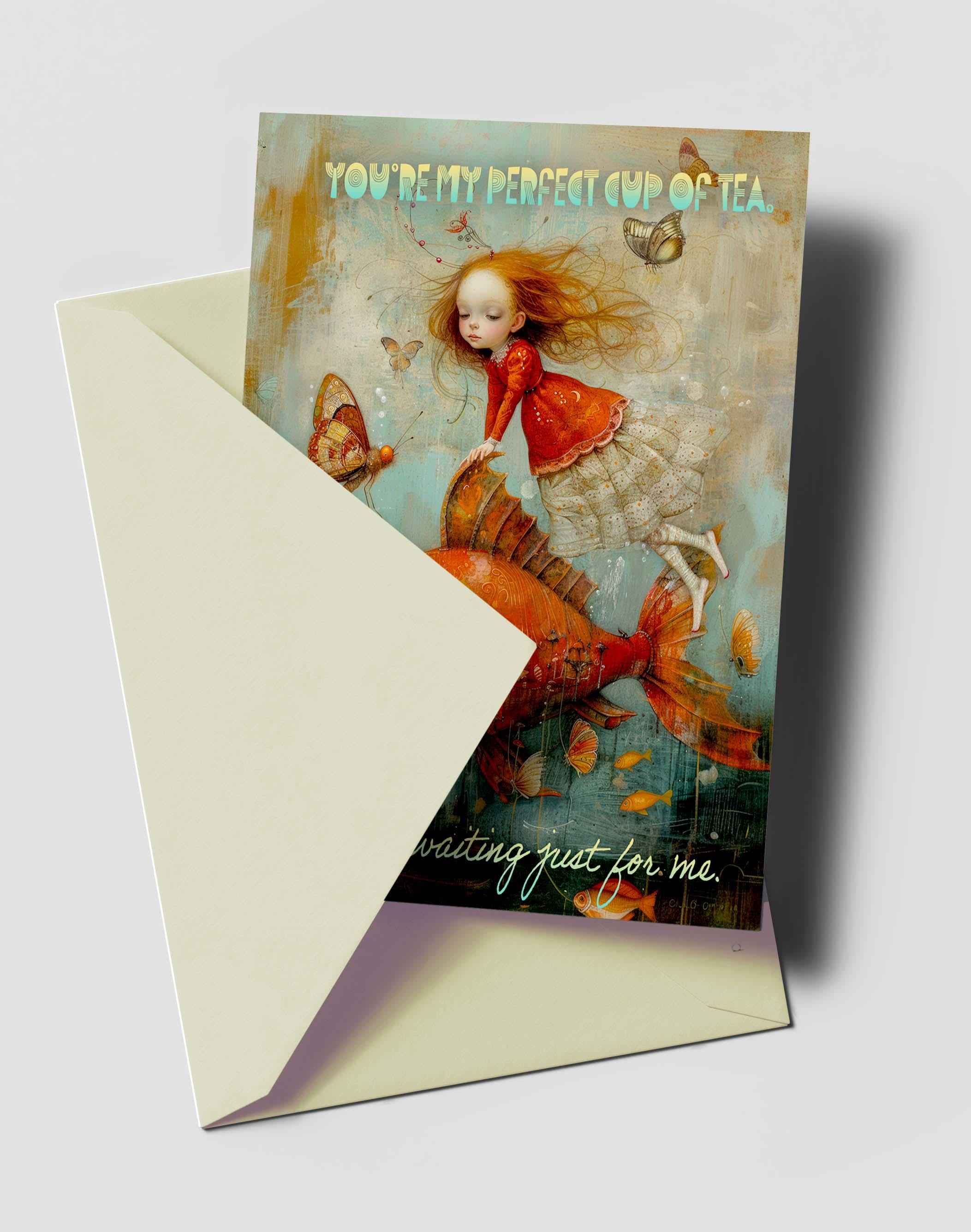 The front shows a girl in a flowing red lace dress riding a giant red fish, gazing at a butterfly offering her a cup of tea. The words โYou are my perfect cup of teaโ add a sweet, heartfelt touch.