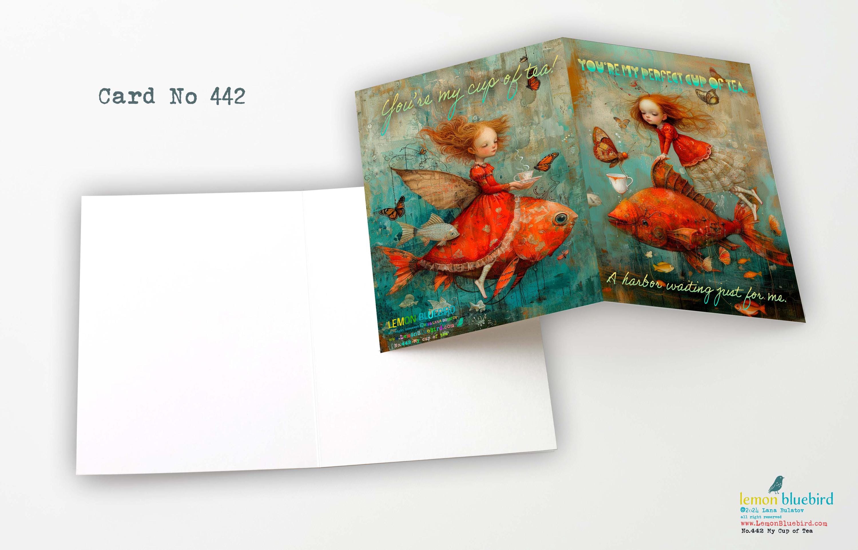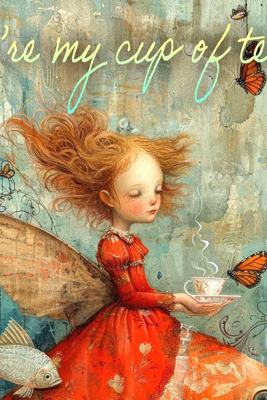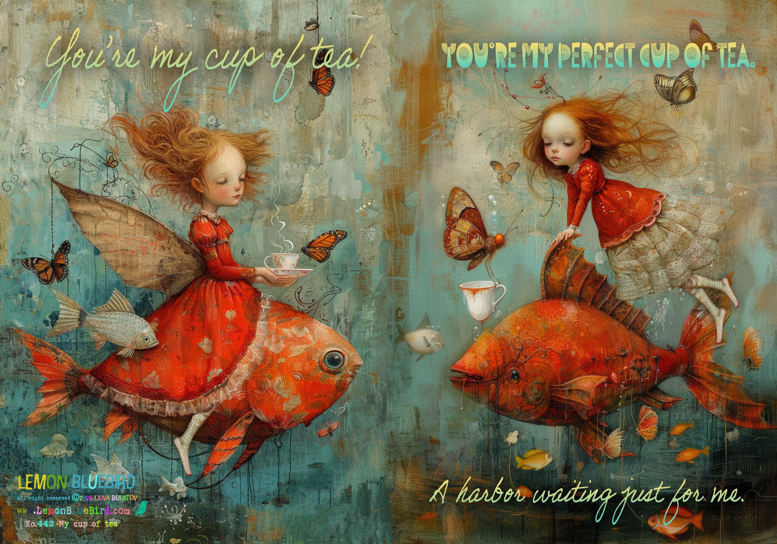 The front shows a girl in a flowing red lace dress riding a giant red fish, gazing at a butterfly offering her a cup of tea. The words โYou are my perfect cup of teaโ add a sweet, heartfelt touch.