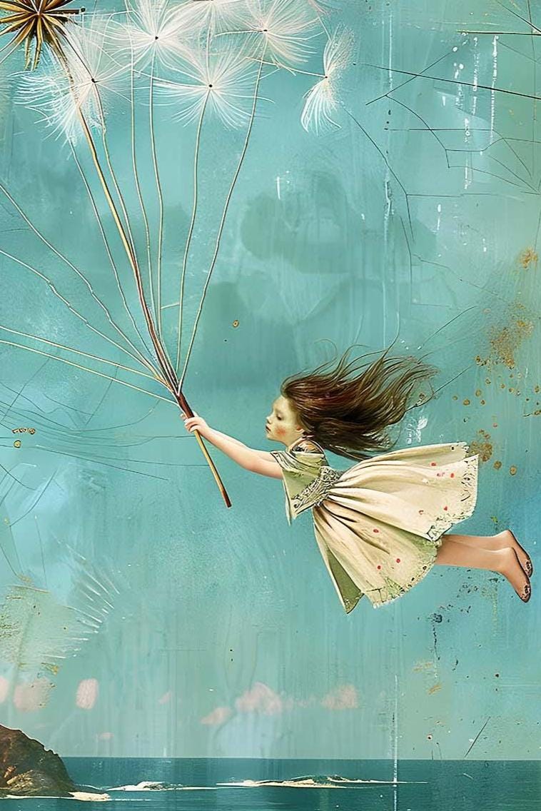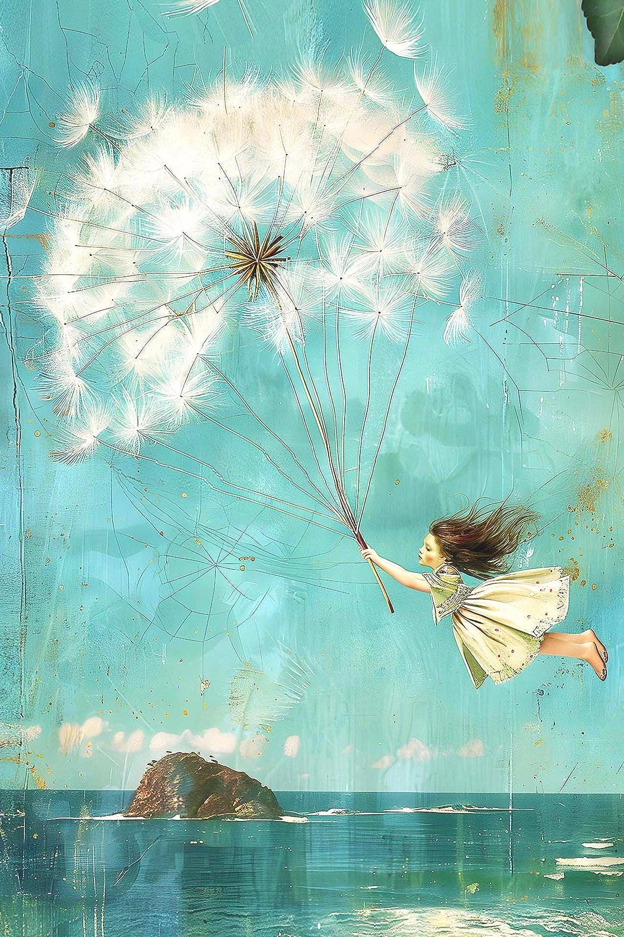 A magical scene unfolds with a young girl soaring above the wide ocean, holding tightly to her enormous dandelion as the breeze carries her across soft skies in shades of blue, teal, and beige. In the distance, a lone rock rises from the sea, grounding the horizon. On the other side, dandelion seeds drift freely over the vast waters, accompanied by the words of Shel Silverstein: