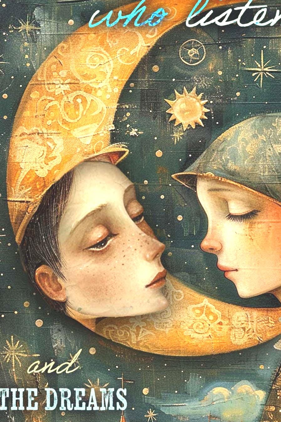 Painted in dreamy shades of misty olive and blue-green, the card captures the beauty of a starry night sky where a glowing moon shines down, its surface shaped into the gentle face of a boy. Beneath the moon, a girl stands with her eyes closed, as if lost in a dream of him ๐ซ. Across the sky glimmers the quote: