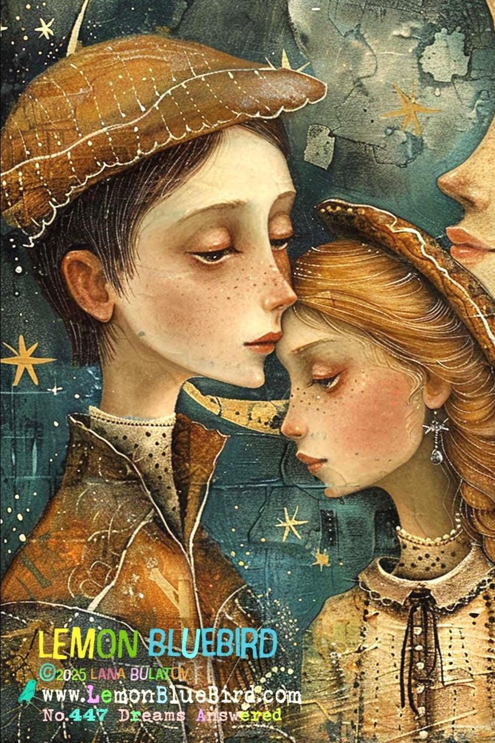 On the reverse side, the dream comes true โ the girl and boy now together, wrapped in a warm embrace ๐ค under the same magical sky full of stars โจ. Above them, the moon ๐ smiles mysteriously, gazing upward as if it has carried their wishes into reality.
