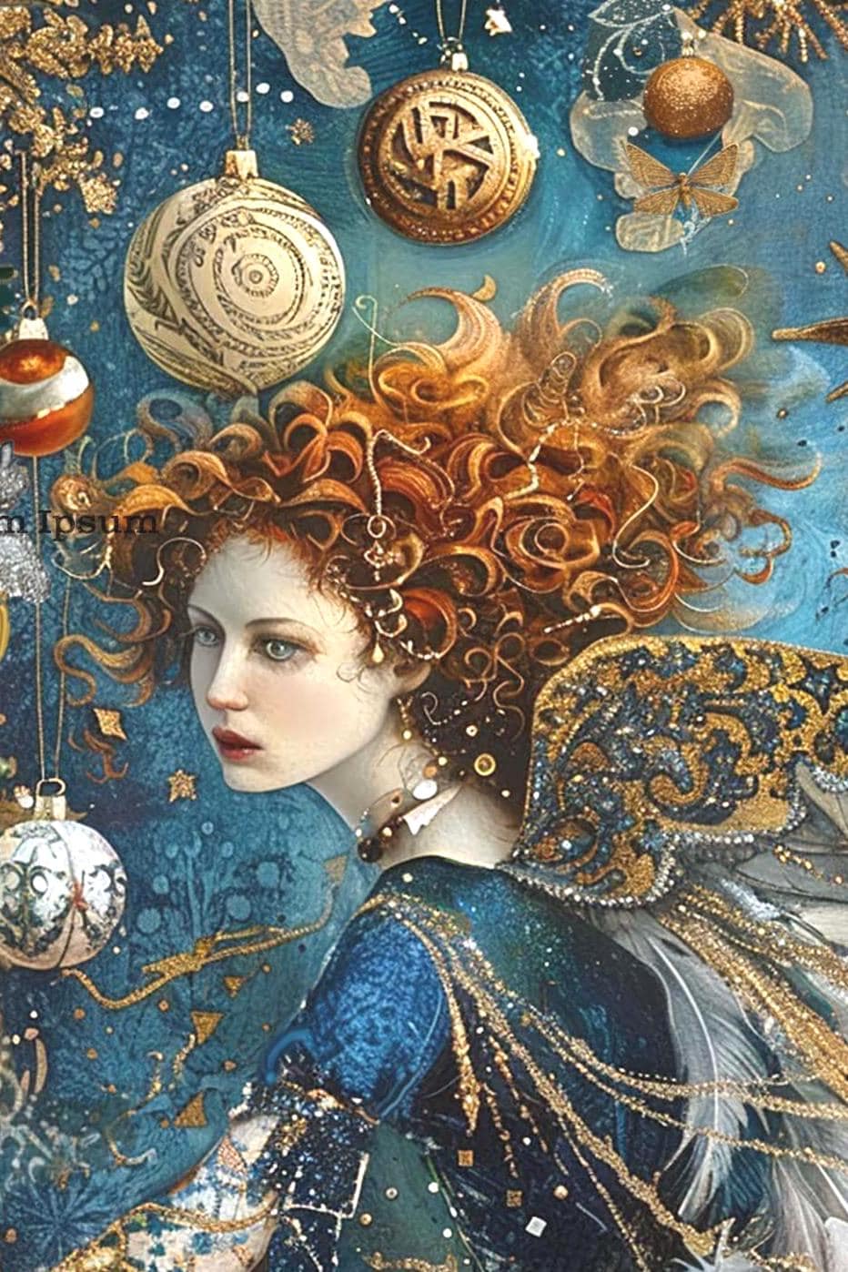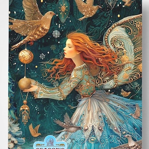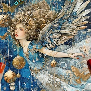 The angels are surrounded by a flurry of sparkling snowflakes, shimmering ornaments, a dove and golden butterflies with a magical glow, adding a touch of ethereal fantasy. The artwork flows seamlessly from the front to the back, creating a 360° celestial scene that feels alive and radiant.