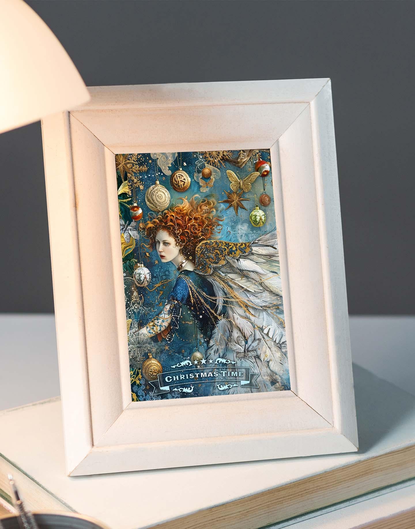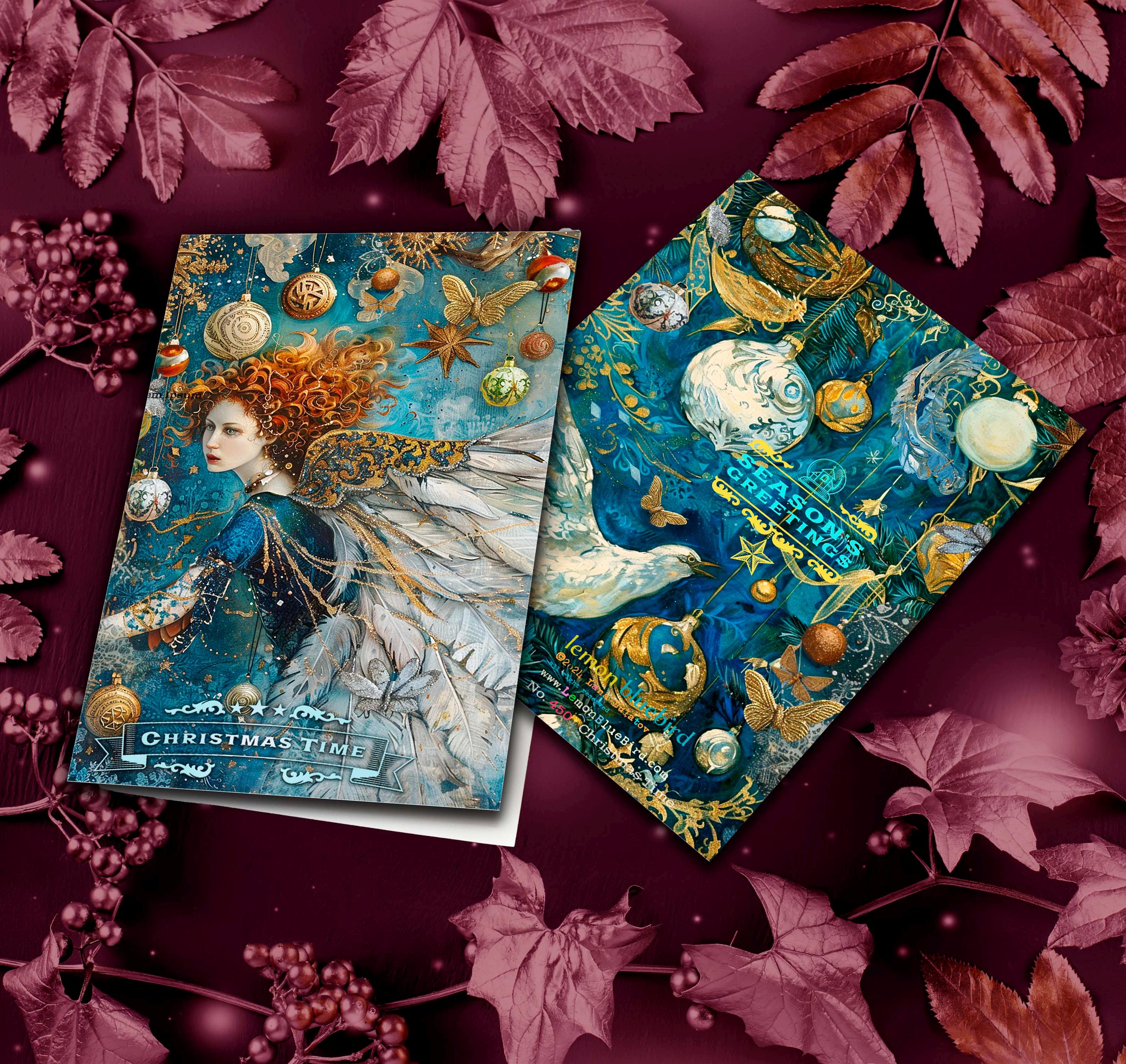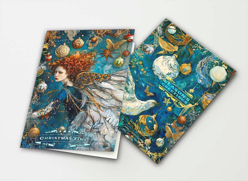 This enchanting Christmas greeting card features an angelic girls gracefully flying across the front covers, her wings fully outstretched as if caught mid-flight. The scene is in deep, luminous shades of rich teal blue, evoking the magic and wonder of a winter’s night.