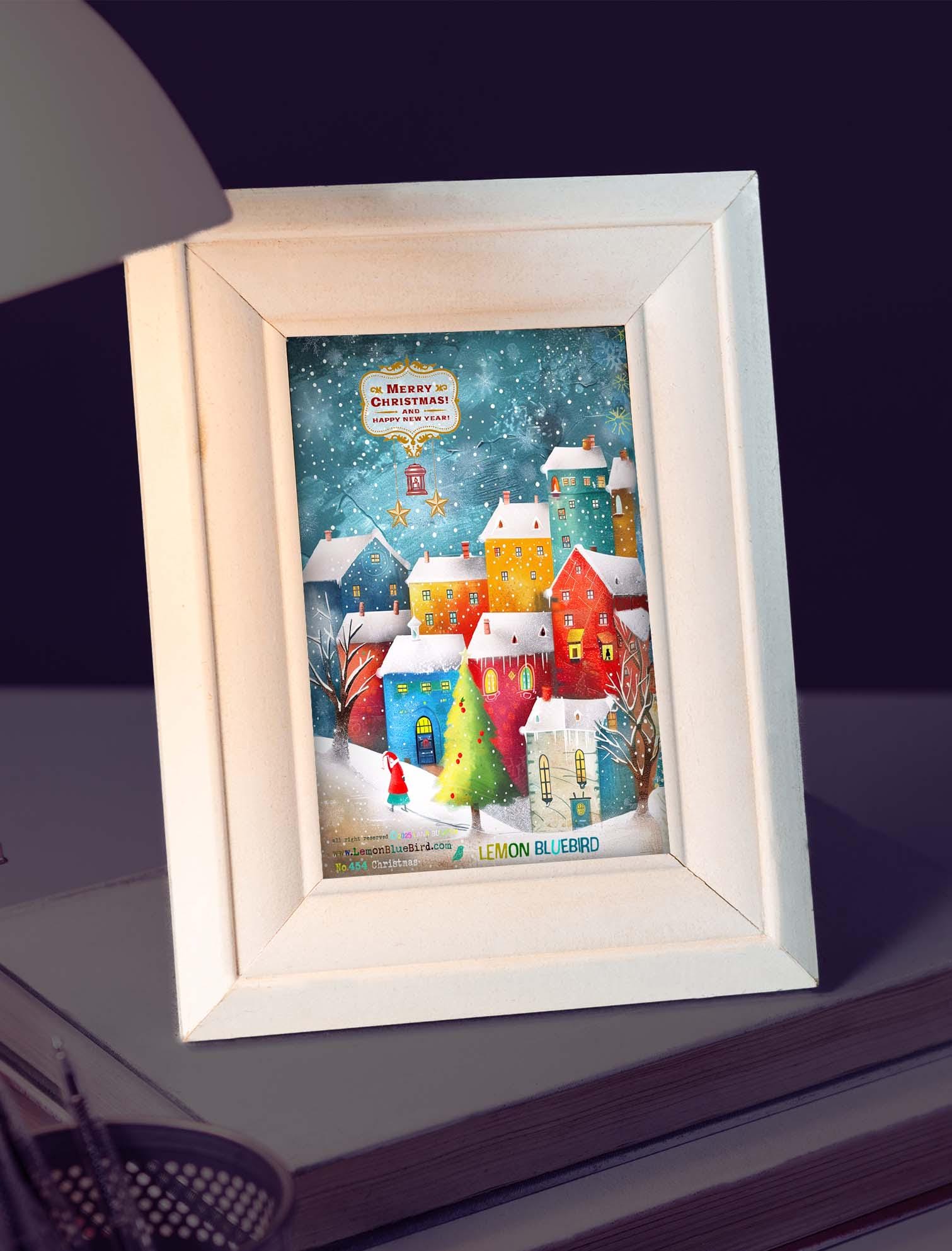 colorful snowy village with vibrant houses, twinkling snowflakes, and playful details which create a joyful holiday atmosphere that both children and adults will love.