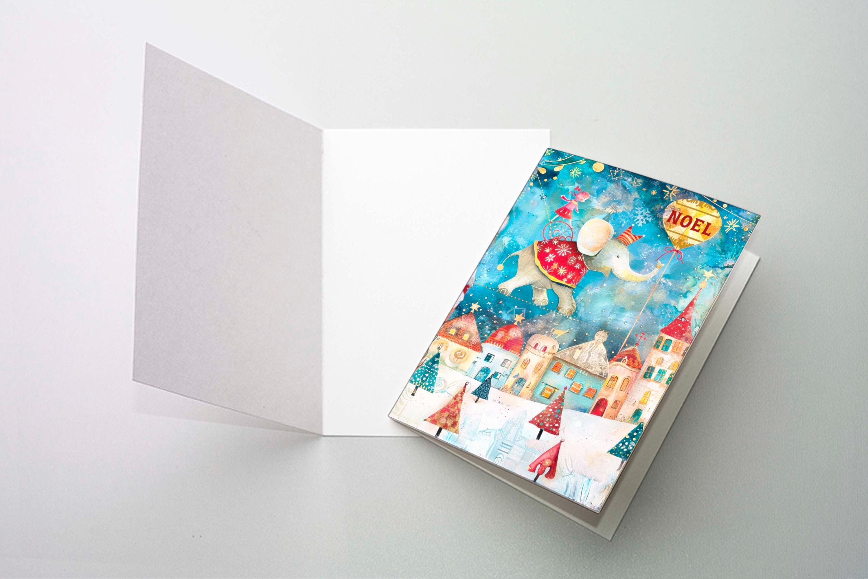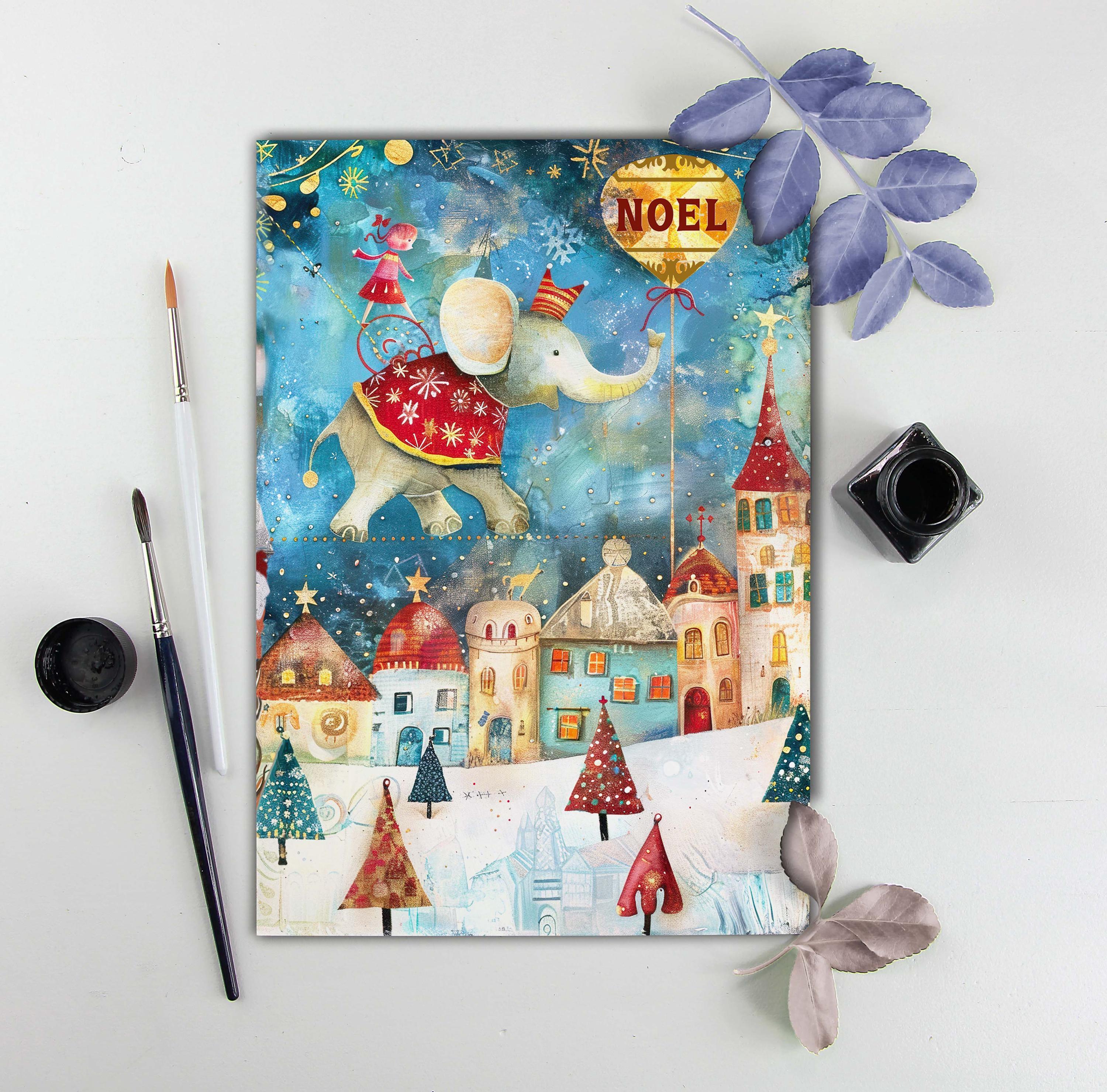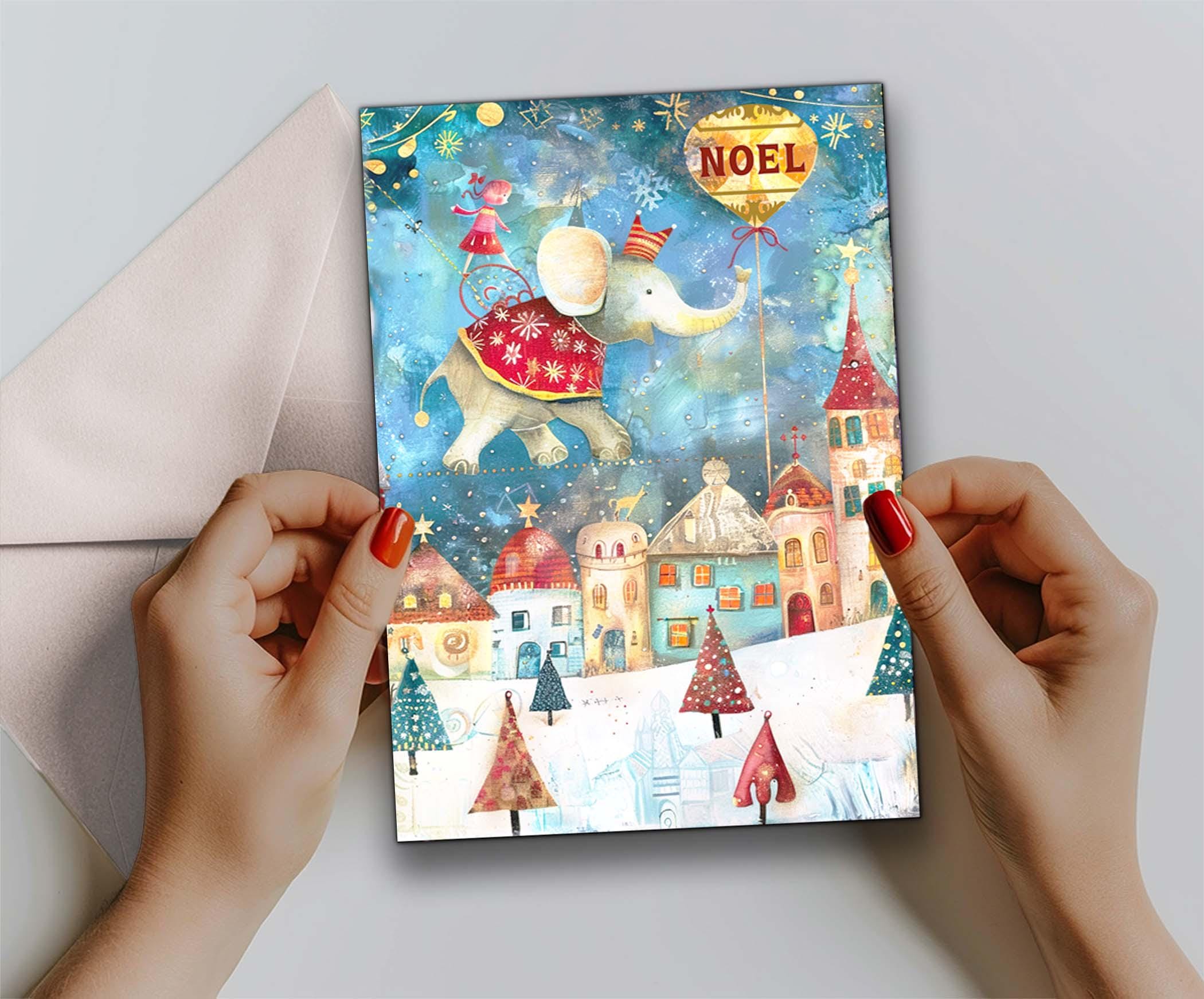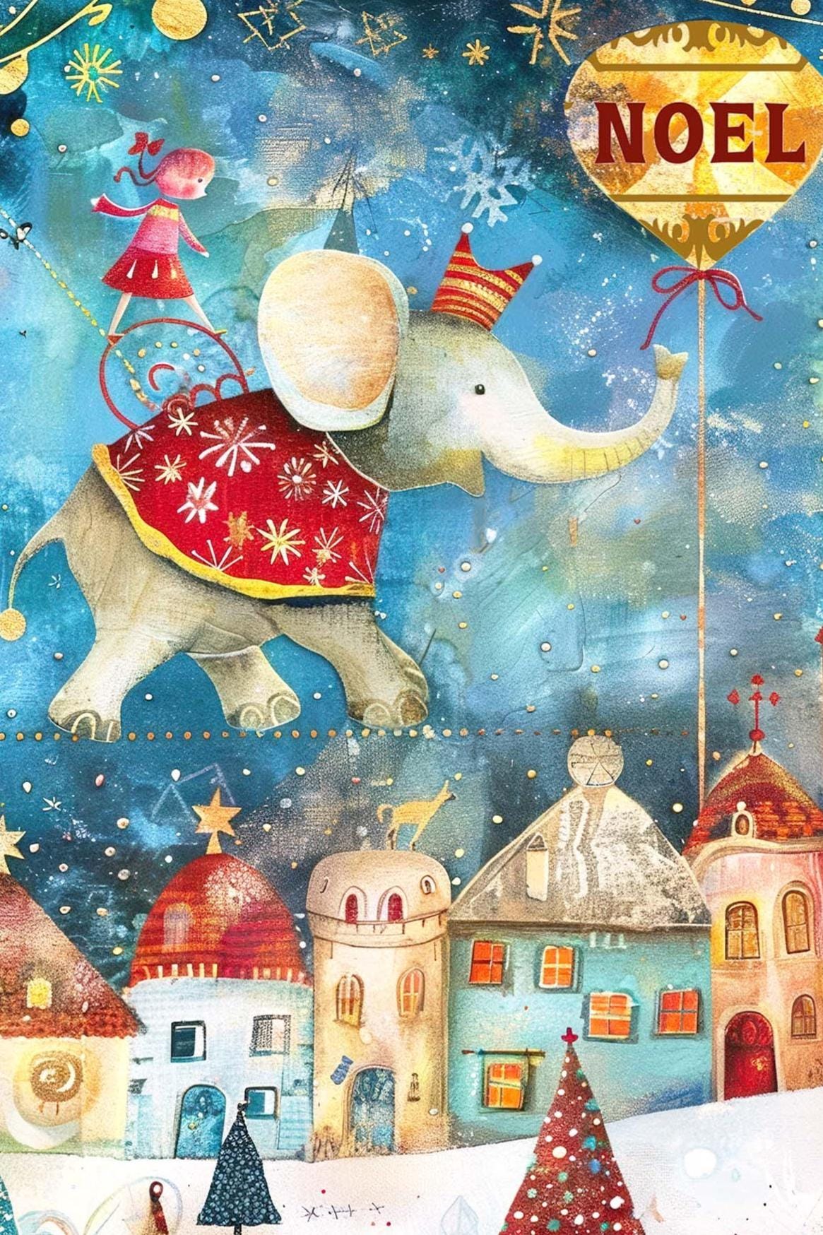Featuring a fairytale-inspired scene with a crowned elephant carrying a little girl beneath a golden โNOELโ balloon on one side ,and on the other