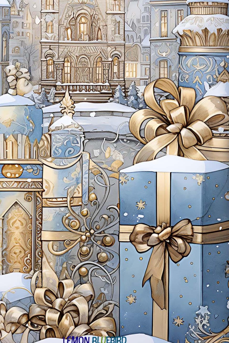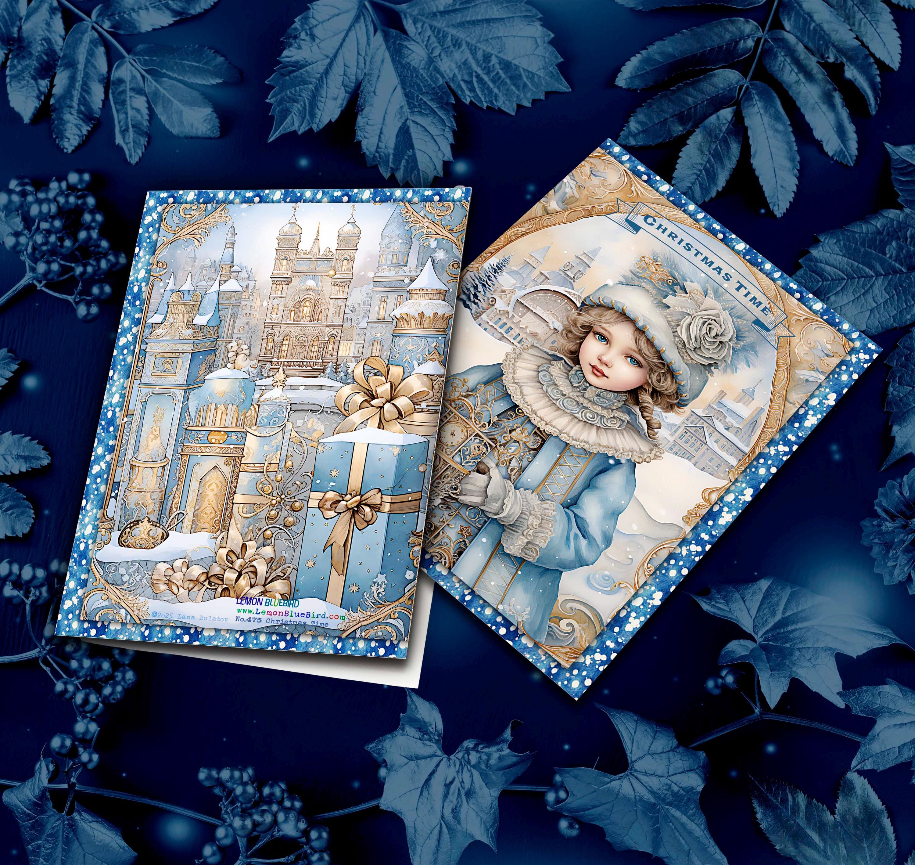 This elegant holiday card is perfect for sending warm wishes, displaying as festive art, or gifting to someone who loves timeless, romantic Christmas designs. The rich details, frosty blues, and shimmering golden tones capture the beauty of an old-world Christmas with a touch of fairy tale charm.