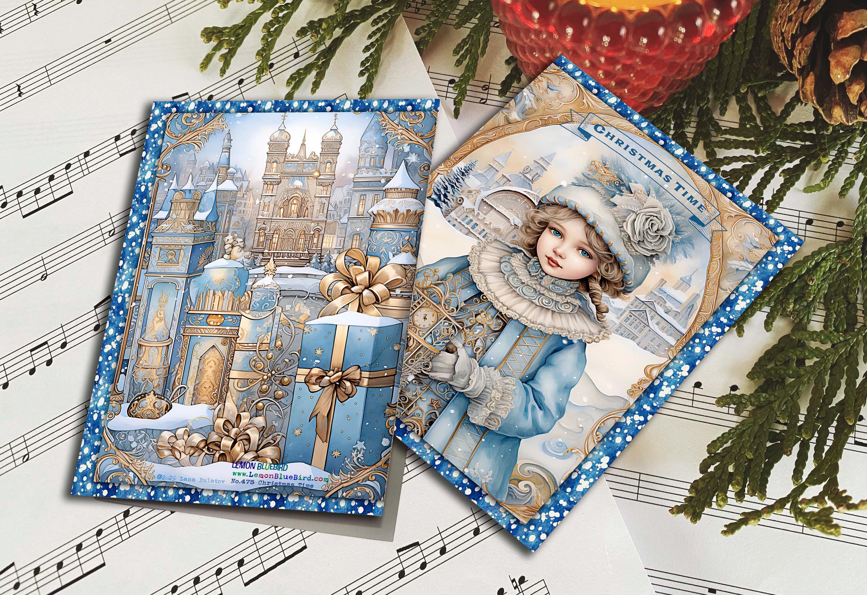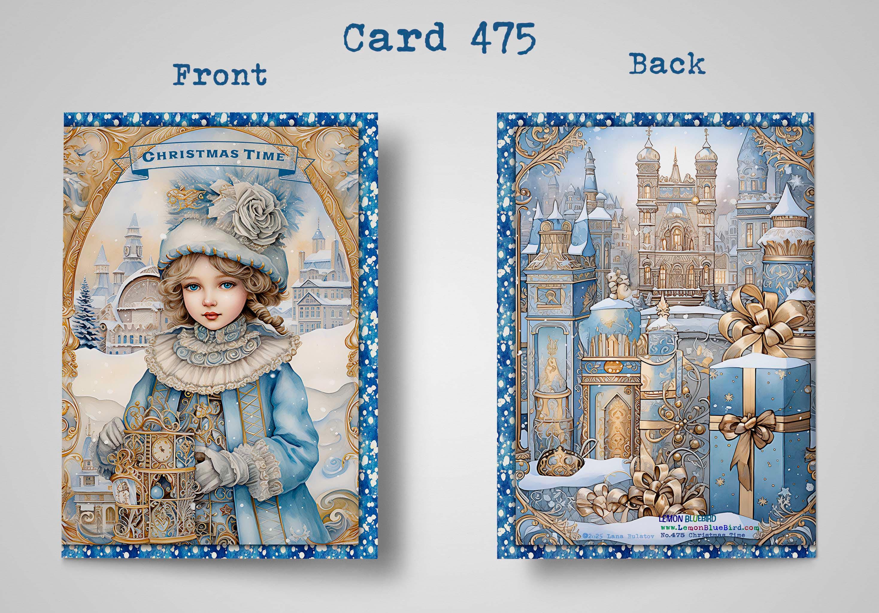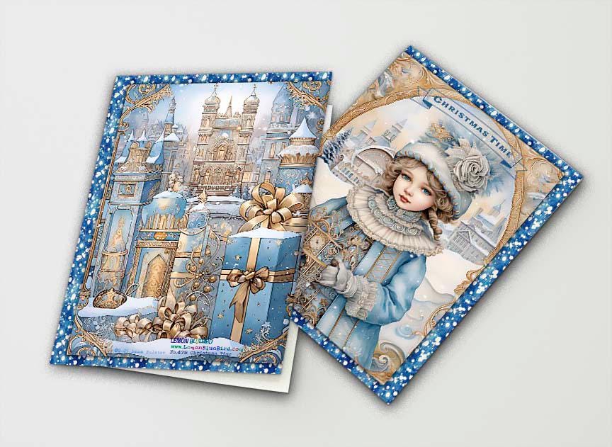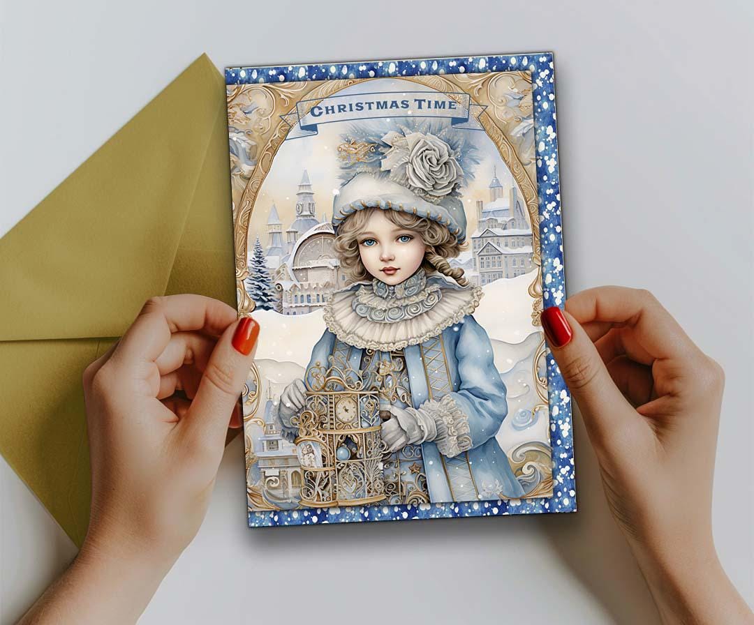 Bring the magic of the season to life with this Victorian Christmas greeting card, featuring an enchanting winter castle scene wrapped in snow, gilded details, and ornate blue-and-gold gift boxes. On the front, a beautifully illustrated vintage-style Christmas girl in a blue coat holds a delicate golden lantern clock, surrounded by snowy rooftops, festive bows, and intricate architectural details.