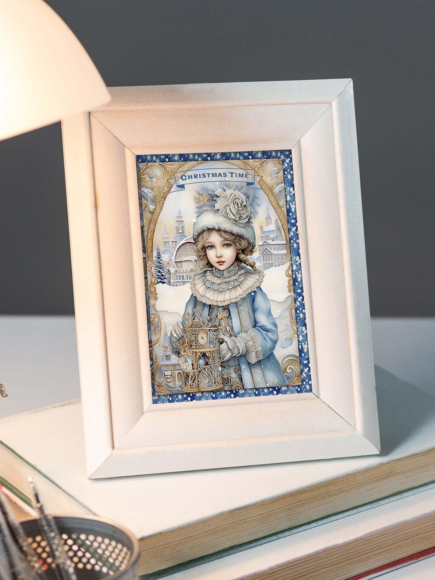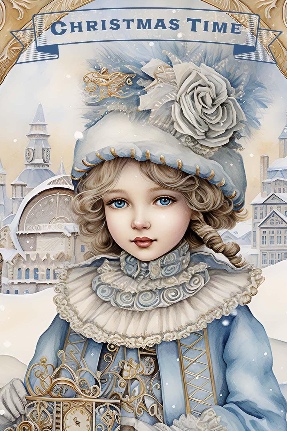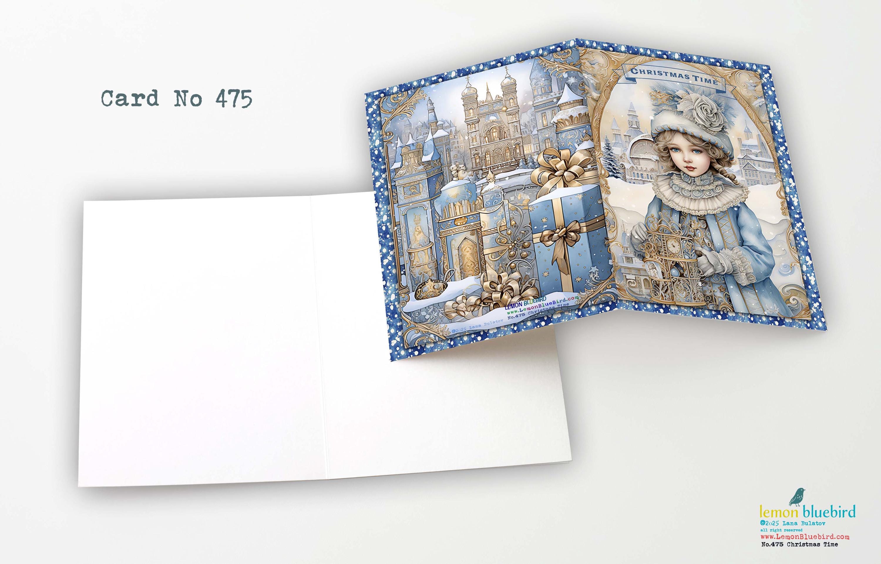 Bring the magic of the season to life with this Victorian Christmas greeting card, featuring an enchanting winter castle scene wrapped in snow, gilded details, and ornate blue-and-gold gift boxes. On the front, a beautifully illustrated vintage-style Christmas girl in a blue coat holds a delicate golden lantern clock, surrounded by snowy rooftops, festive bows, and intricate architectural details.