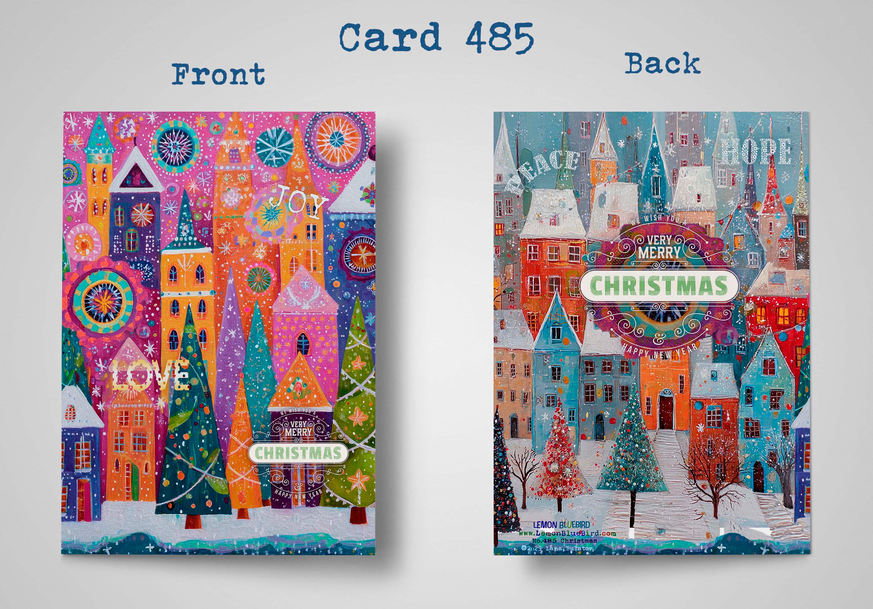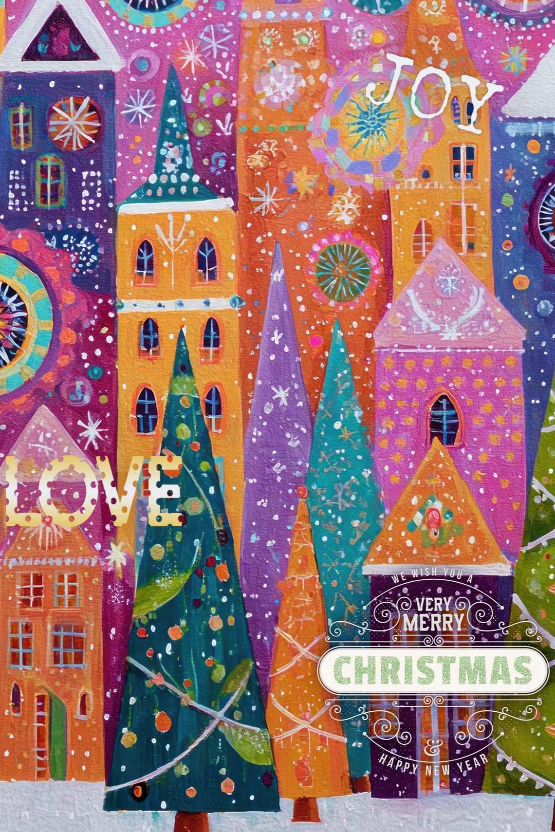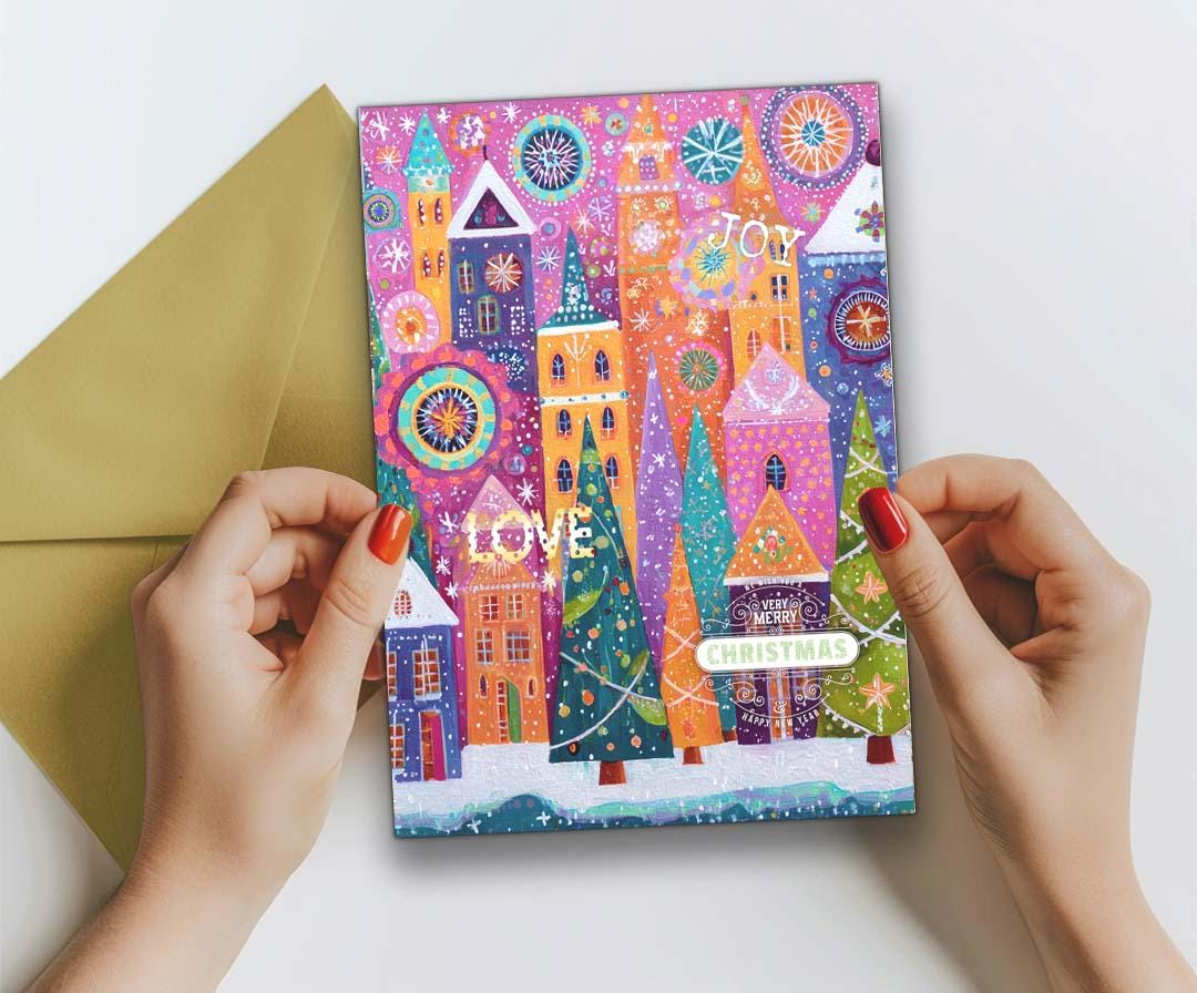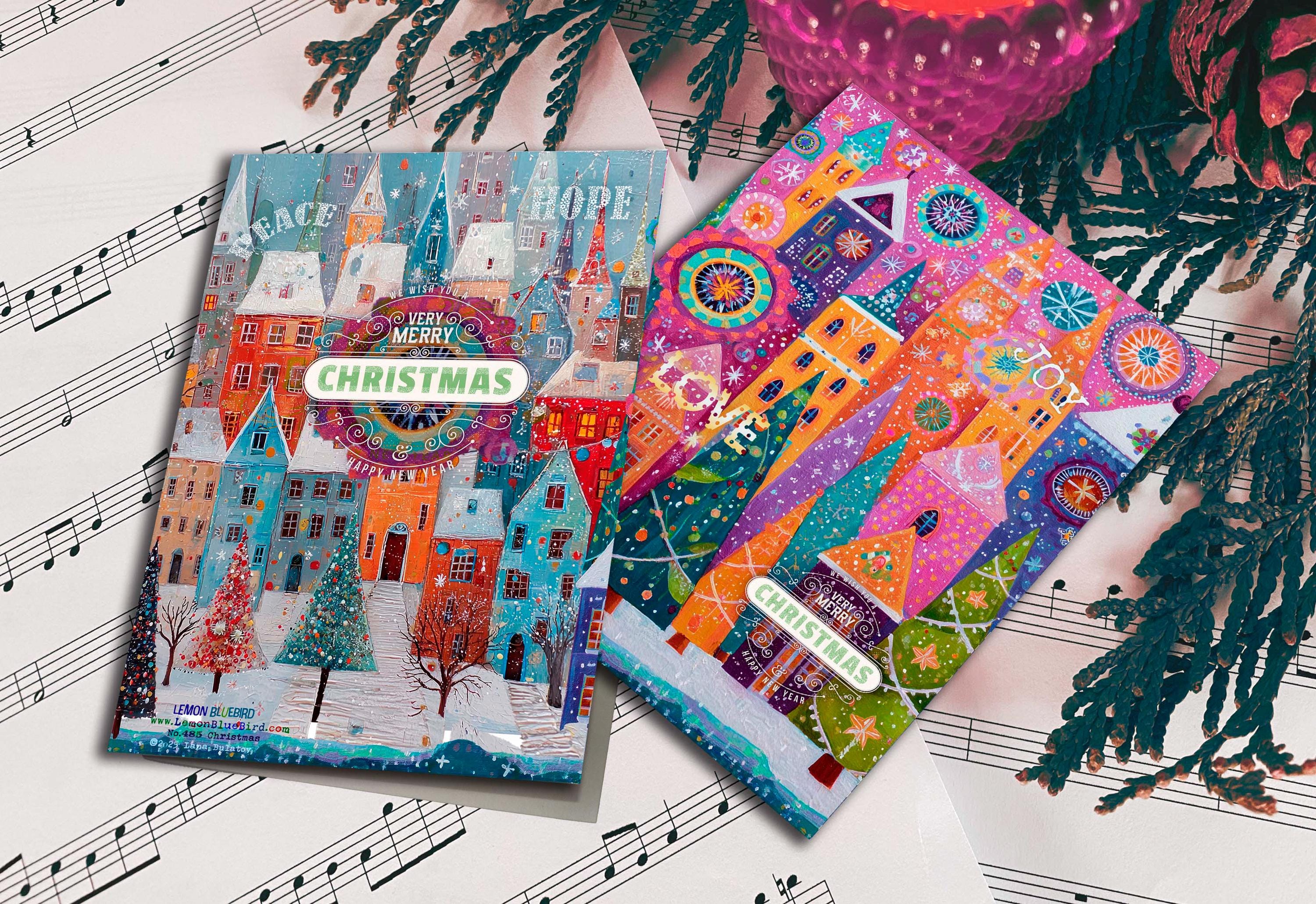 โฟWith designs printed on both the front and back, each card feels like a tiny picture book and a work of art, filled with wonder, complete with its own story to tell, featuring a colorful old town scene with falling snow and glowing Christmas trees. The cheerful winter village is filled with vibrant buildings and a few festive townsfolk, creating a joyful, storybook feel. Perfect for sending holiday wishes, this charming card captures the magic of the season and is ideal for friends, family, or anyone who loves cozy Christmas scenes.