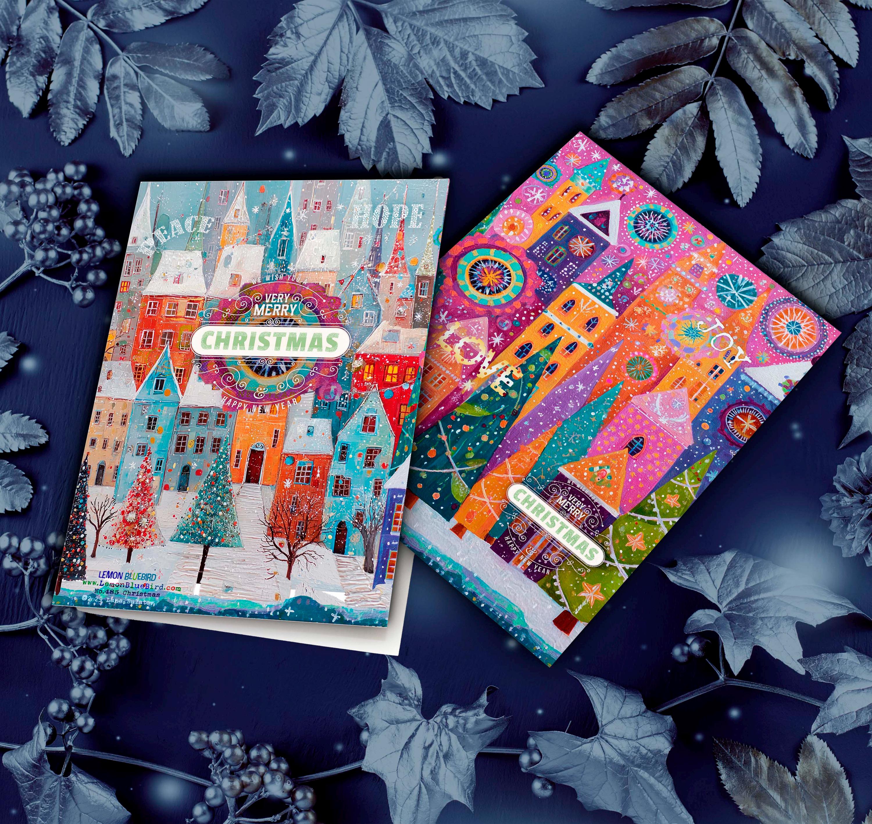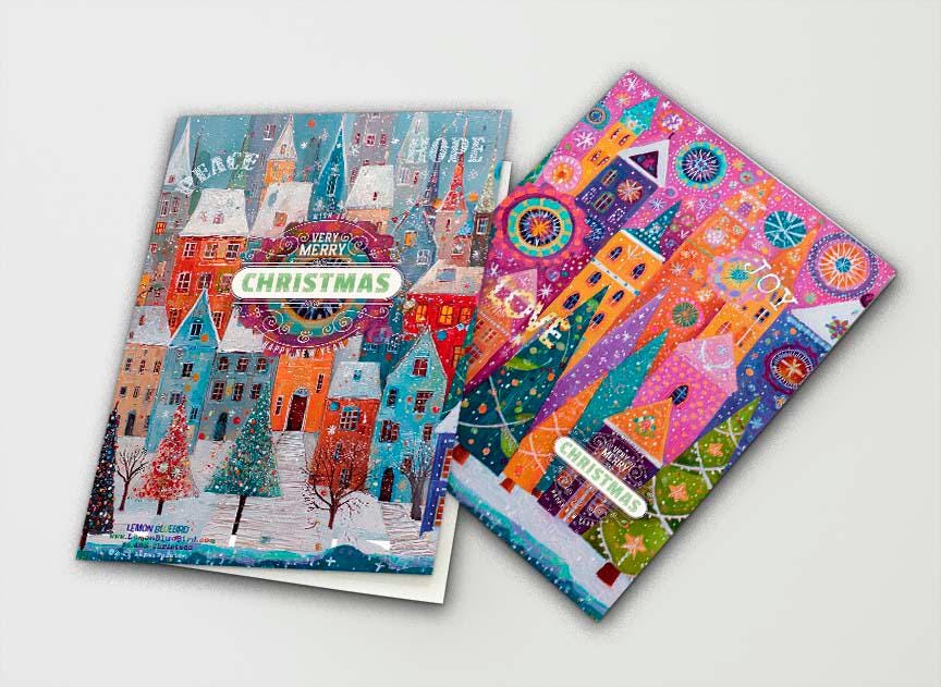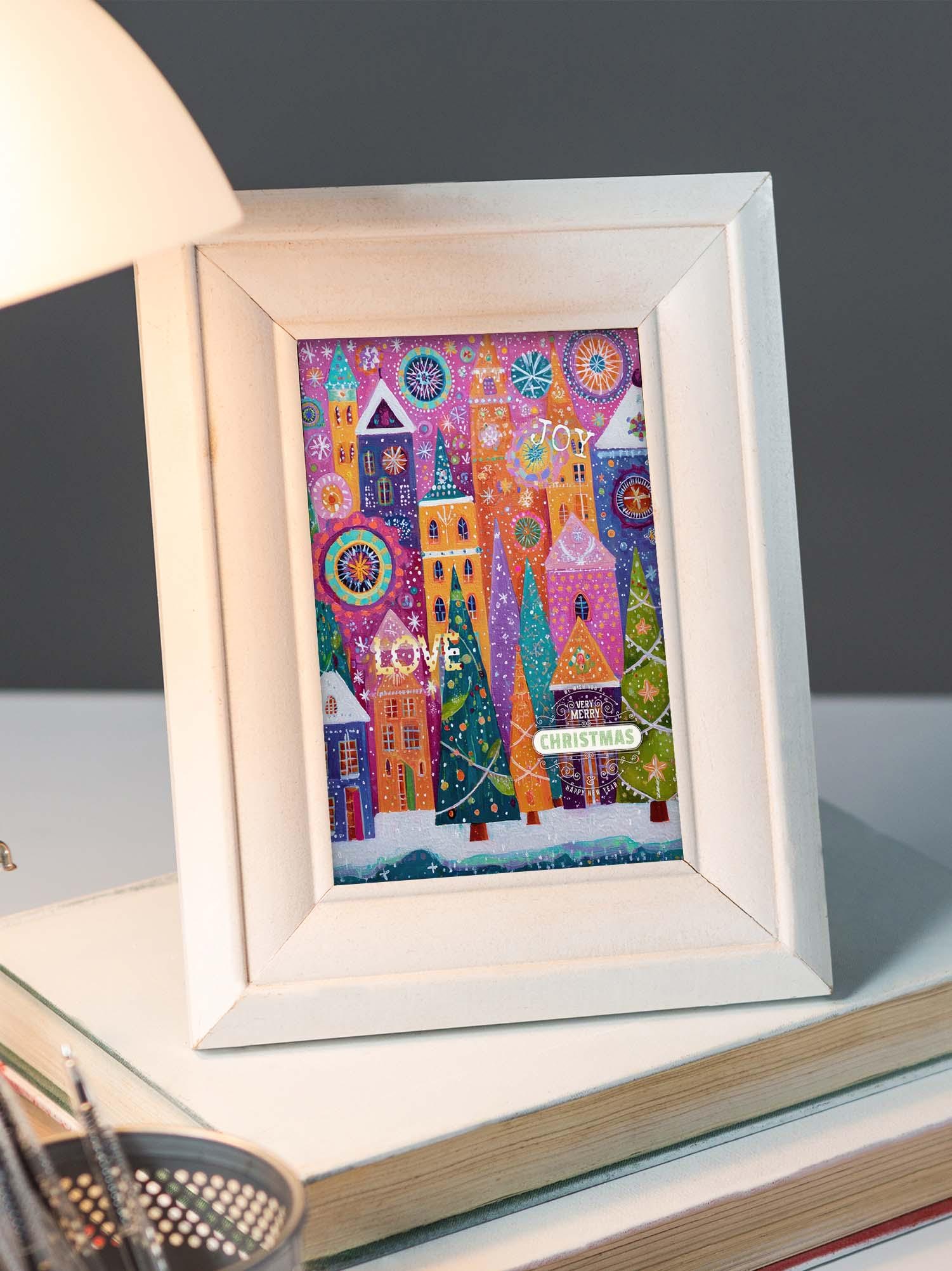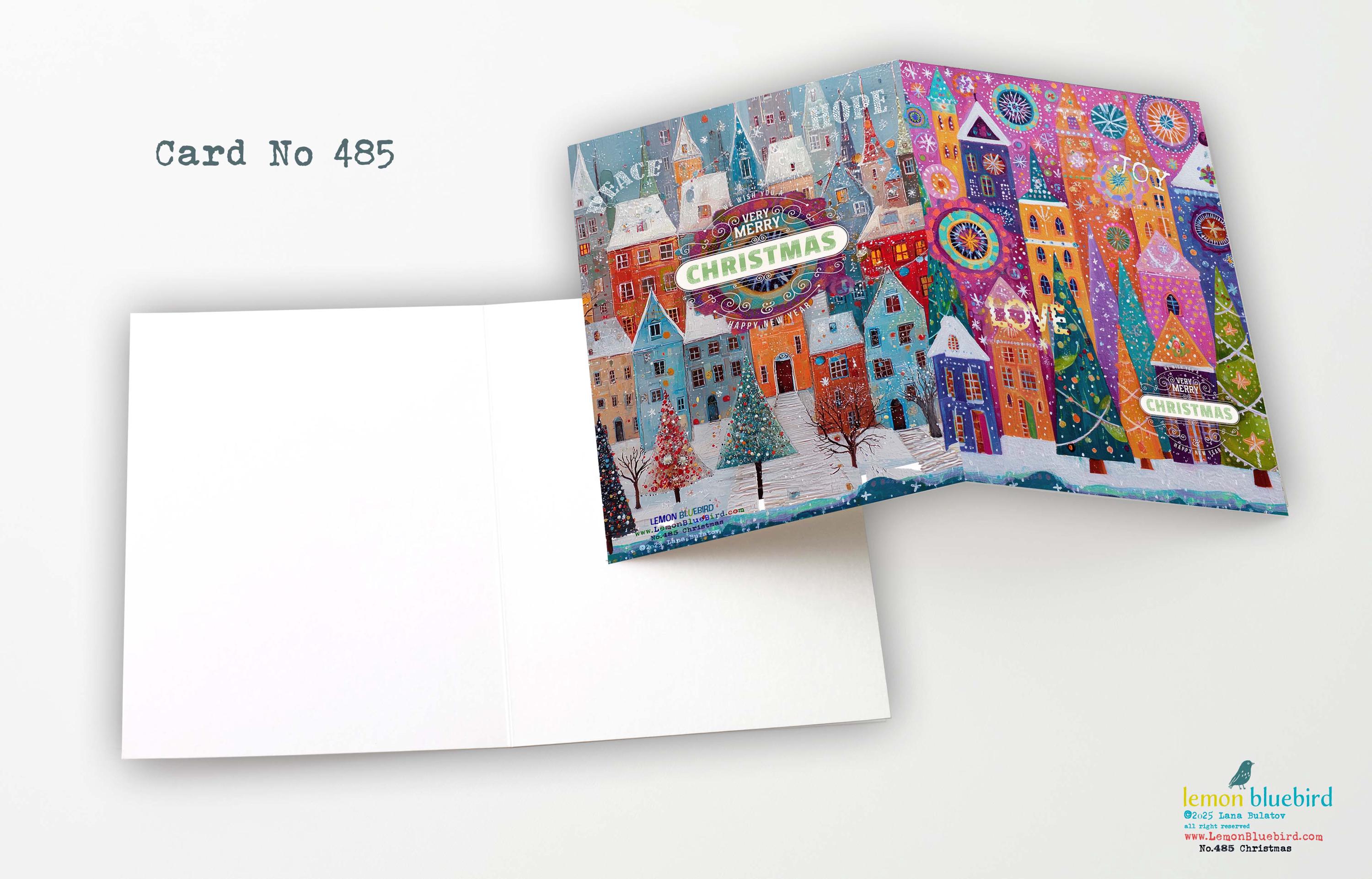 โฟWith designs printed on both the front and back, each card feels like a tiny picture book and a work of art, filled with wonder, complete with its own story to tell, featuring a colorful old town scene with falling snow and glowing Christmas trees. The cheerful winter village is filled with vibrant buildings and a few festive townsfolk, creating a joyful, storybook feel. Perfect for sending holiday wishes, this charming card captures the magic of the season and is ideal for friends, family, or anyone who loves cozy Christmas scenes.