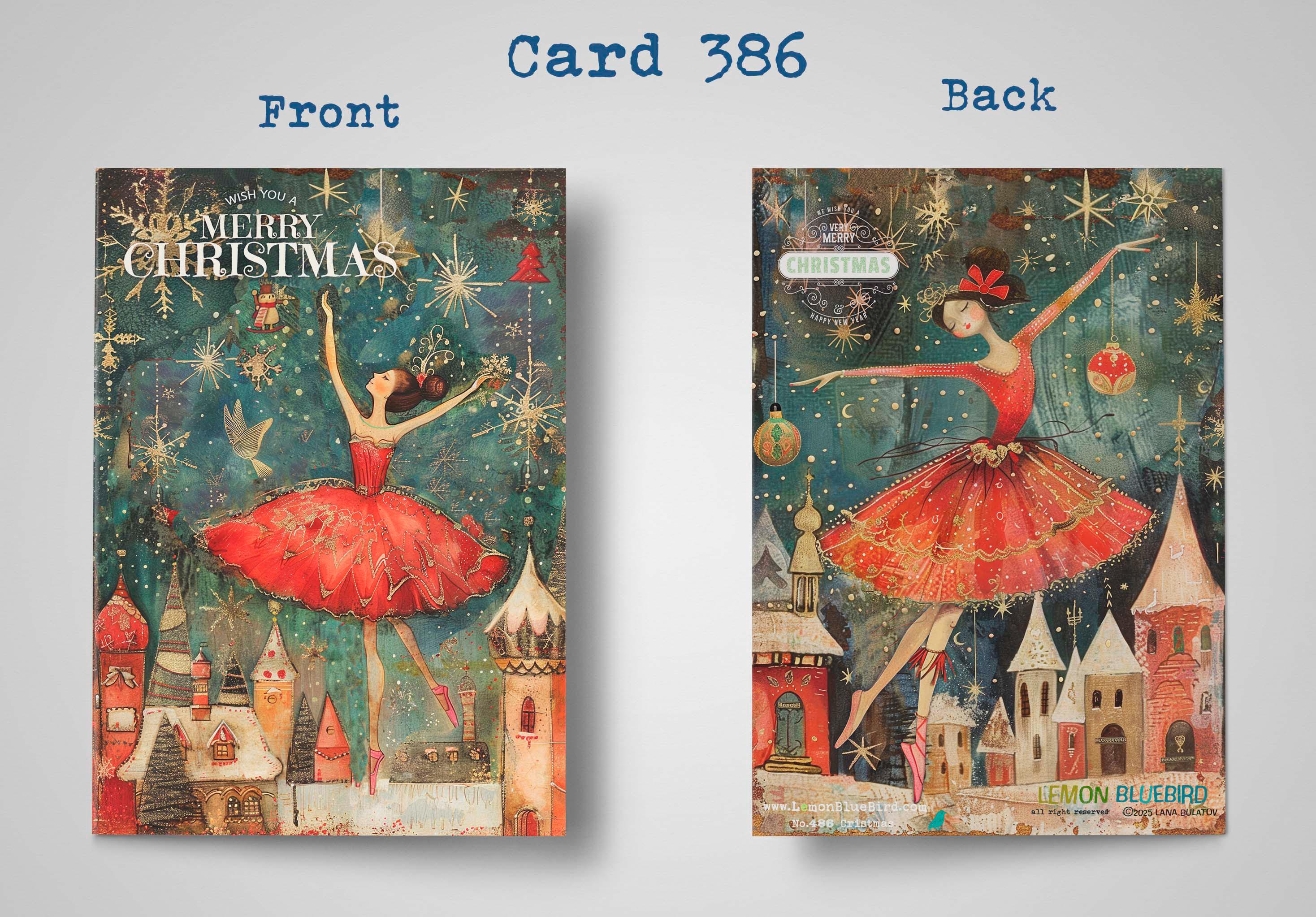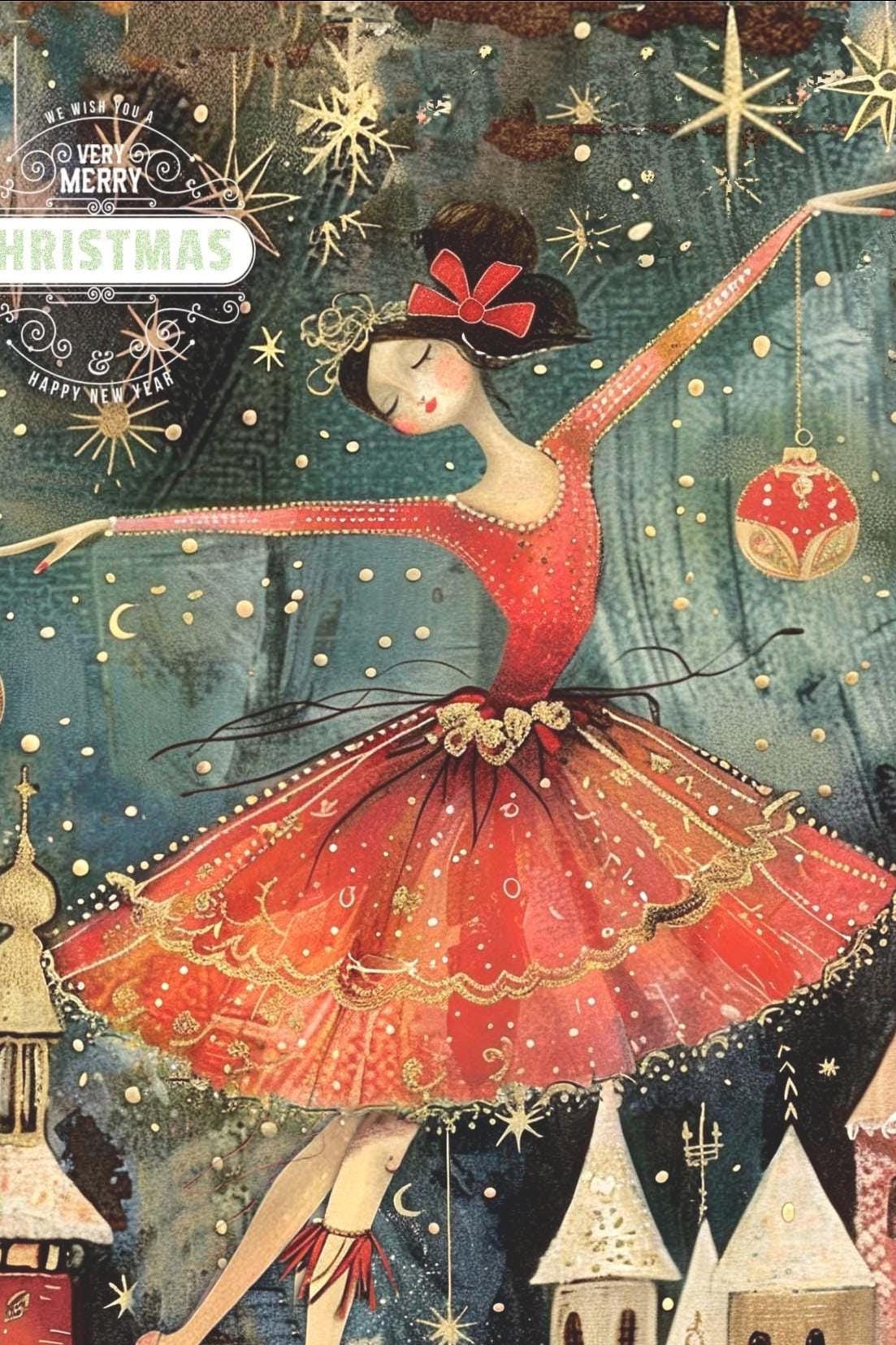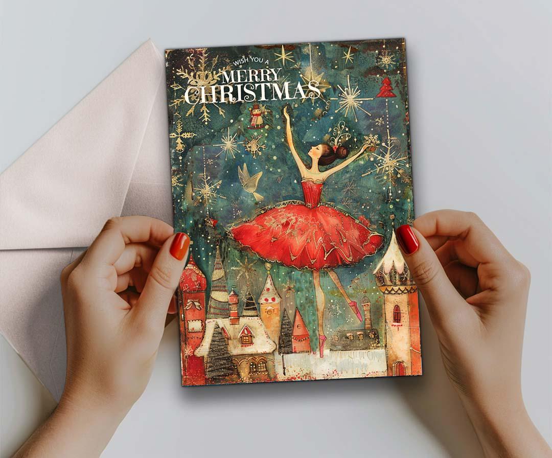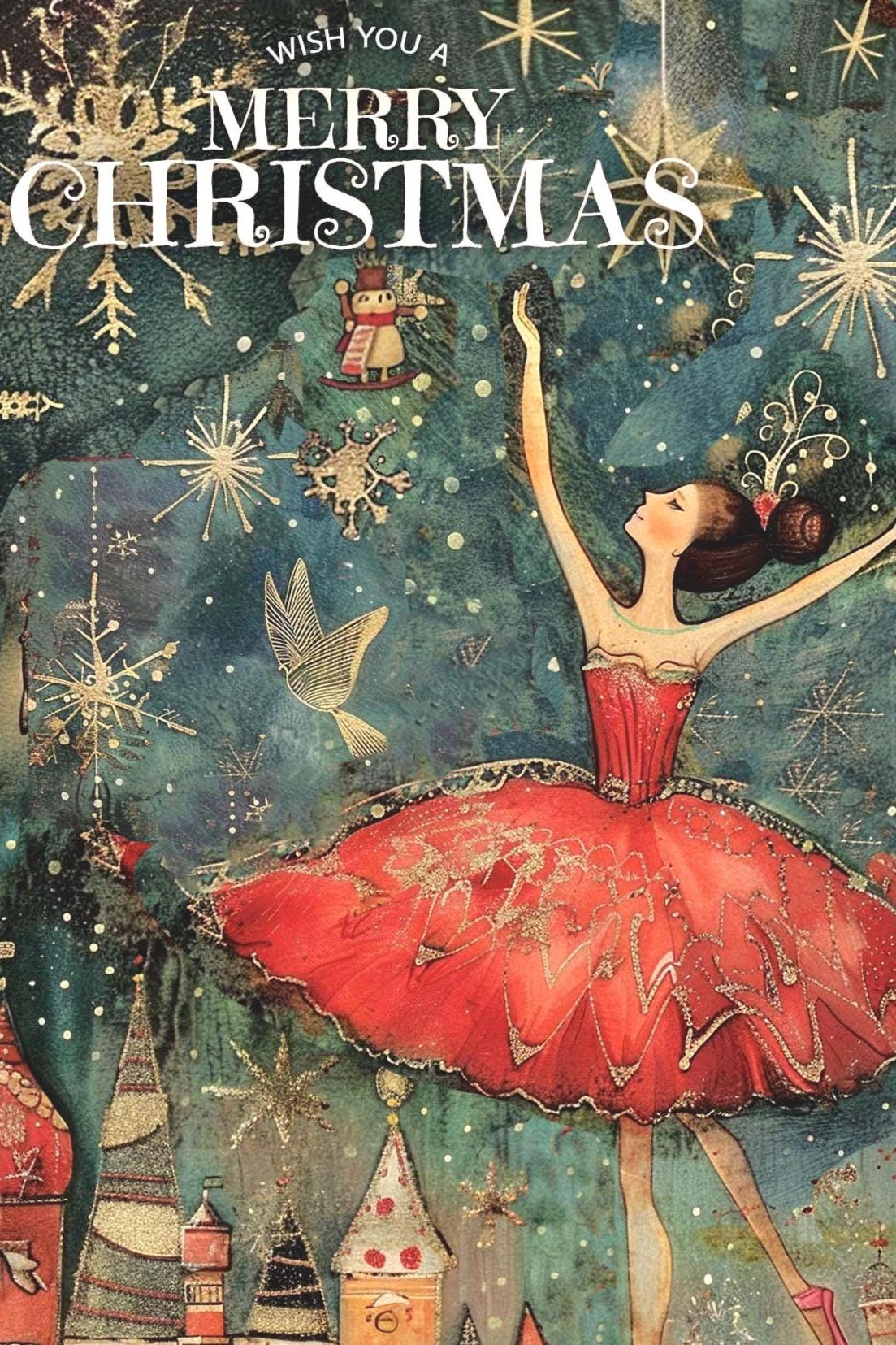 ๐Bring a touch of magic and movement to your holiday greetings with this enchanting Christmas card featuring two elegant ballerinas dancing above a whimsical winter village. Dressed in rich red and gold gowns, they twirl gracefully among sparkling stars, snowflakes, and ornaments against a deep teal night sky. Inspired by the timeless Nutcracker ballet, this card captures the joy and wonder of the season in a beautifully vintage, painterly style.