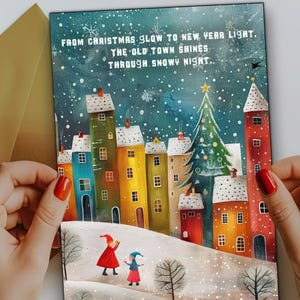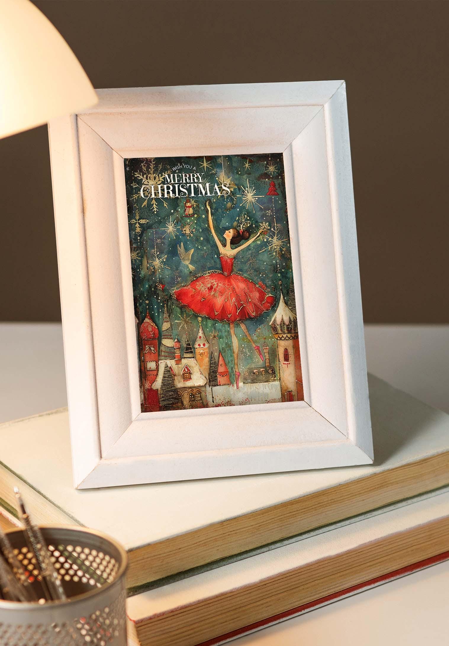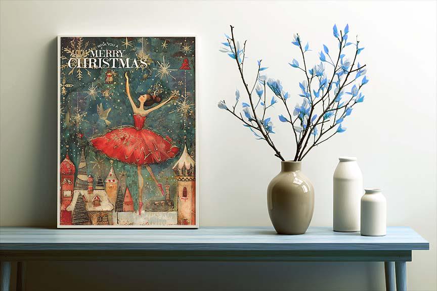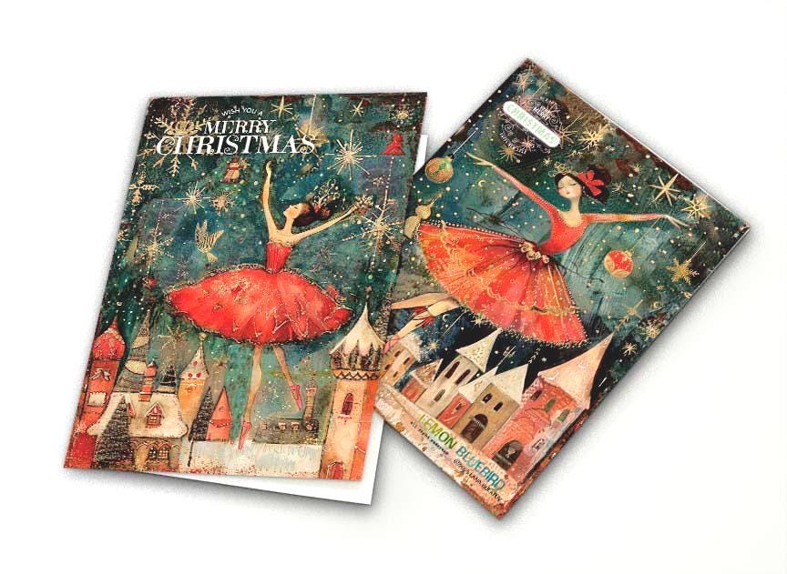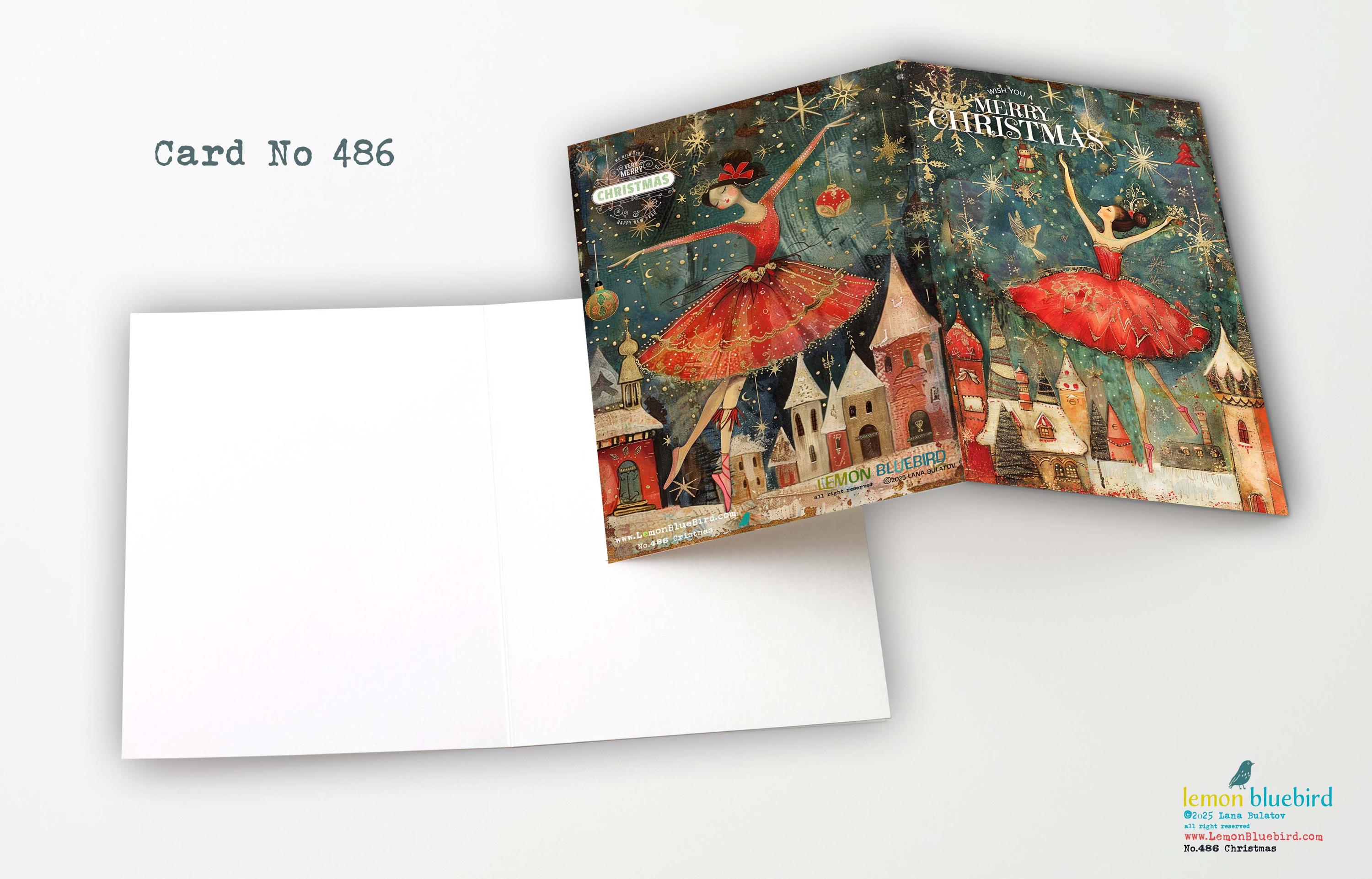 ๐Bring a touch of magic and movement to your holiday greetings with this enchanting Christmas card featuring two elegant ballerinas dancing above a whimsical winter village. Dressed in rich red and gold gowns, they twirl gracefully among sparkling stars, snowflakes, and ornaments against a deep teal night sky. Inspired by the timeless Nutcracker ballet, this card captures the joy and wonder of the season in a beautifully vintage, painterly style.