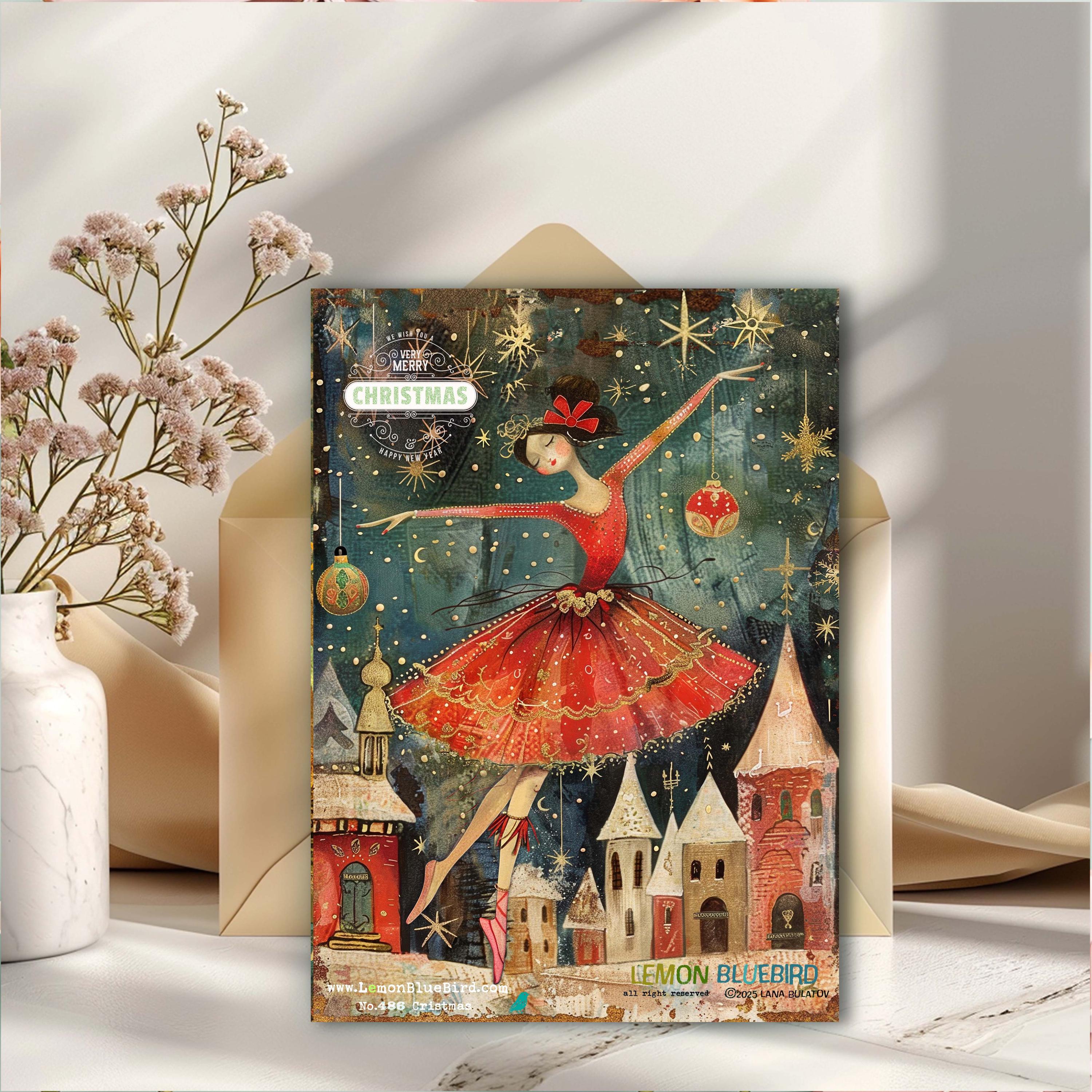 โ๏ธ Christmas Ballerina Greeting Card No. 486 โ Nutcracker Inspired Holiday Card, Festive Red Dress, Vintage Whimsical Christmas Art๐