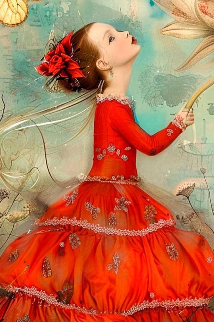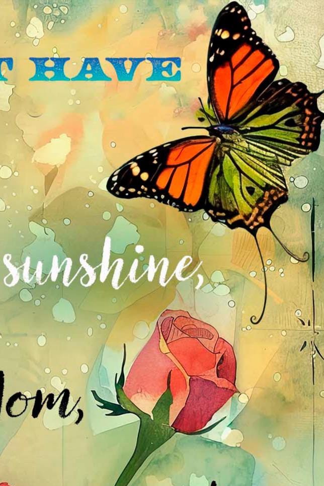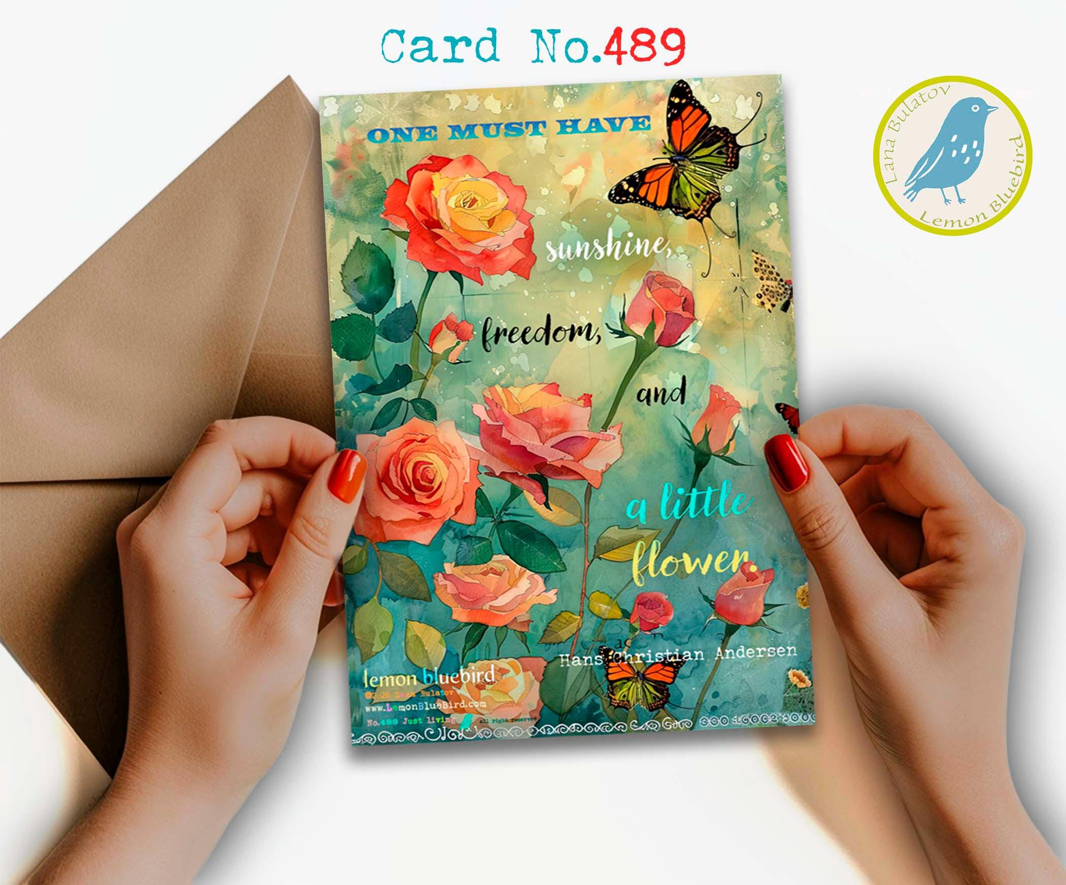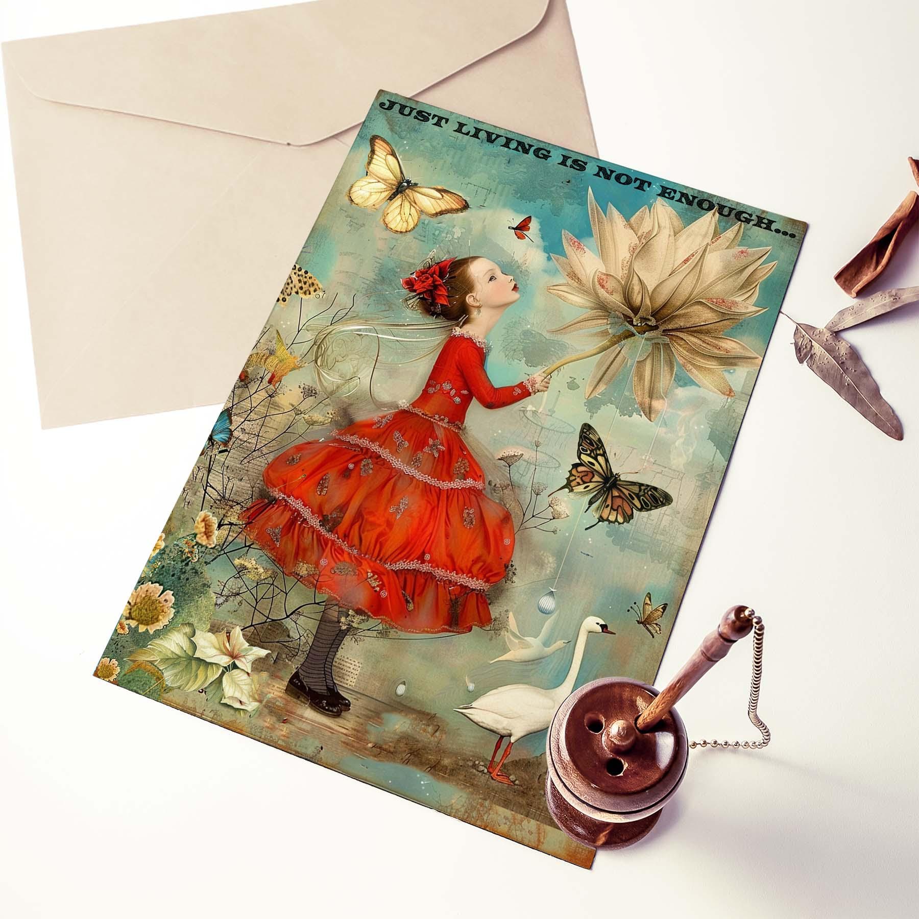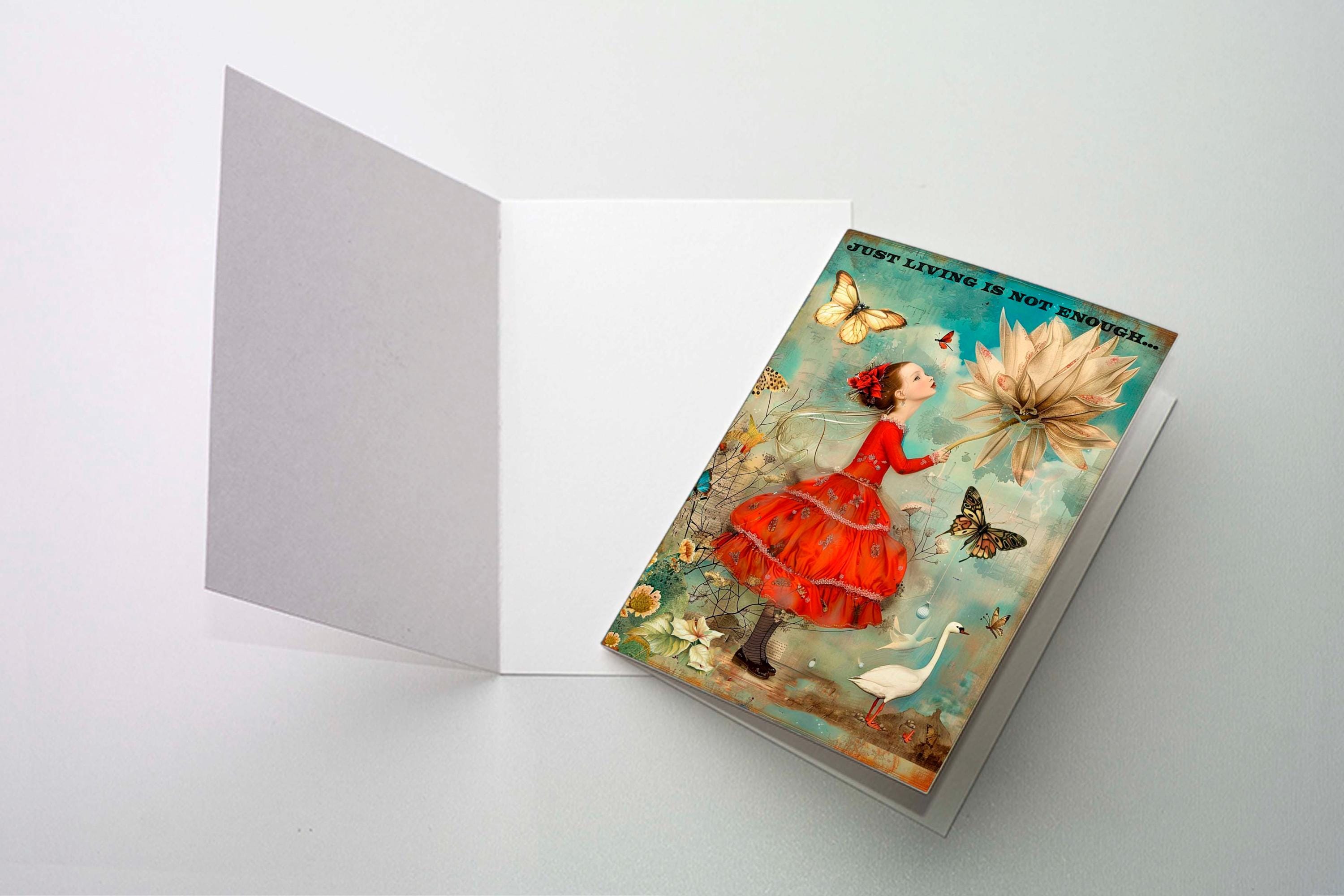 Whimsical greeting card featuring a dreamy fairy-tale illustration of a young girl in a red dress surrounded by butterflies and flowers. This artistic card showcases the timeless quote, “Just living is not enough… one must have sunshine, freedom, and a little flower,” making it a meaningful choice for birthdays, encouragement, or thoughtful everyday notes.