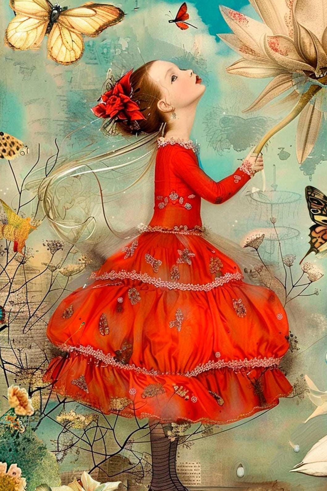 Whimsical greeting card featuring a dreamy fairy-tale illustration of a young girl in a red dress surrounded by butterflies and flowers. This artistic card showcases the timeless quote, “Just living is not enough… one must have sunshine, freedom, and a little flower,†making it a meaningful choice for birthdays, encouragement, or thoughtful everyday notes.