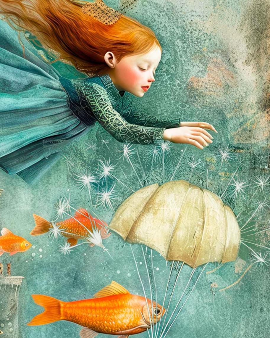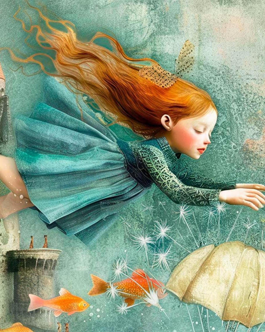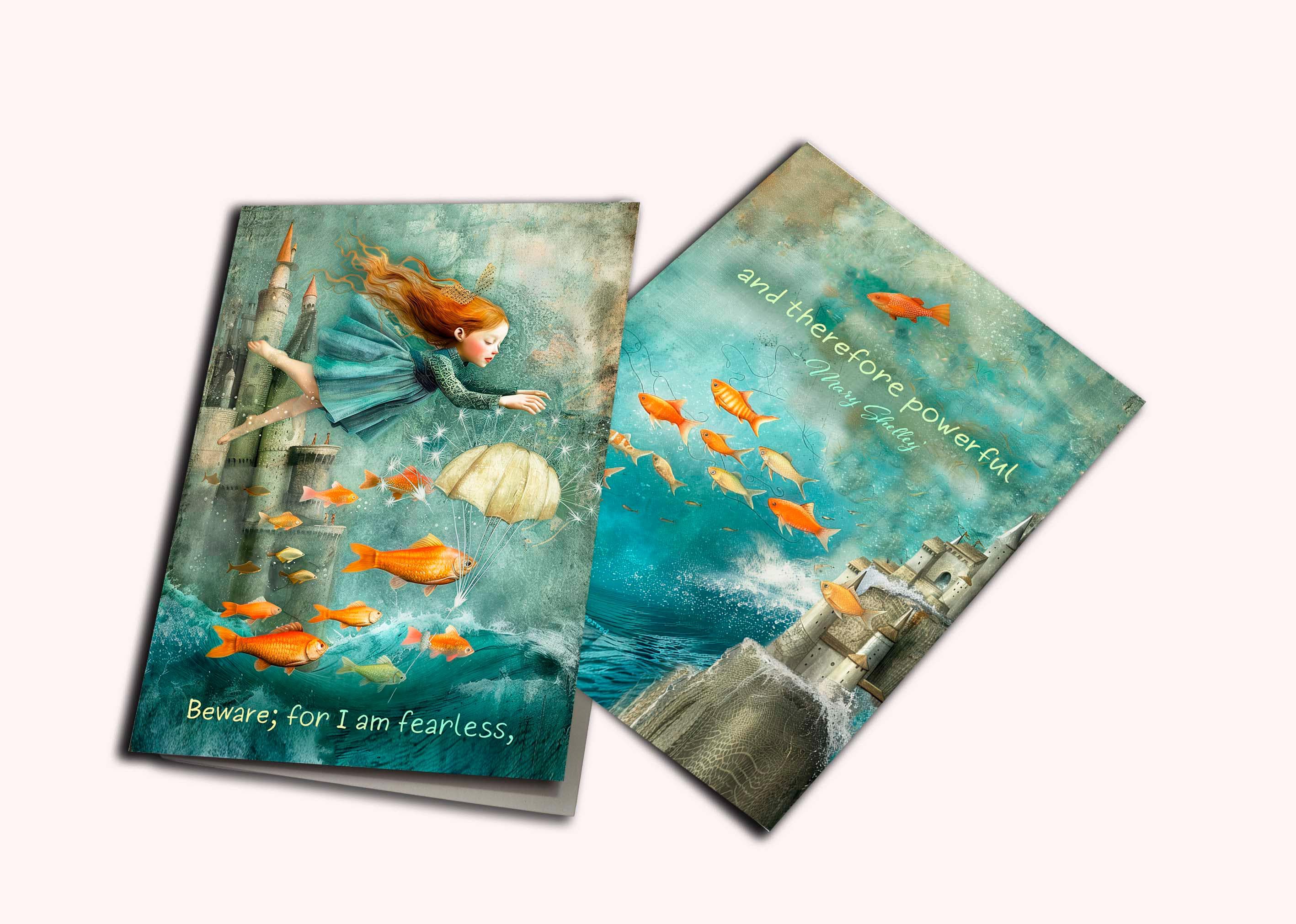 A dreamy, storybook-inspired greeting card featuring a fearless girl drifting through a surreal seascape of turquoise waves, golden fish, and a towering fairytale castle. Soft textures, flowing motion, and a magical underwater atmosphere create a sense of courage, imagination, and quiet strength.