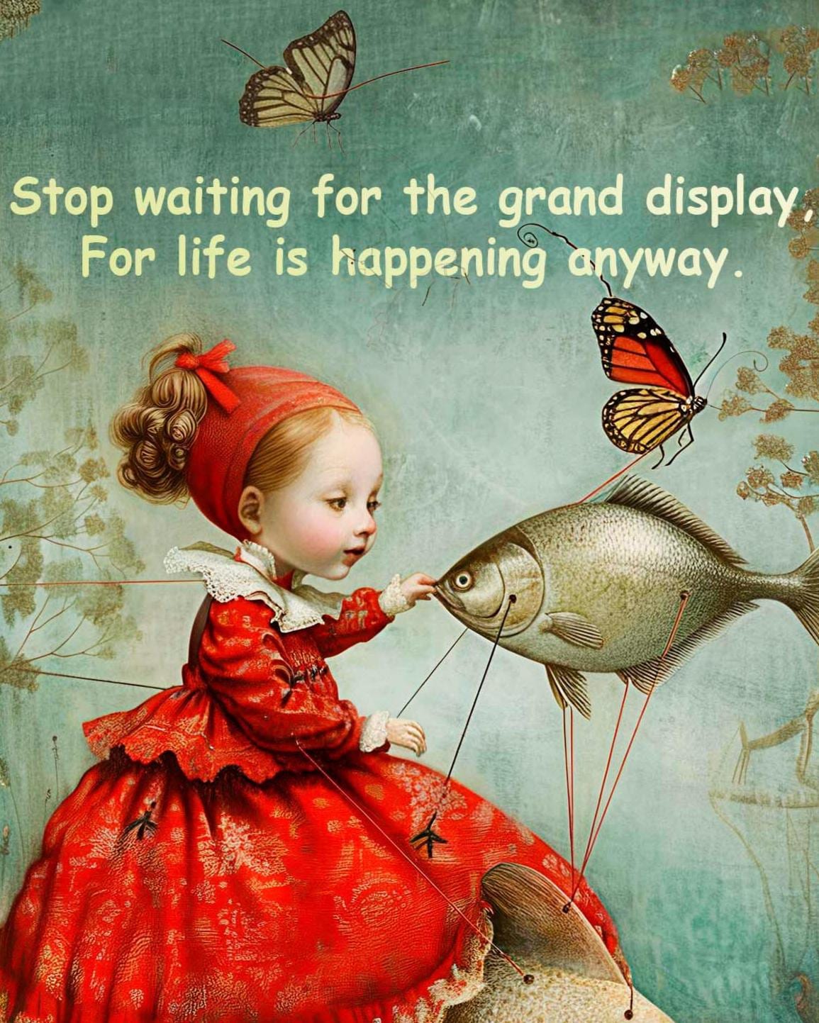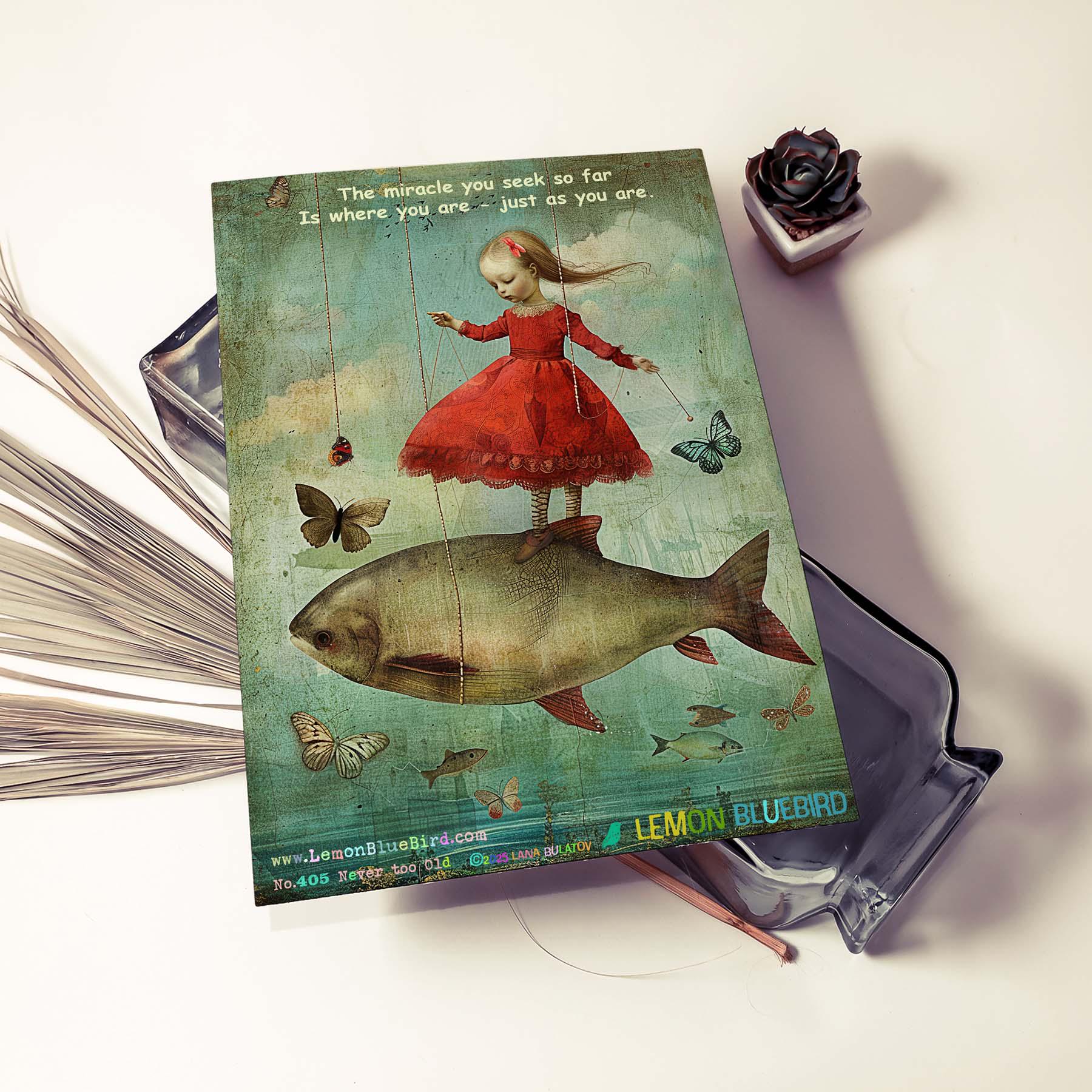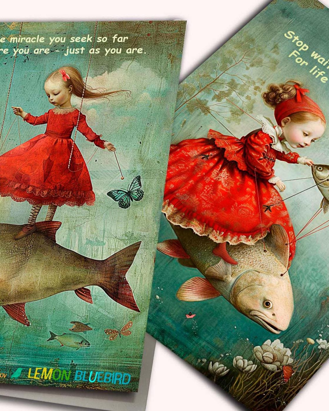A sweet little girl in a rich red dress stands gently on the back of a giant fish, like she’s balancing in a magical world. Soft butterflies float around her in a muted teal-green background that feels textured and antique.
