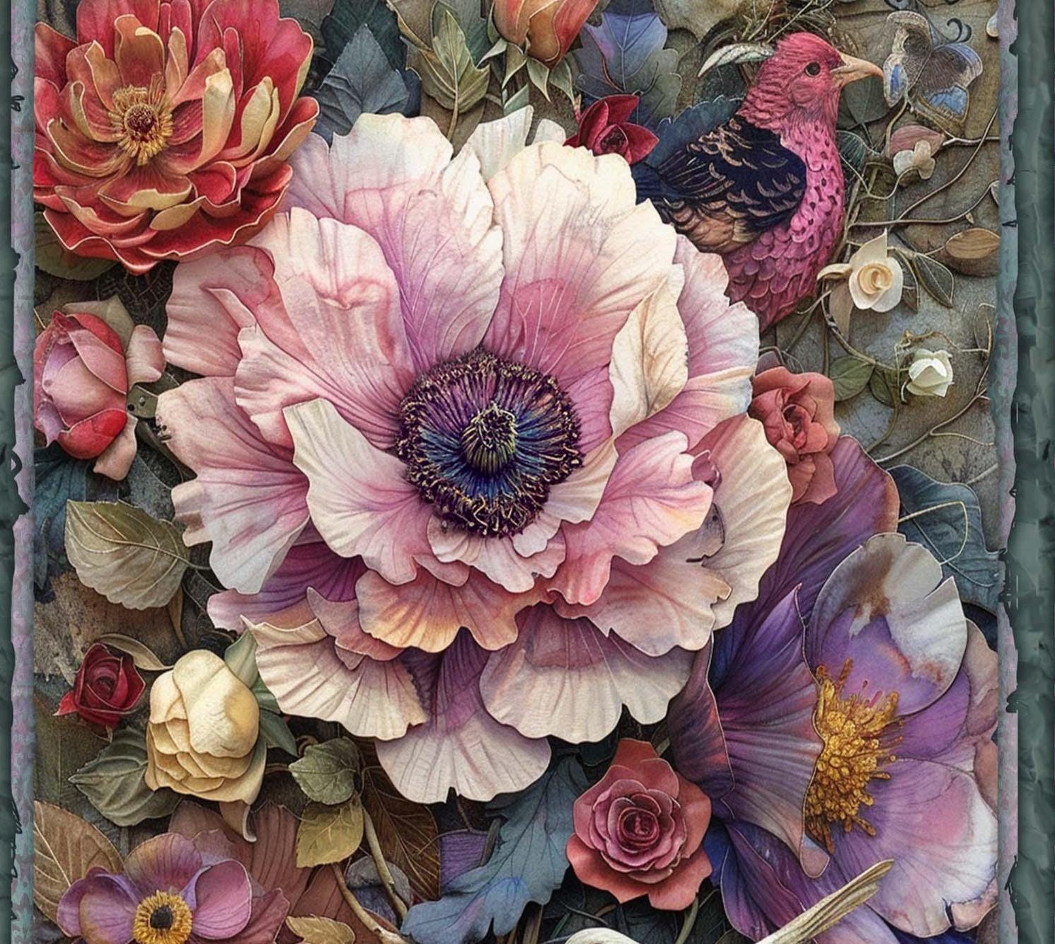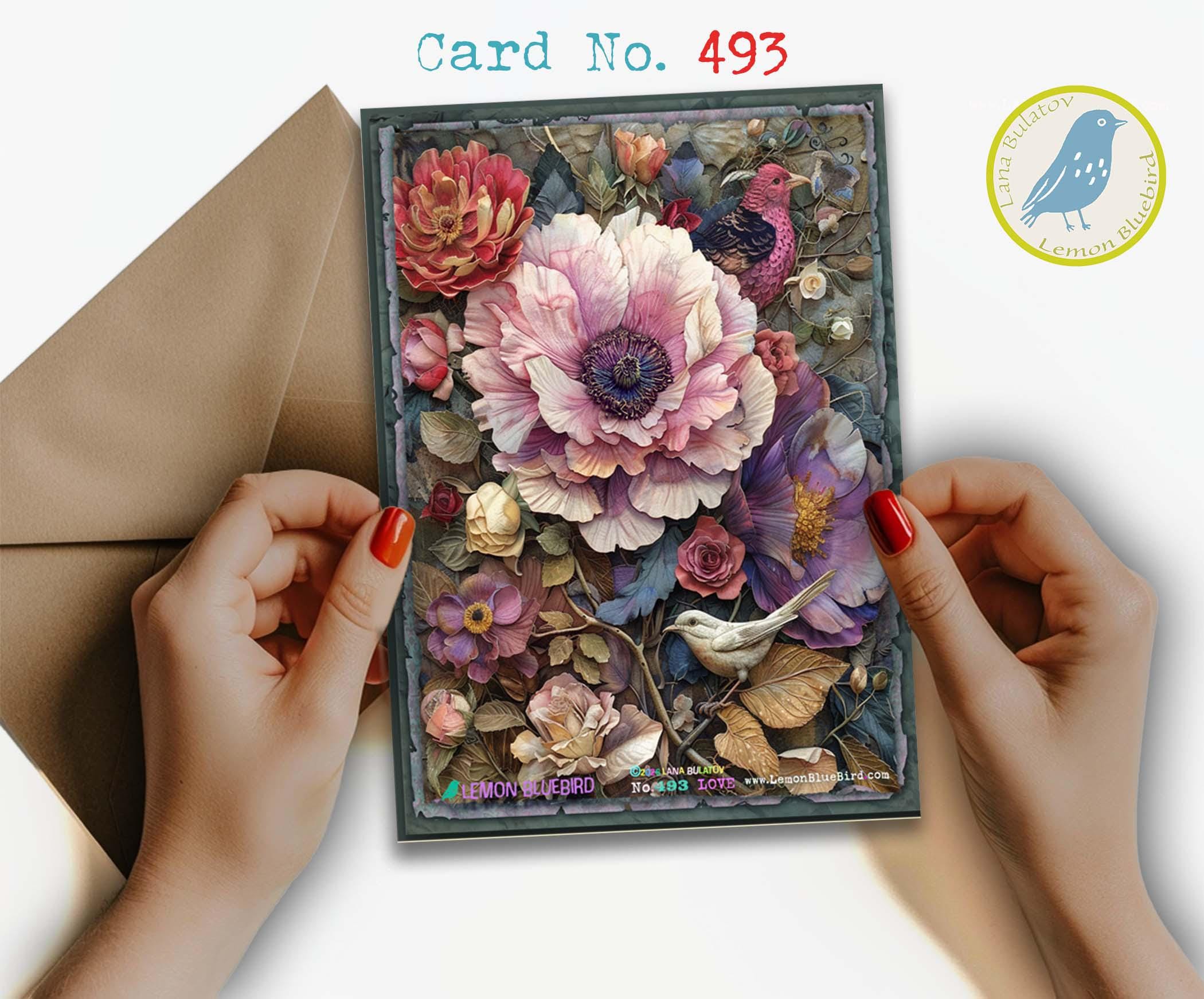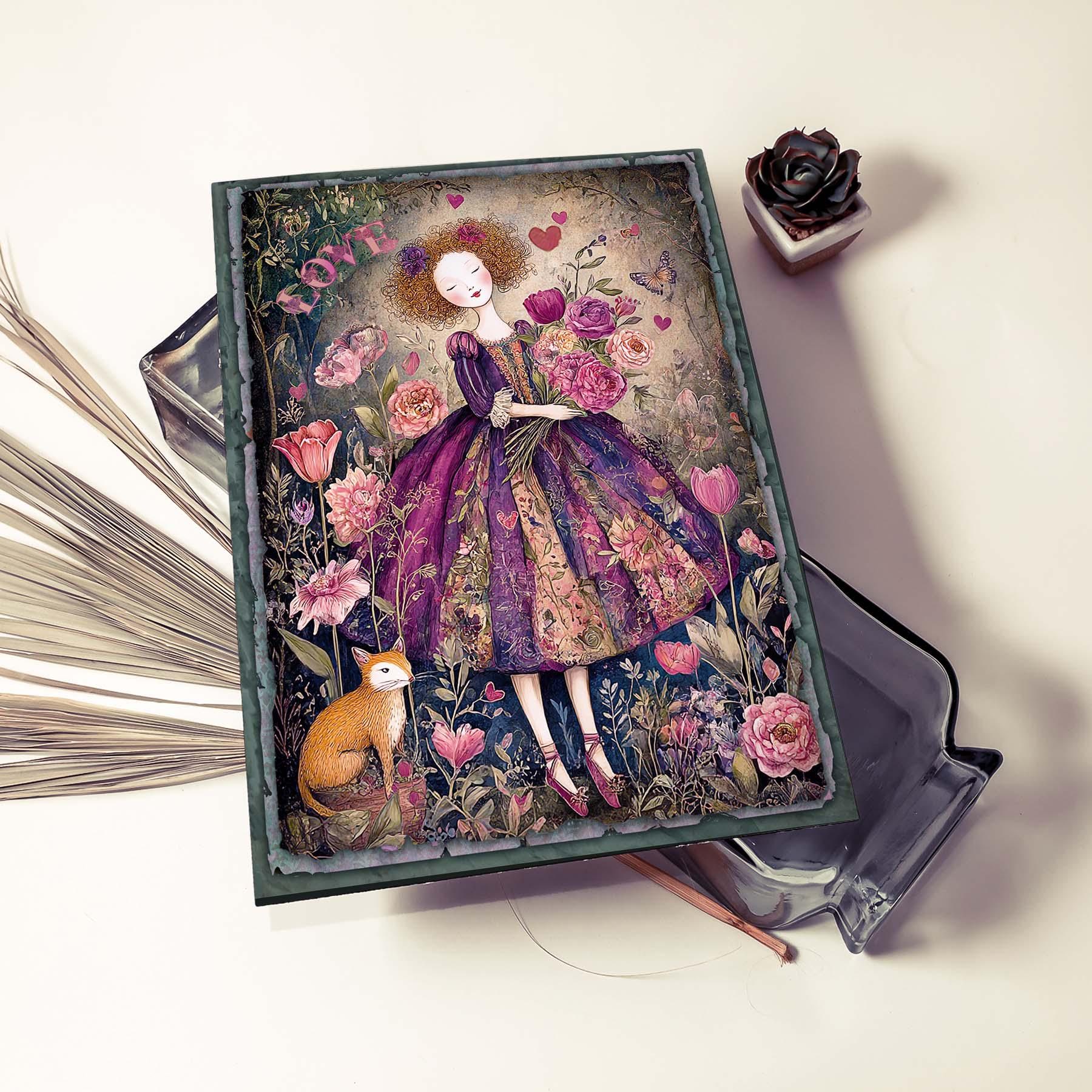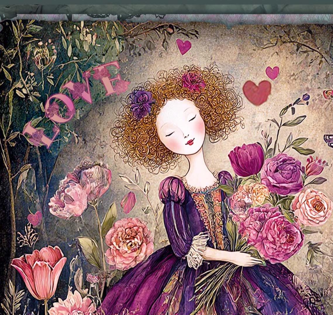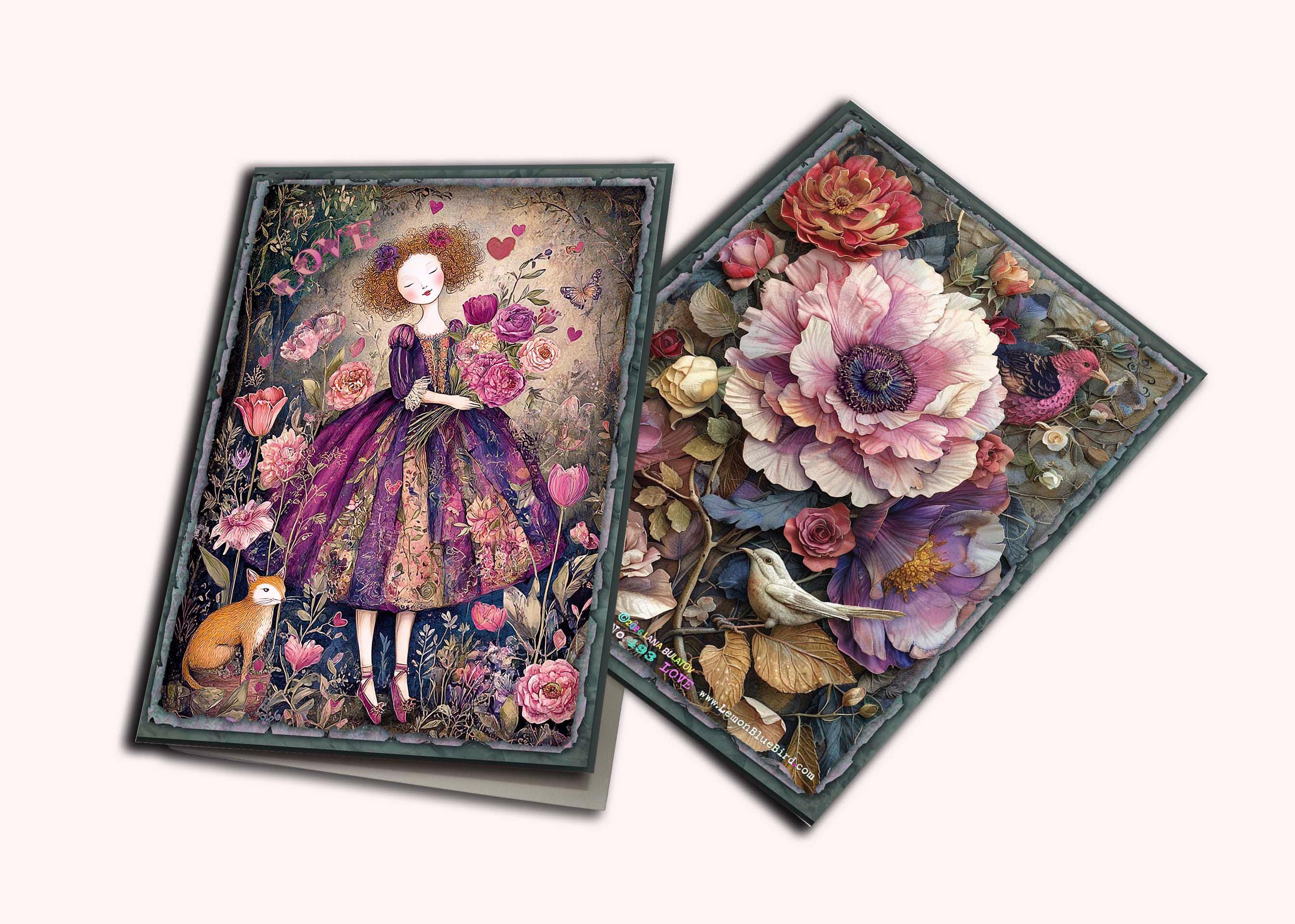 โคThis whimsical vintage-inspired greeting card feels like a little fairytale on paper. A sweet curly-haired girl in a rich purple dress stands among blooming roses and wildflowers, with delicate birds and antique botanical details woven throughout. The textured, painterly background adds that perfect old-world charm and romantic vintage flair.