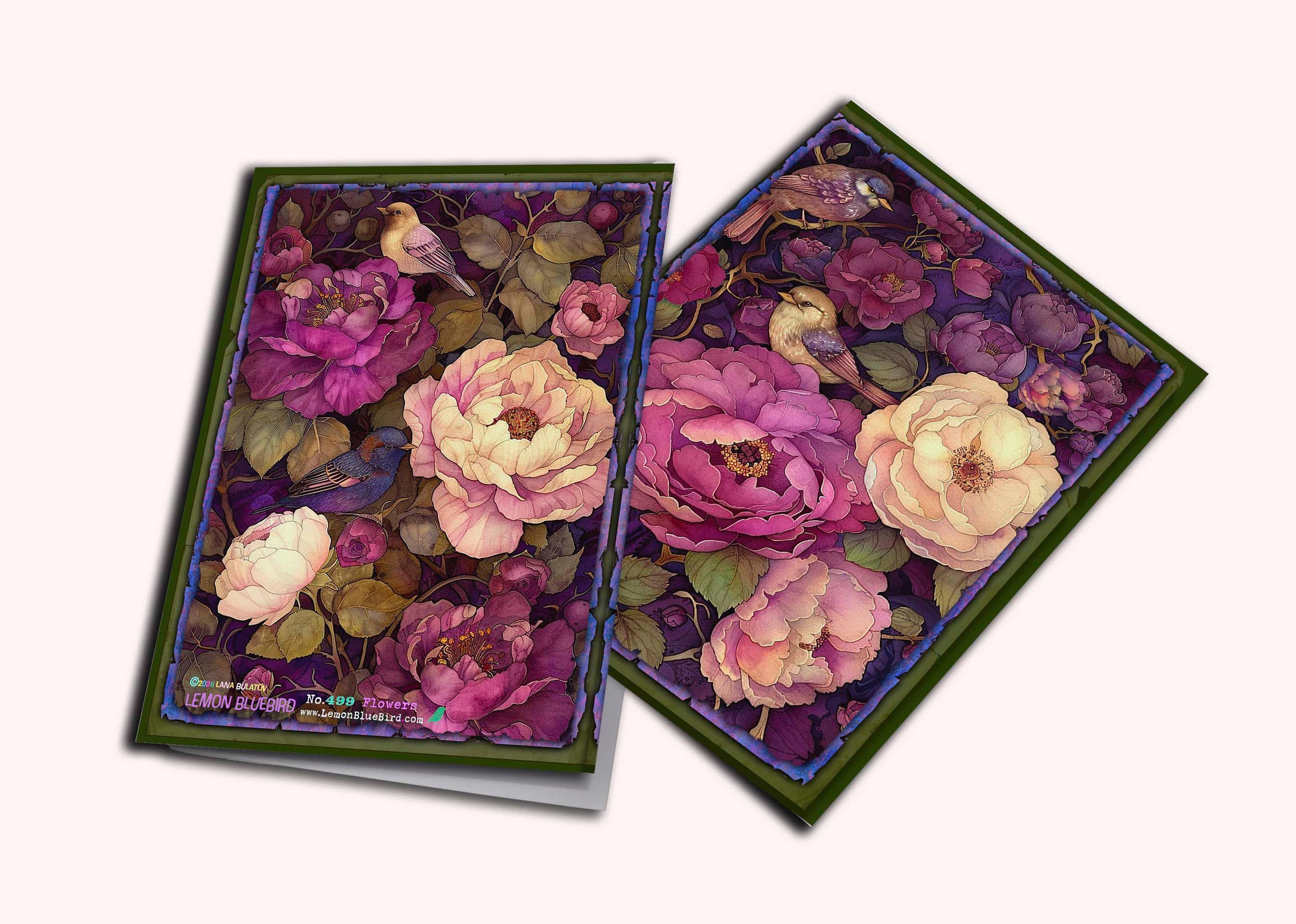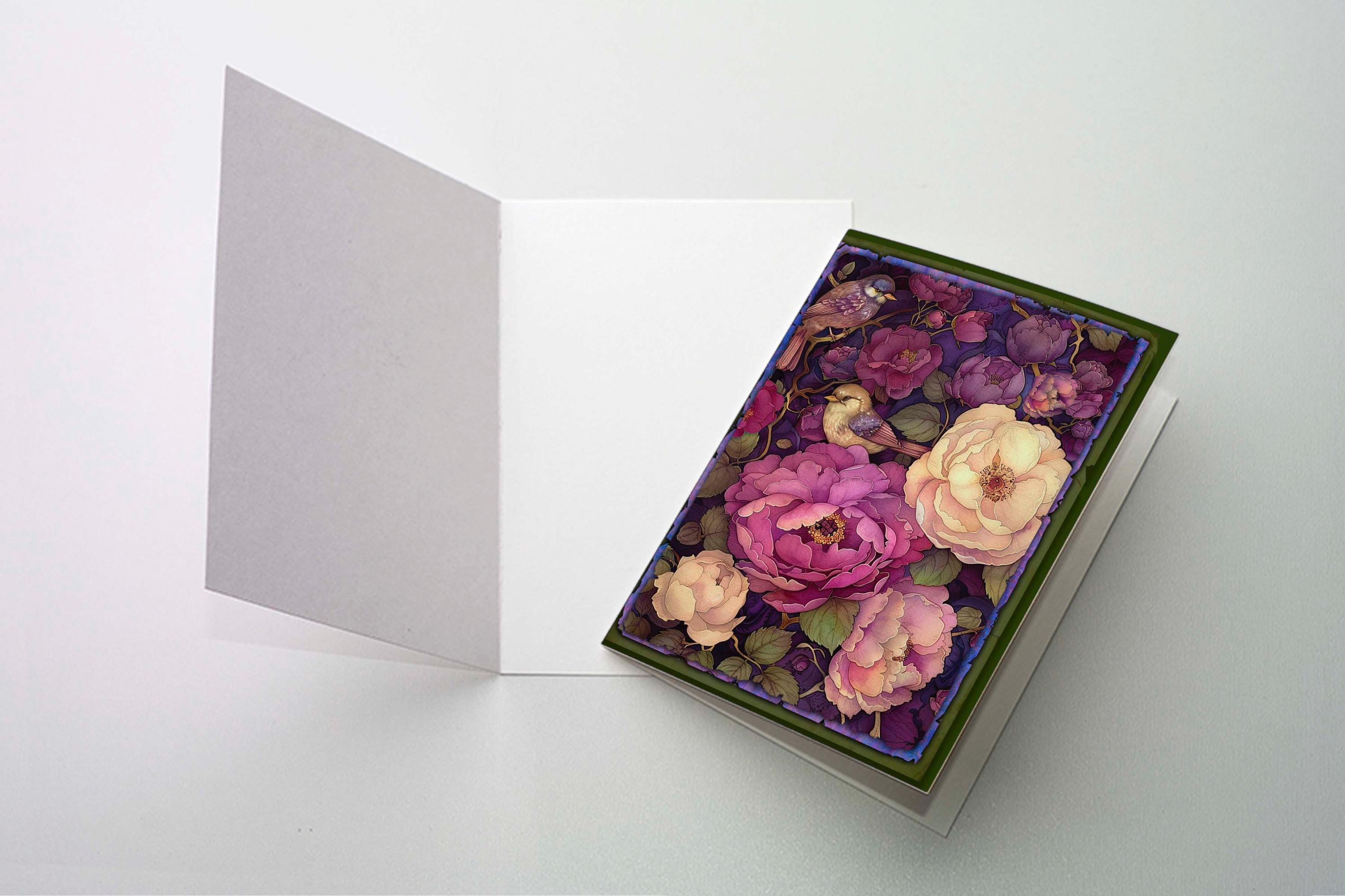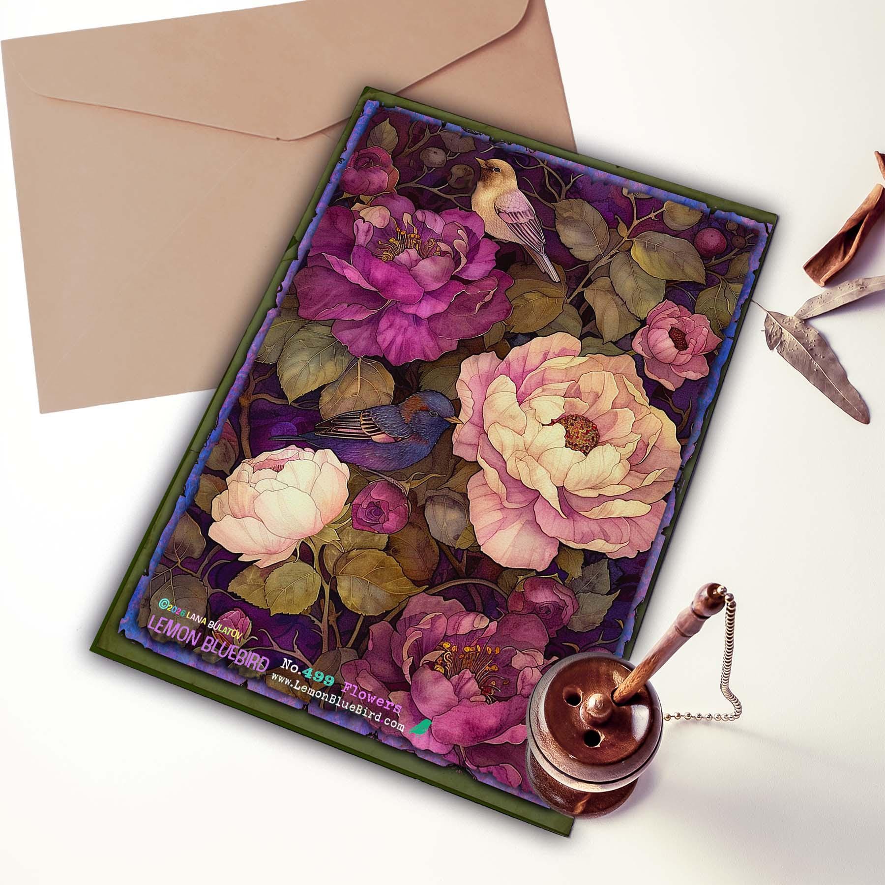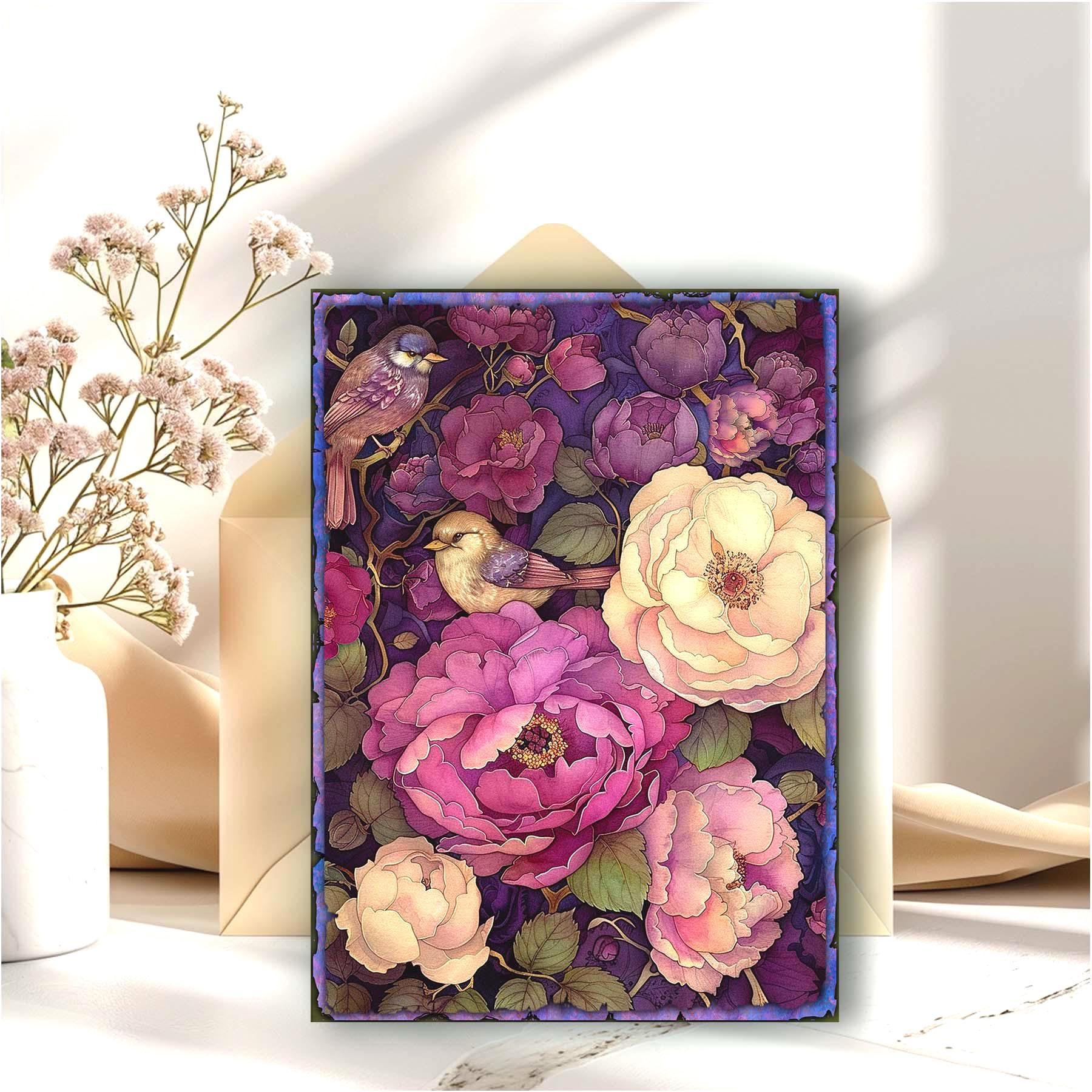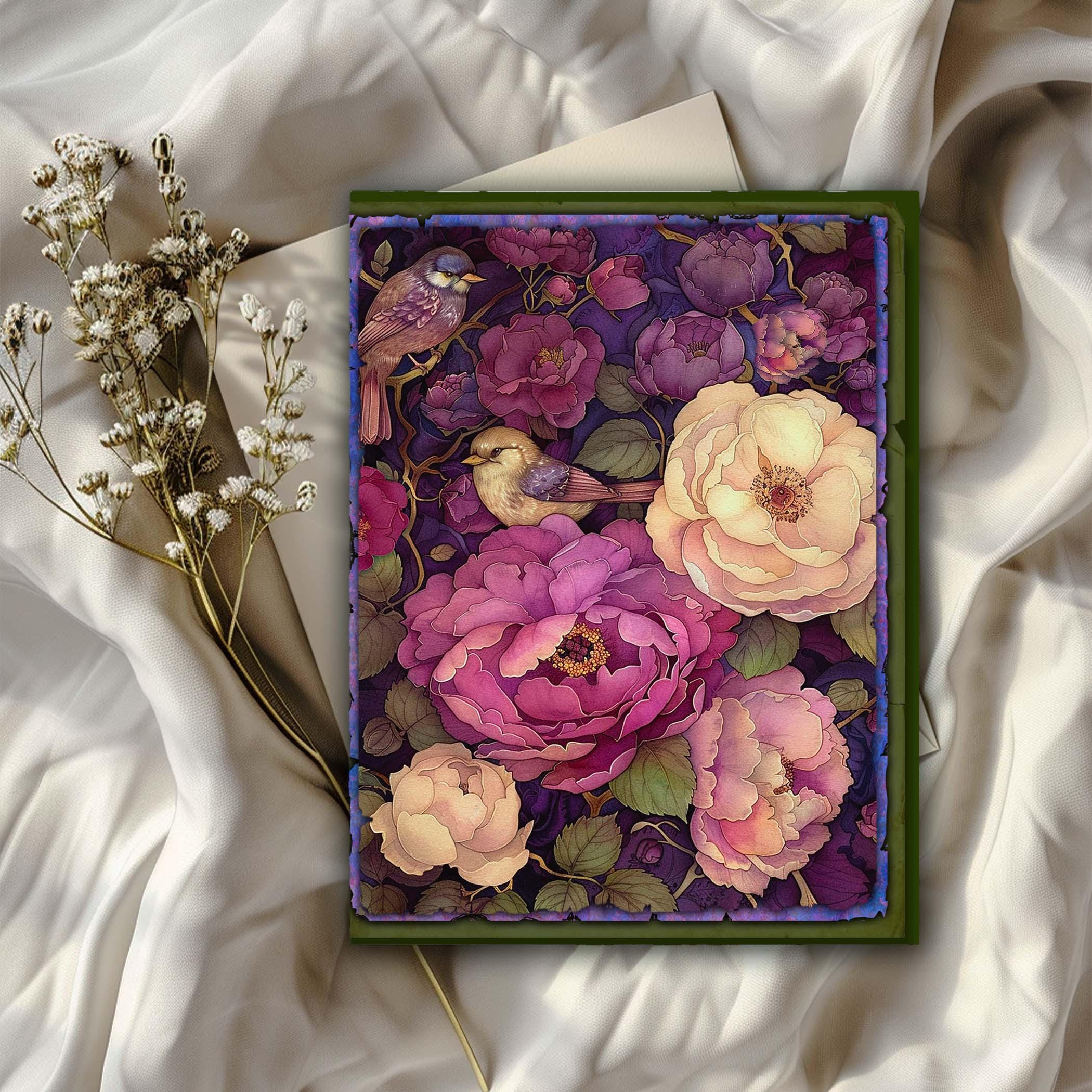 This enchanting Valentineโs card features lush florals in deep plum, blush, and antique rose tones. Delicate blossoms, and painterly textures create a timeless, storybook atmosphere filled with quiet romance and gentle emotion. Small birds rest in flowers, symbolizing tenderness, trust, and heartfelt connection.