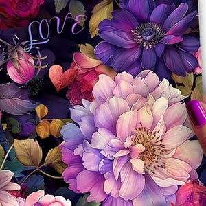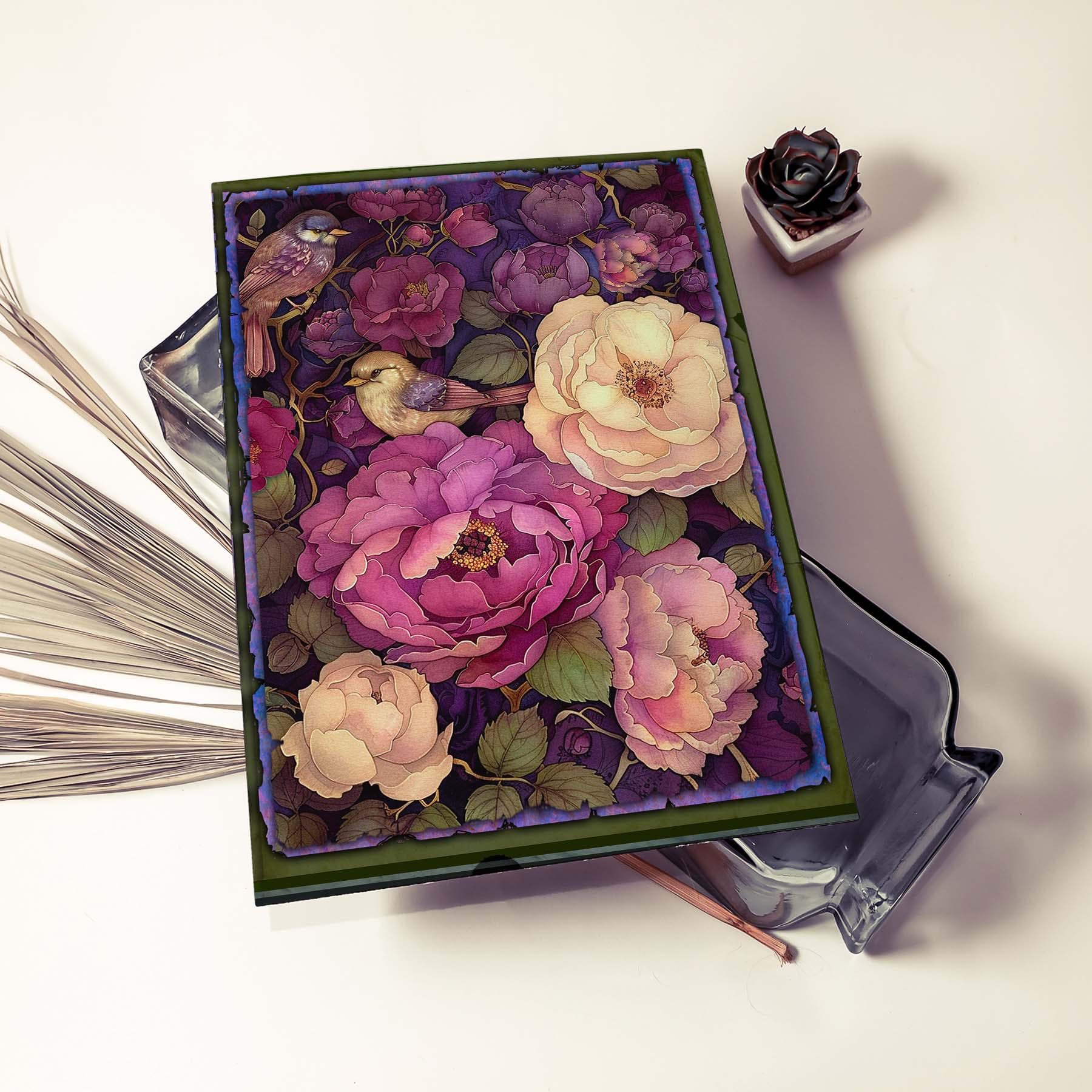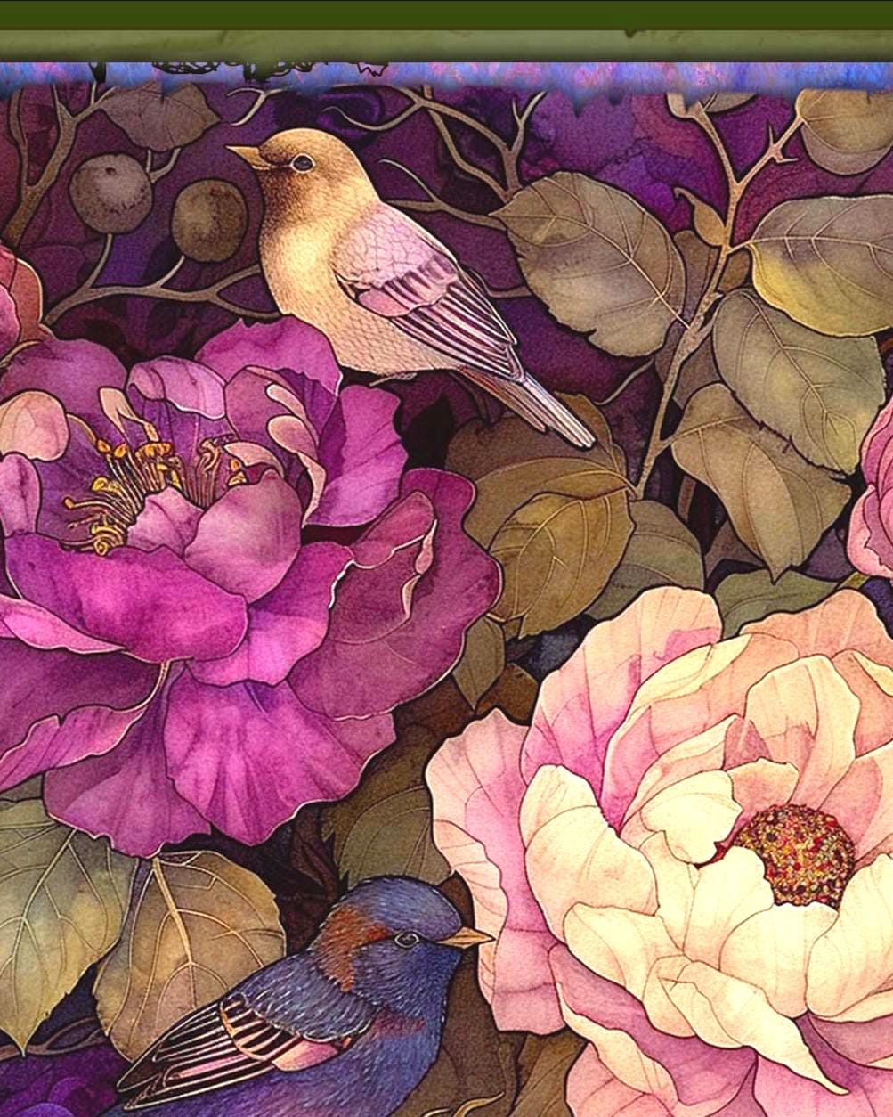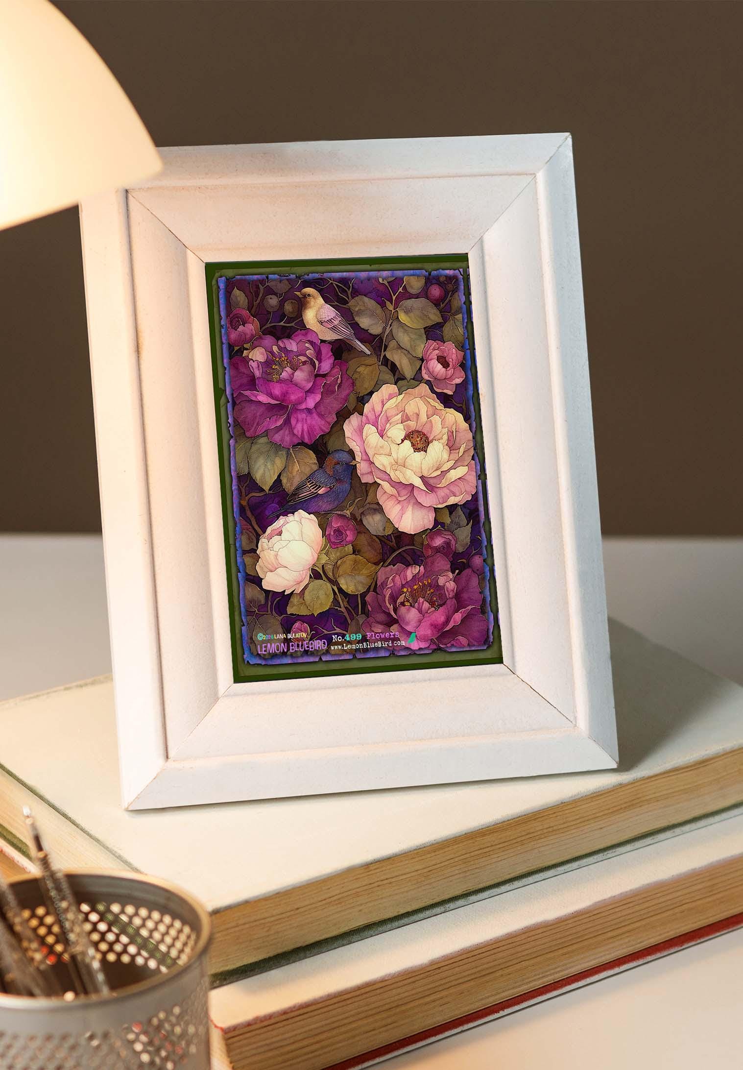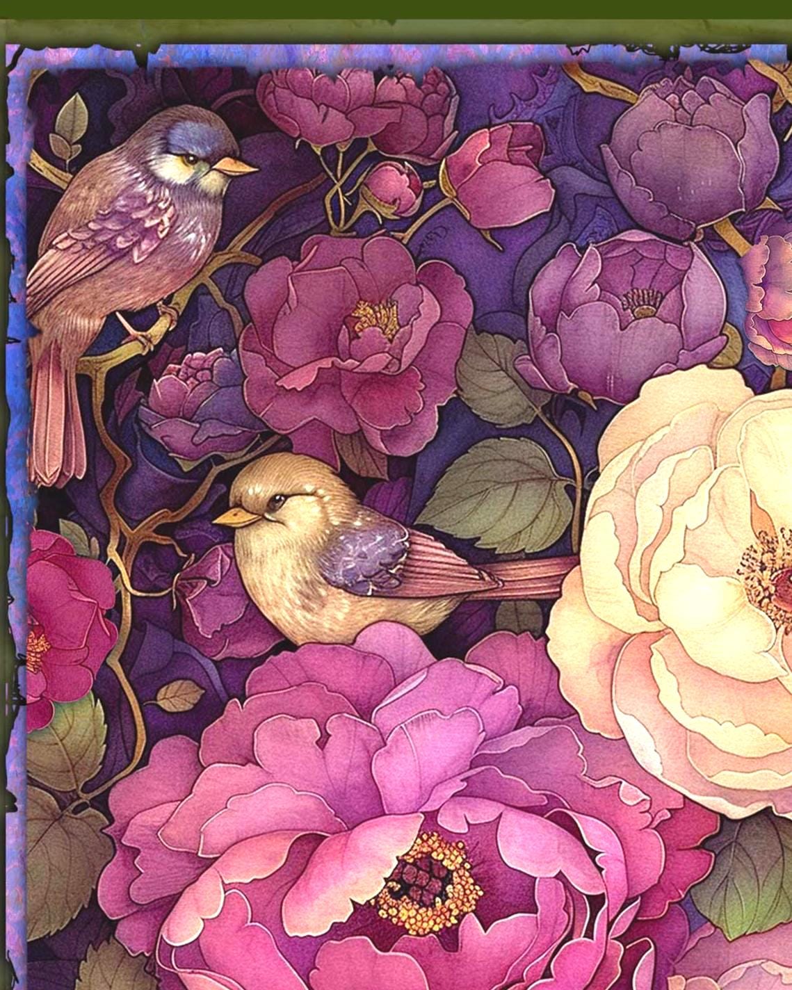 This enchanting Valentineโs card features lush florals in deep plum, blush, and antique rose tones. Delicate blossoms, and painterly textures create a timeless, storybook atmosphere filled with quiet romance and gentle emotion. Small birds rest in flowers, symbolizing tenderness, trust, and heartfelt connection.