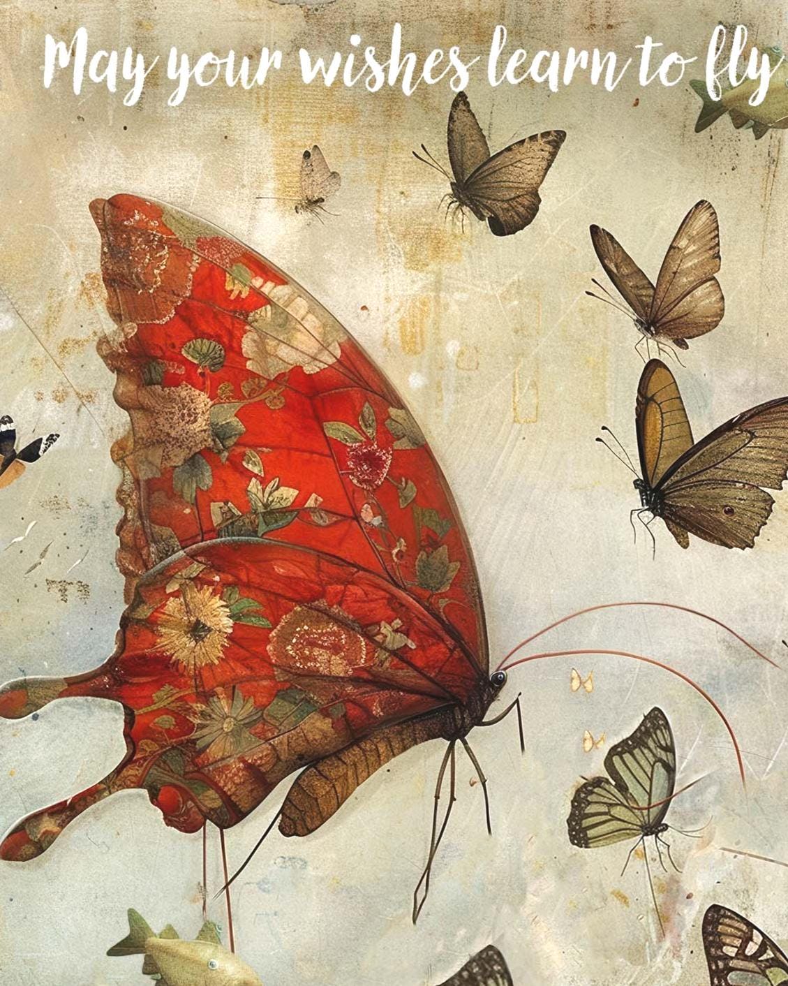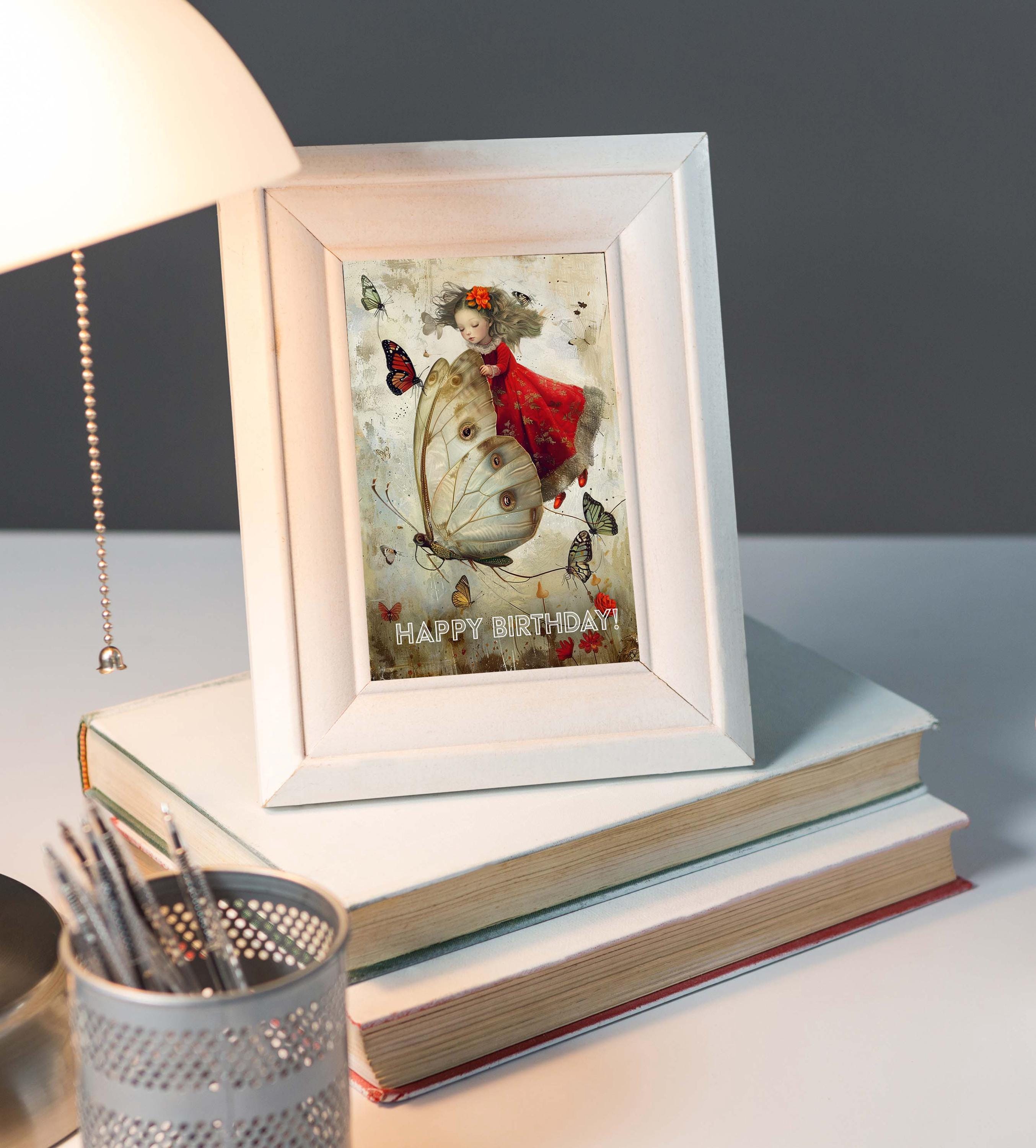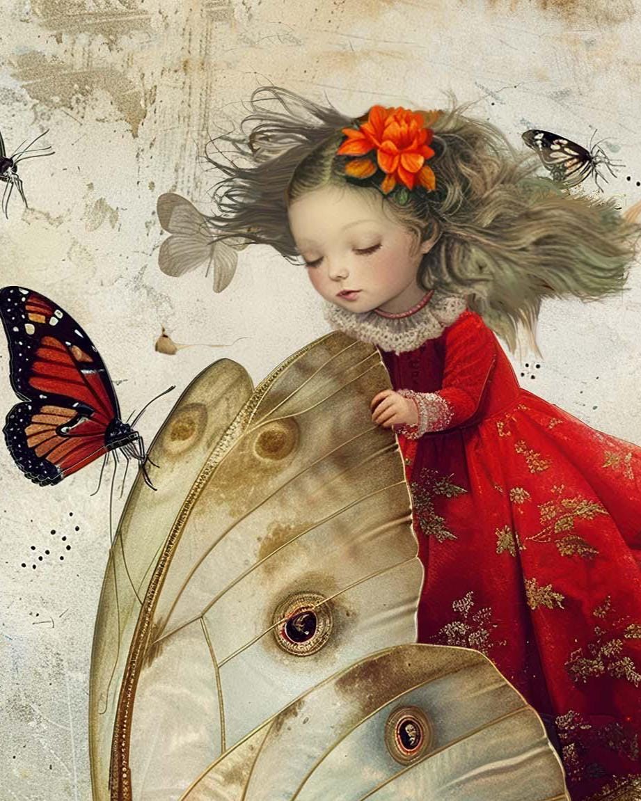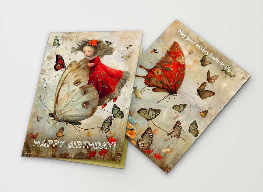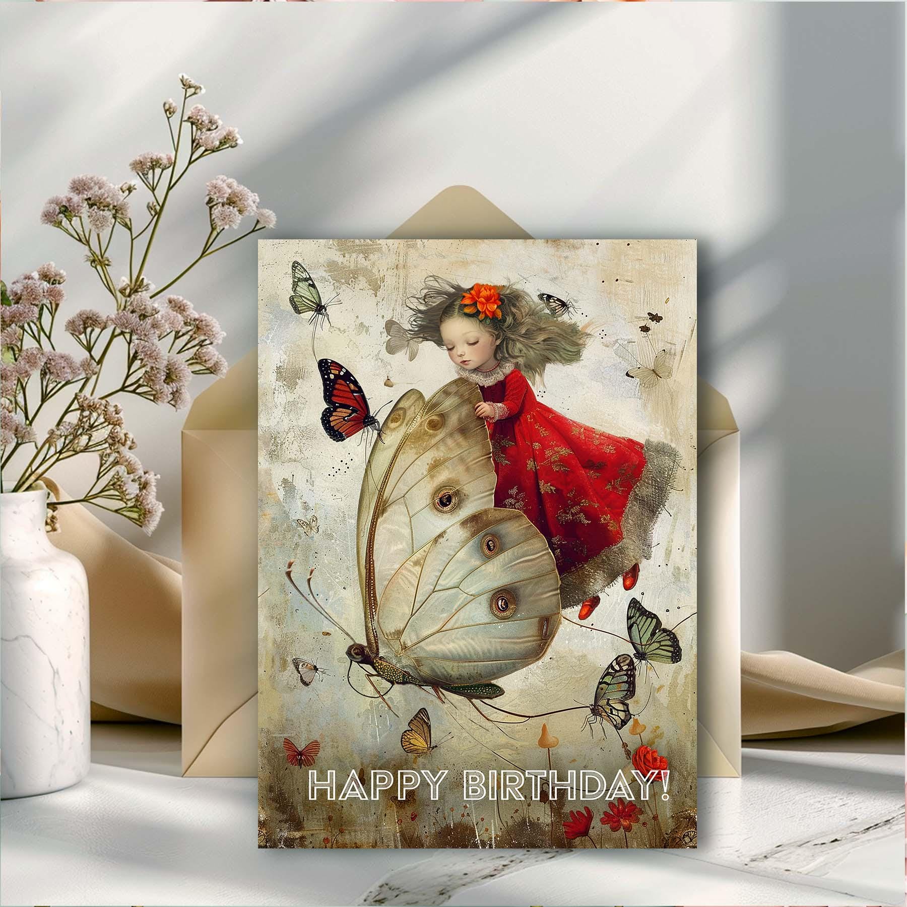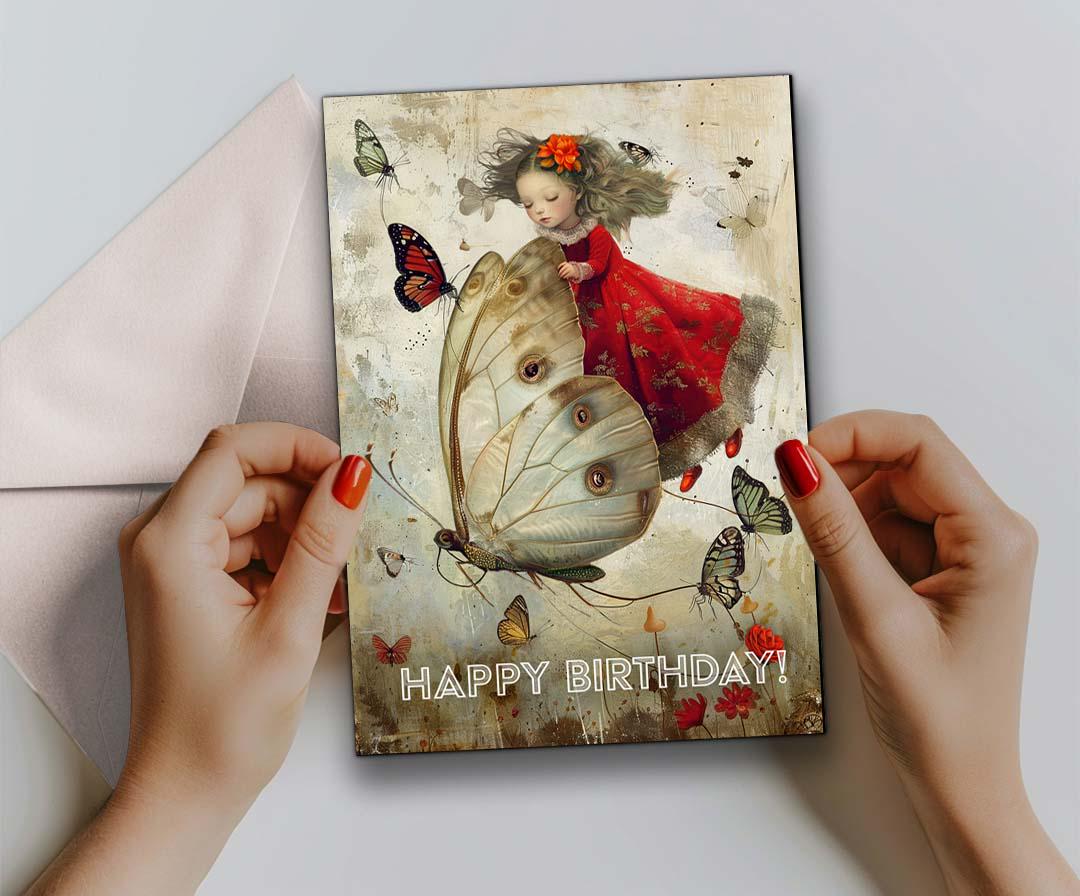 A dreamy, storybook-inspired birthday card featuring a delicate young girl in a flowing red dress riding on the wings of a luminous butterfly. Surrounding her, warm-toned butterflies flutter across a softly textured, vintage-style background in muted creams, and warm earth tones.