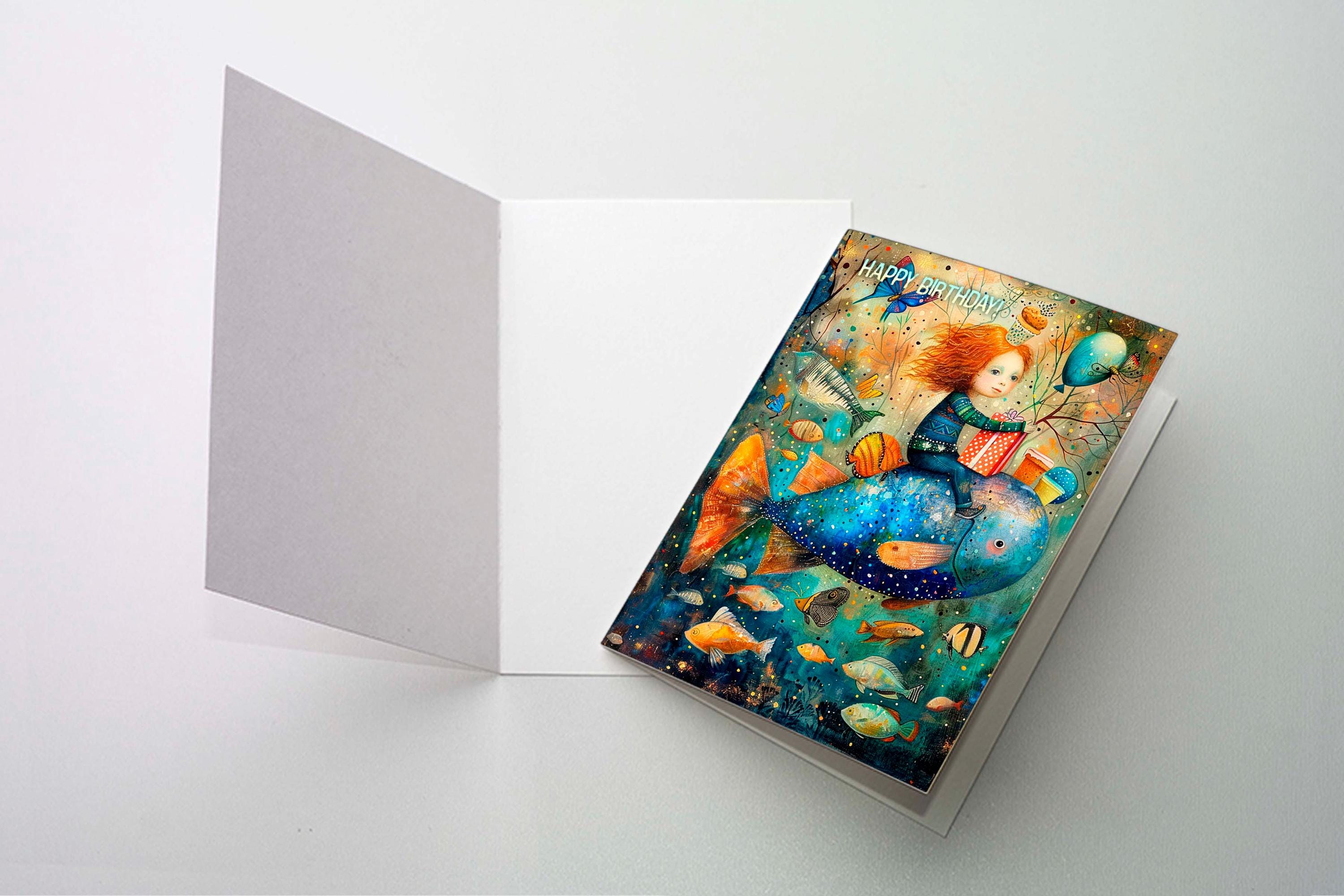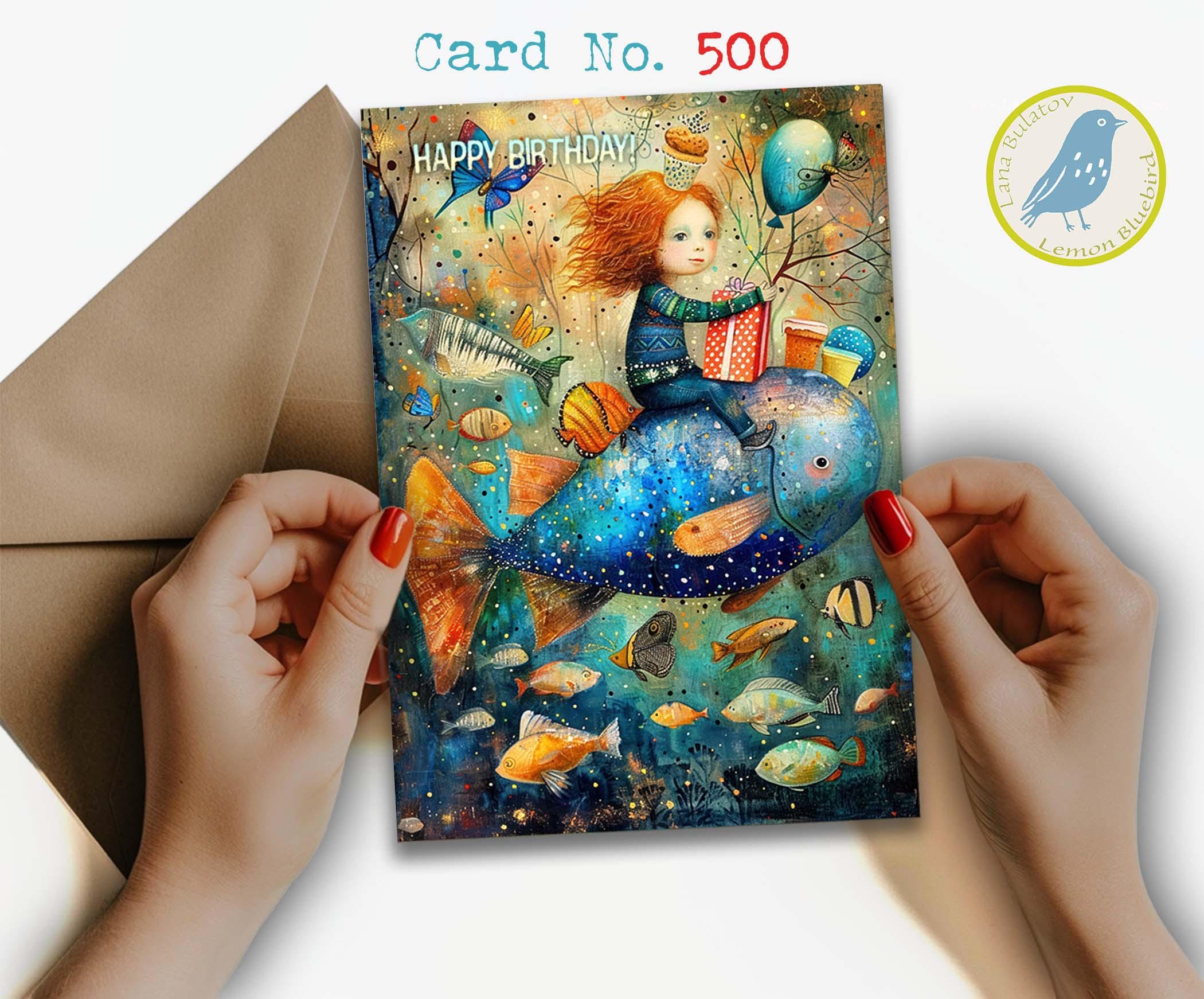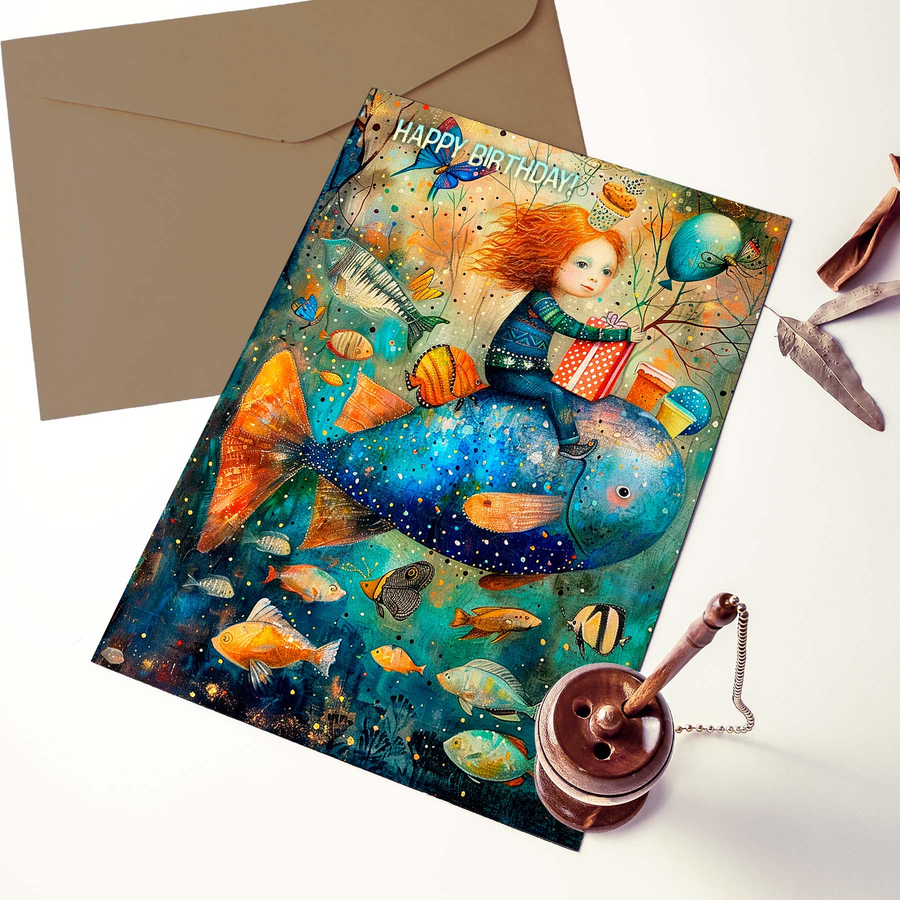 ๐Make their birthday extra special with this whimsical birthday card featuring a magical underwater scene filled with colorful fish, balloons, butterflies, and a child riding a giant blue fish with a birthday gift in hand. This artistic birthday card has a dreamy, storybook feel and is perfect for anyone who loves imaginative artwork, ocean themes, and unique greeting cards.