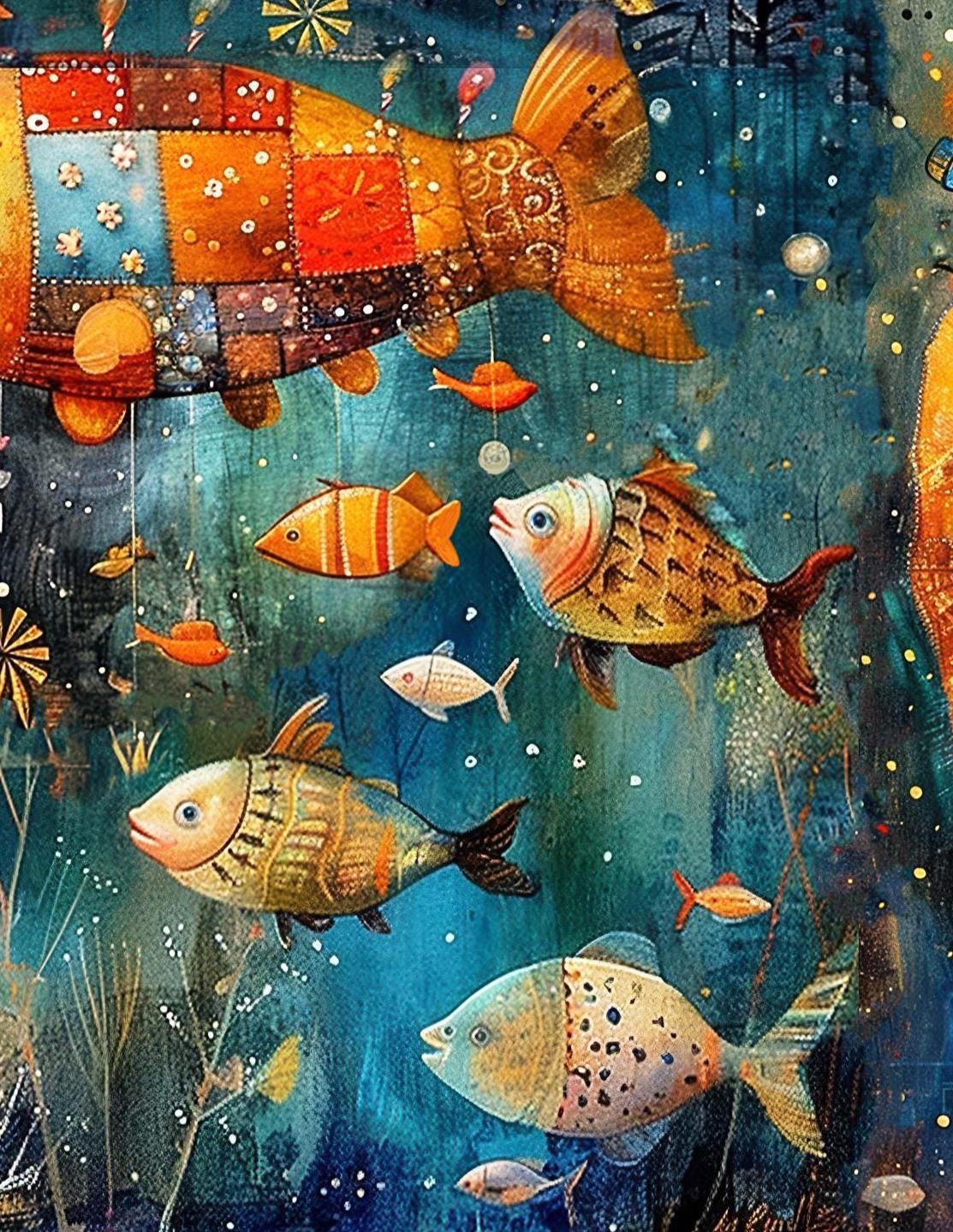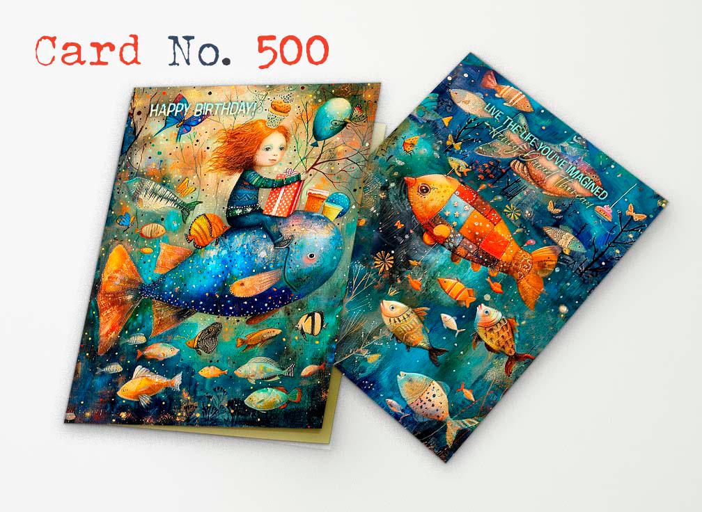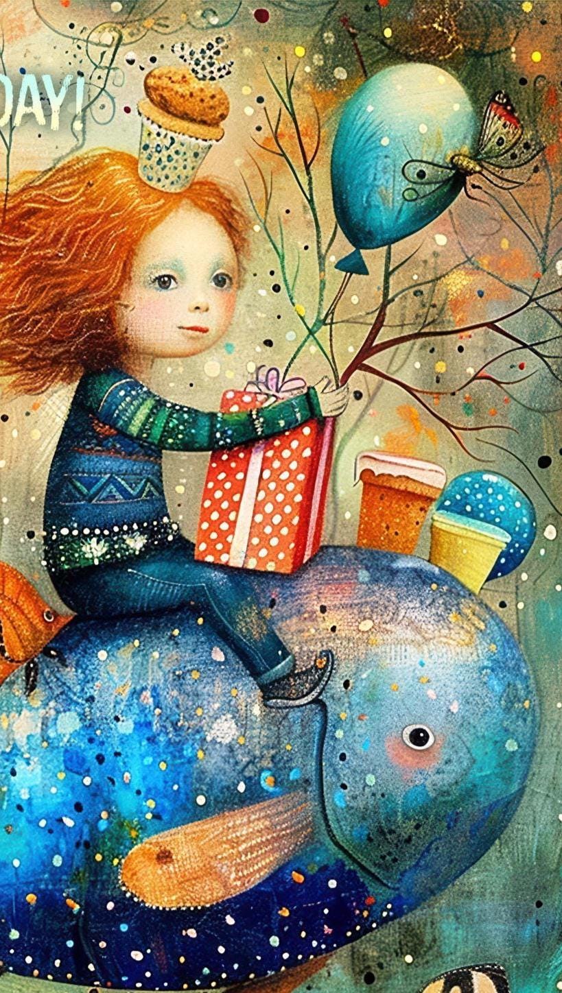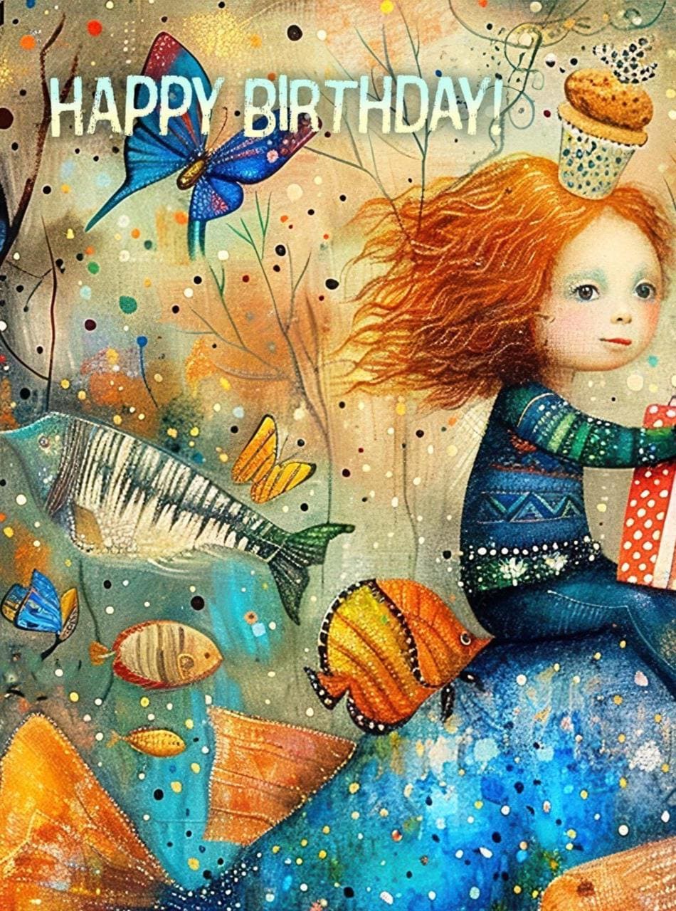 ๐Make their birthday extra special with this whimsical birthday card featuring a magical underwater scene filled with colorful fish, balloons, butterflies, and a child riding a giant blue fish with a birthday gift in hand. This artistic birthday card has a dreamy, storybook feel and is perfect for anyone who loves imaginative artwork, ocean themes, and unique greeting cards.