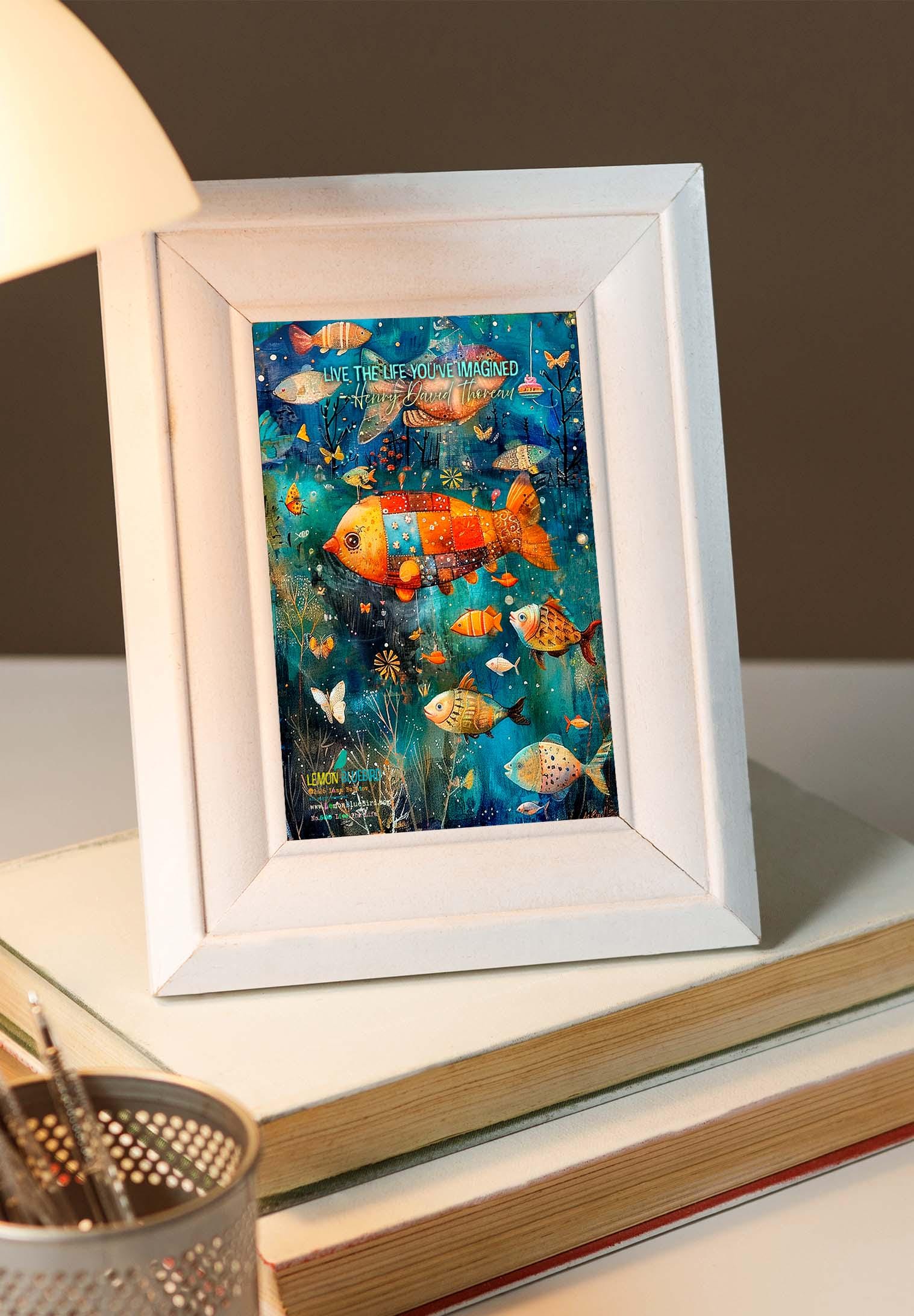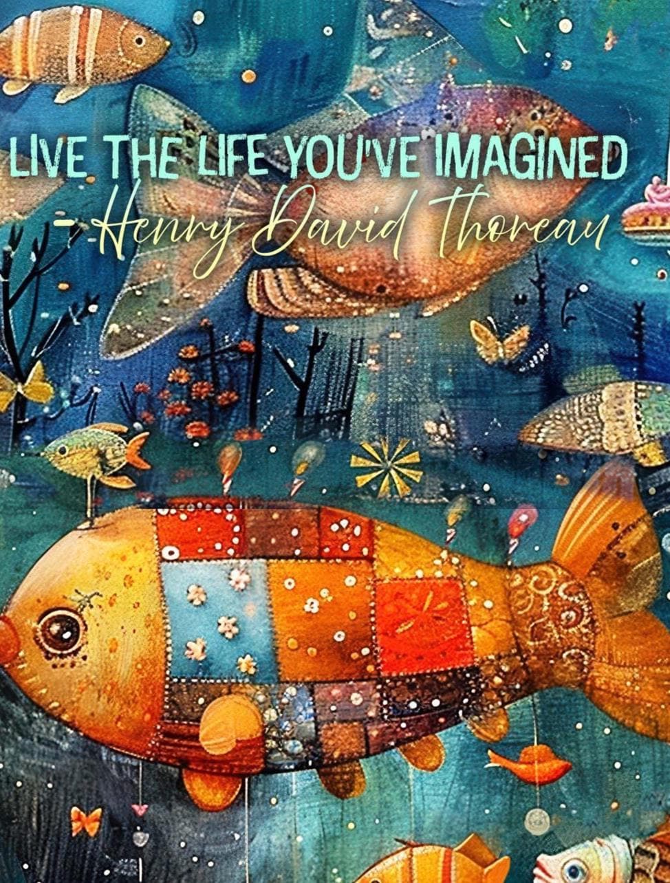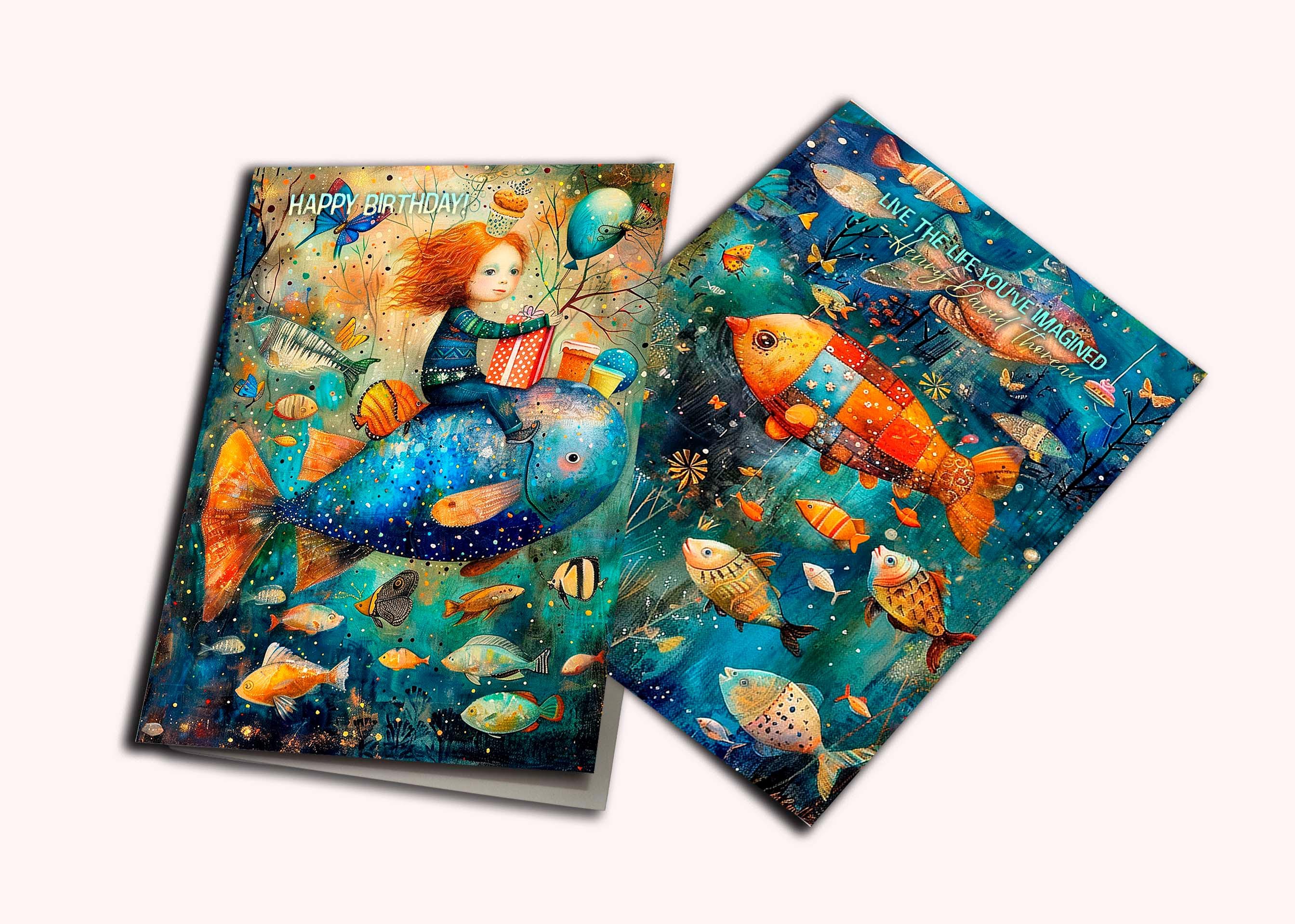 The front of the card features the inspiring quote โLive the life youโve imaginedโ and opens to a cheerful โHappy Birthdayโ message inside. Rich in color and detail, this underwater fantasy greeting card feels like a keepsake as much as a birthday card.