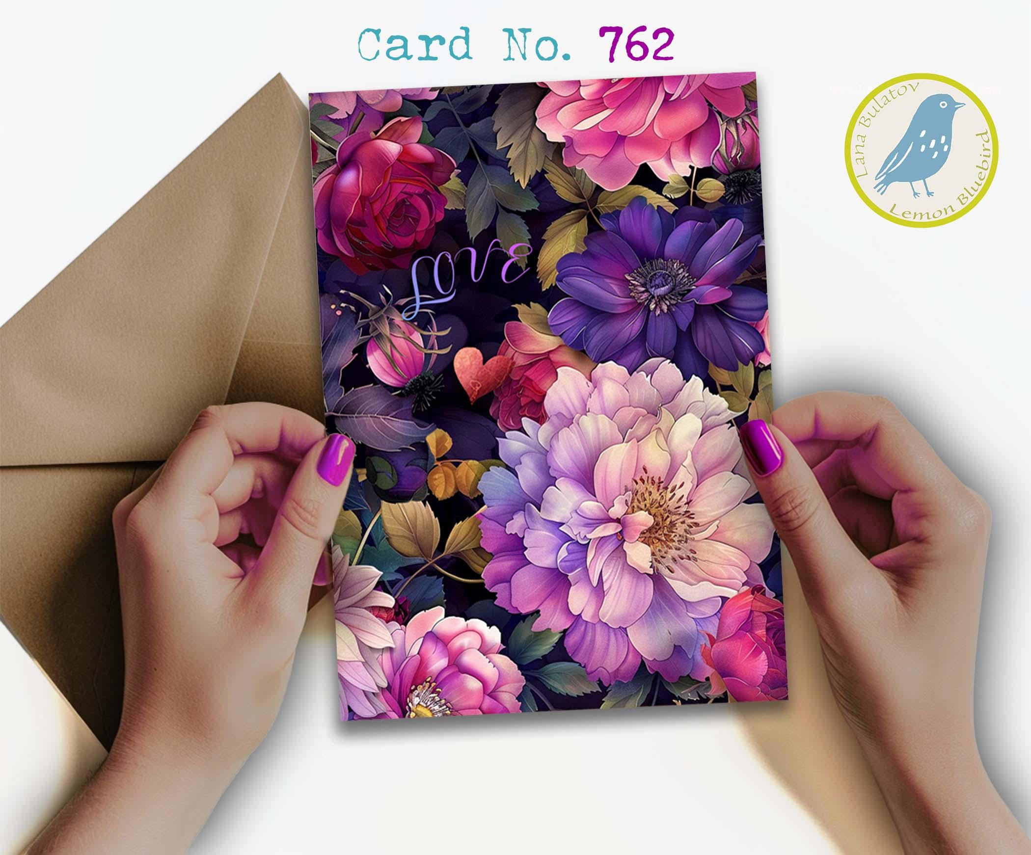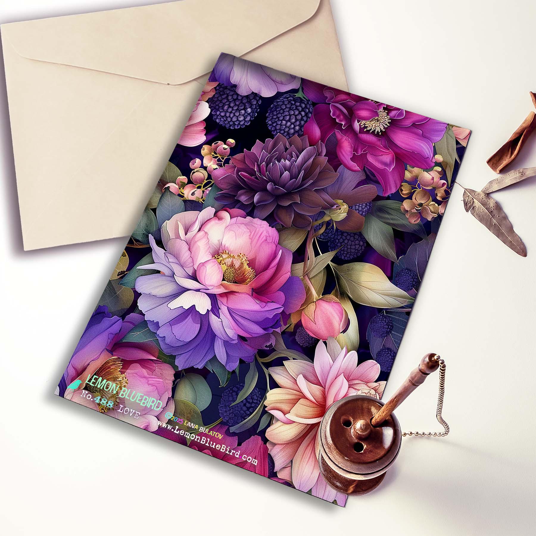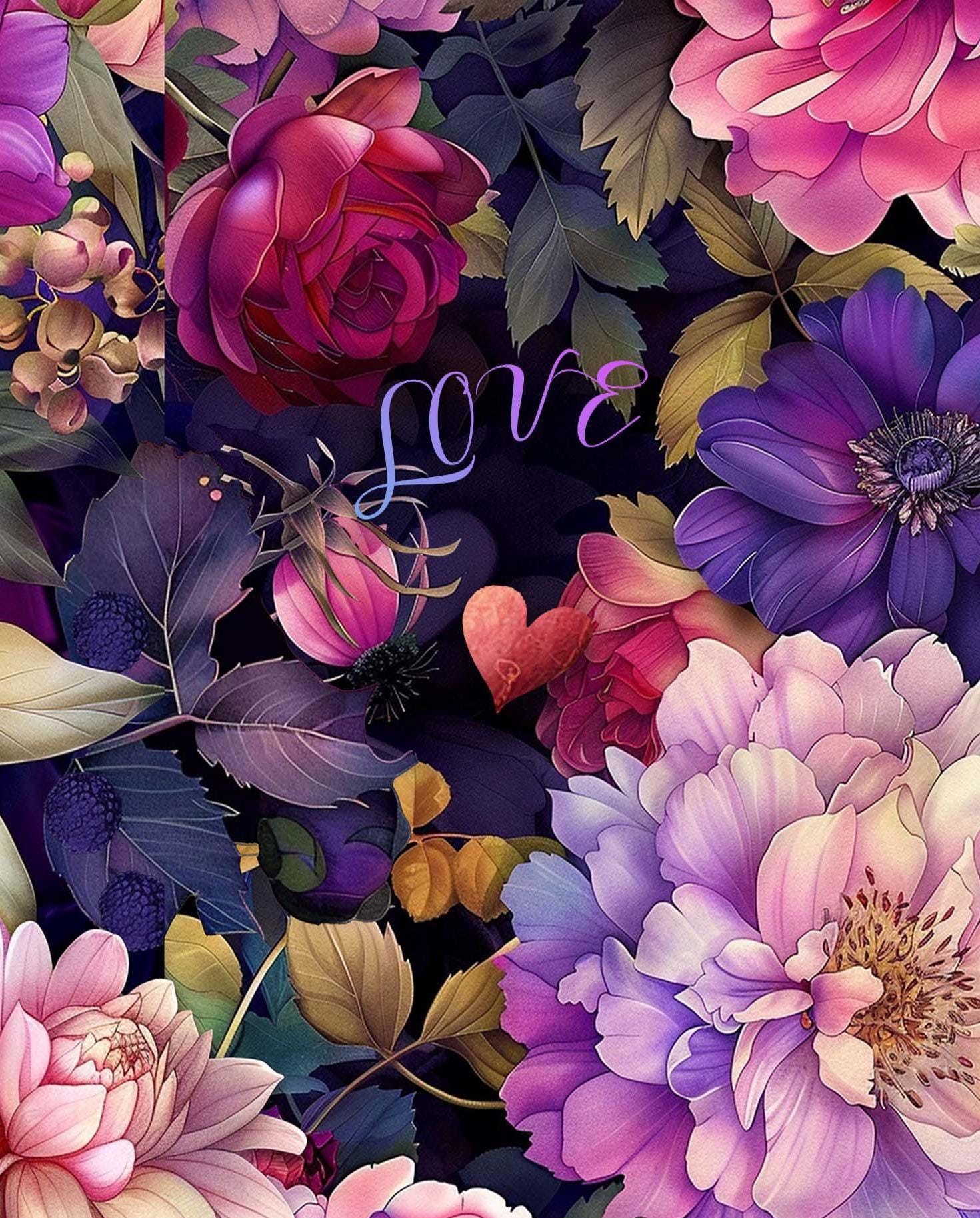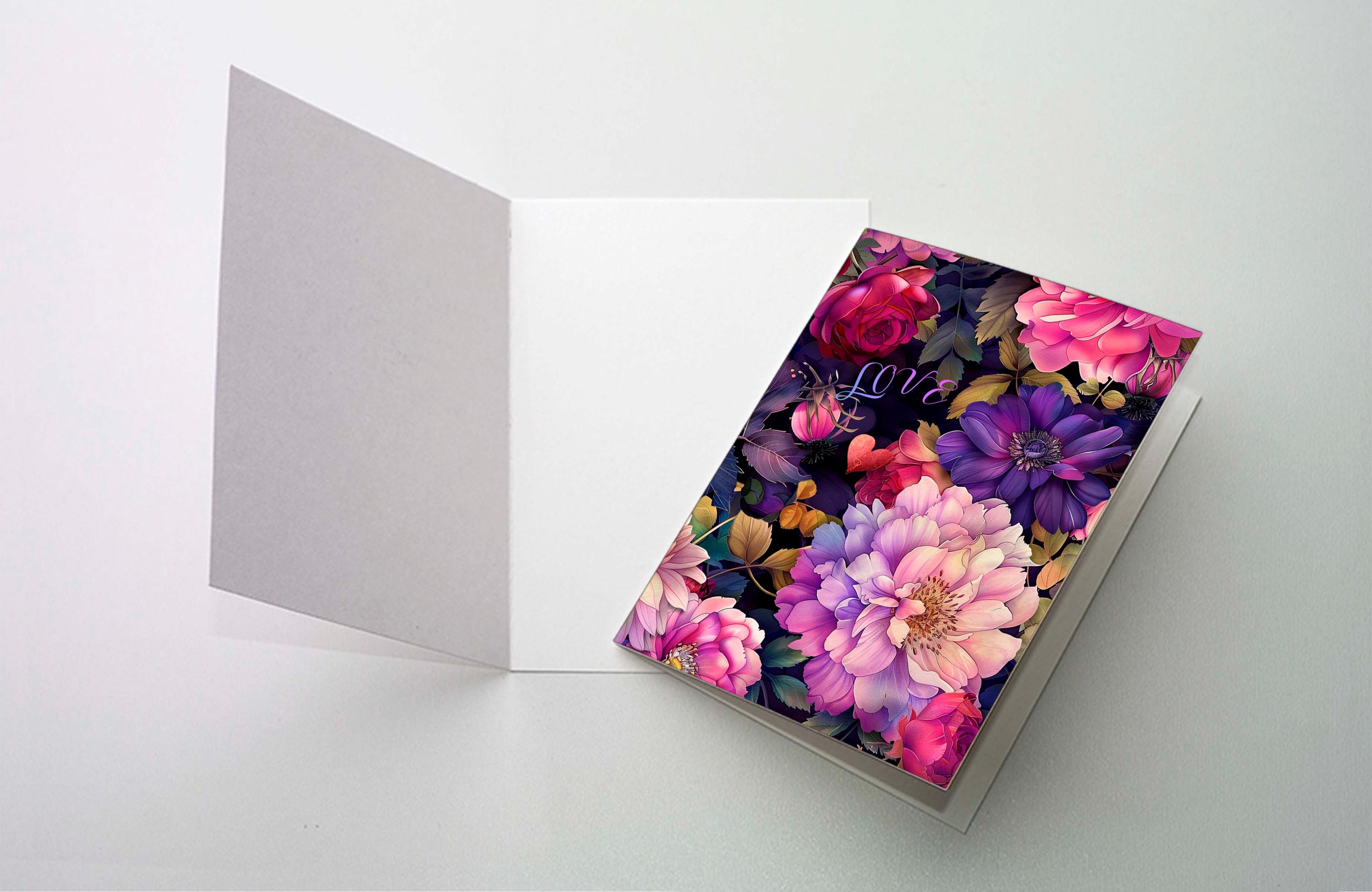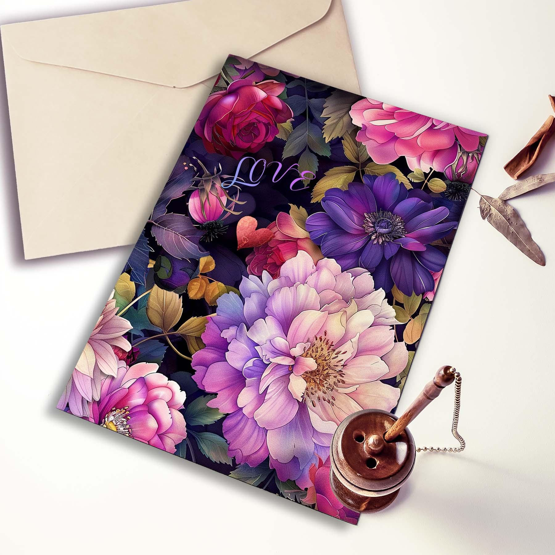 This card features a lush collage of romantic blooms in rich shades of pink, violet, plum, and soft lavender, layered against a deep moody background. Peonies, roses, dahlias, and berry accents create a dramatic floral composition, while the delicate word โloveโ tucked among the petals adds a sweet, heartfelt touch. Elegant, vibrant, and full of warmth, this design makes a beautiful card for love, anniversaries, Valentineโs Day, or simply letting someone know they are cherished.