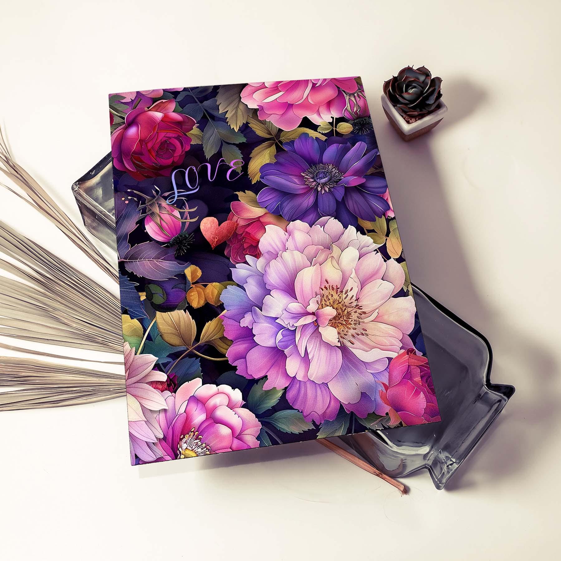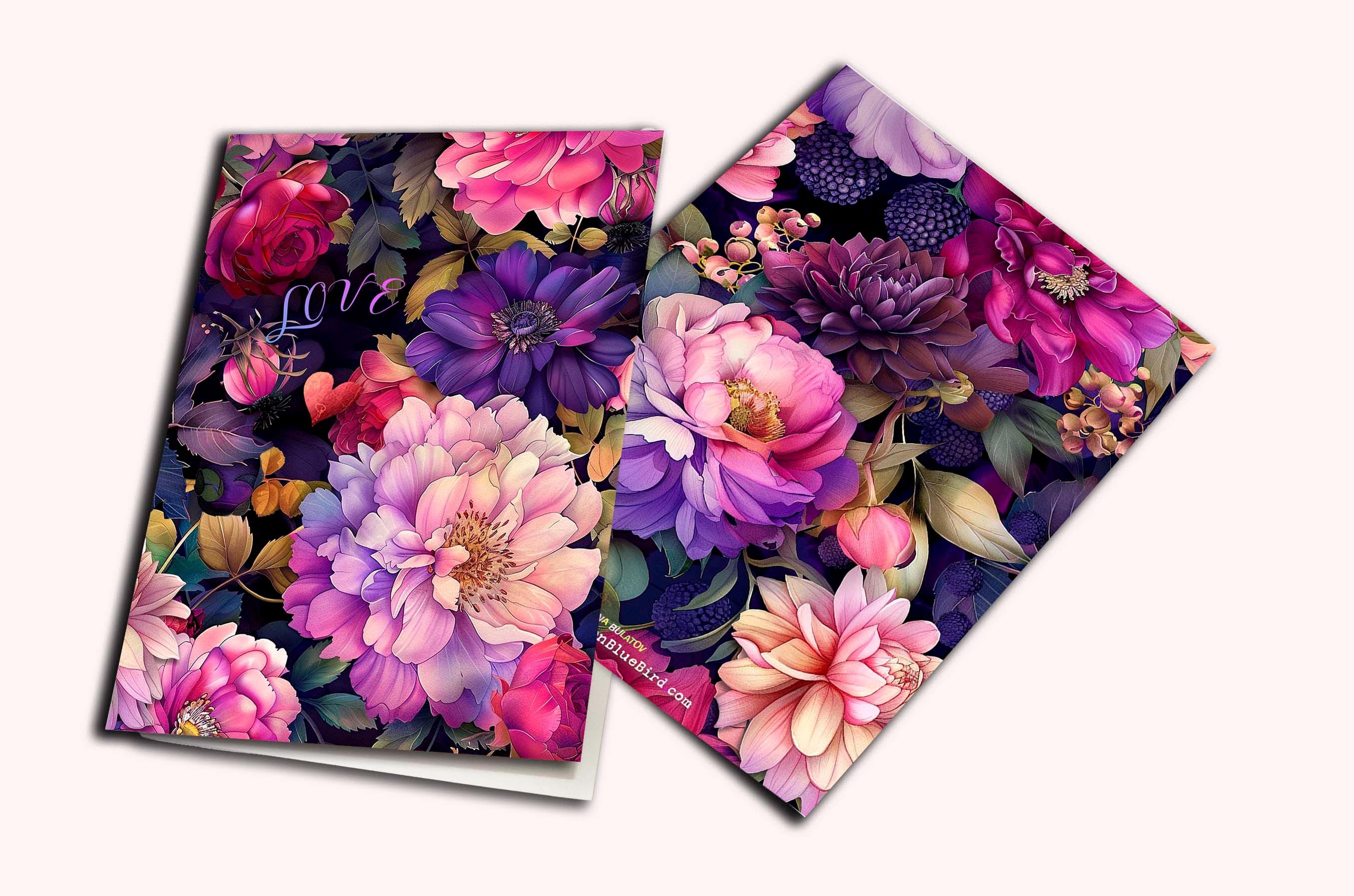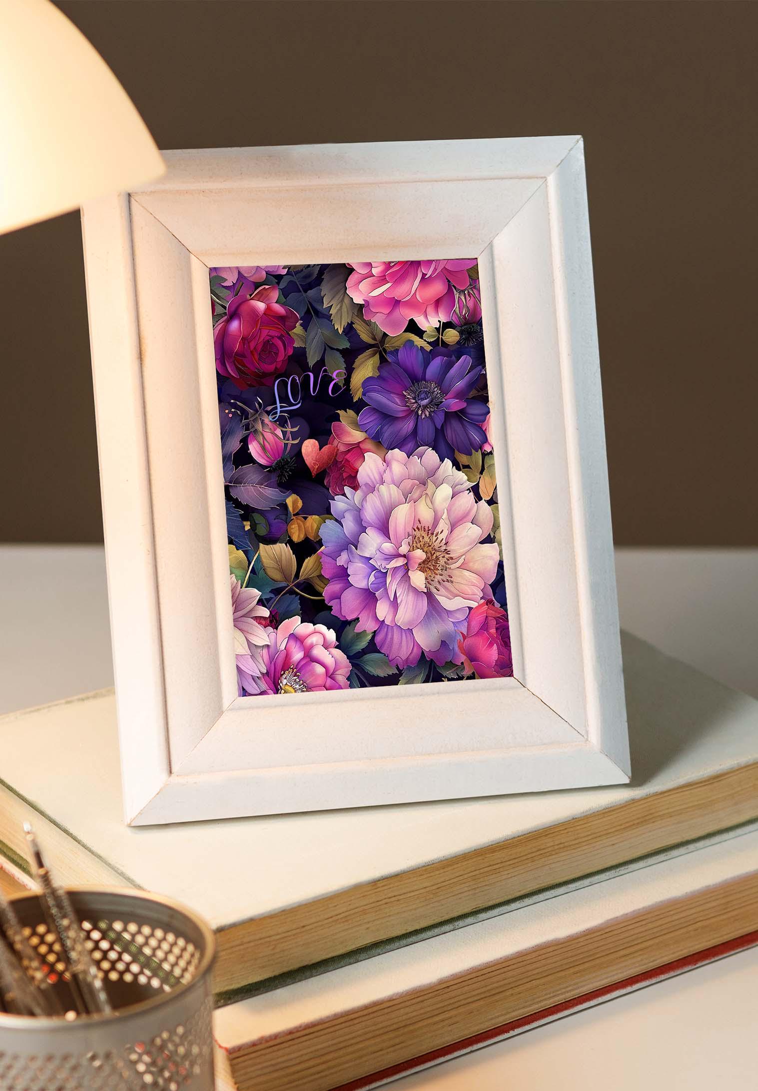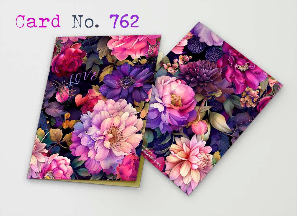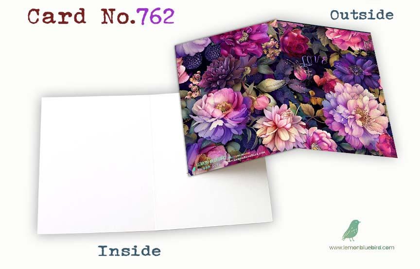 This card features a lush collage of romantic blooms in rich shades of pink, violet, plum, and soft lavender, layered against a deep moody background. Peonies, roses, dahlias, and berry accents create a dramatic floral composition, while the delicate word โloveโ tucked among the petals adds a sweet, heartfelt touch. Elegant, vibrant, and full of warmth, this design makes a beautiful card for love, anniversaries, Valentineโs Day, or simply letting someone know they are cherished.